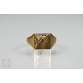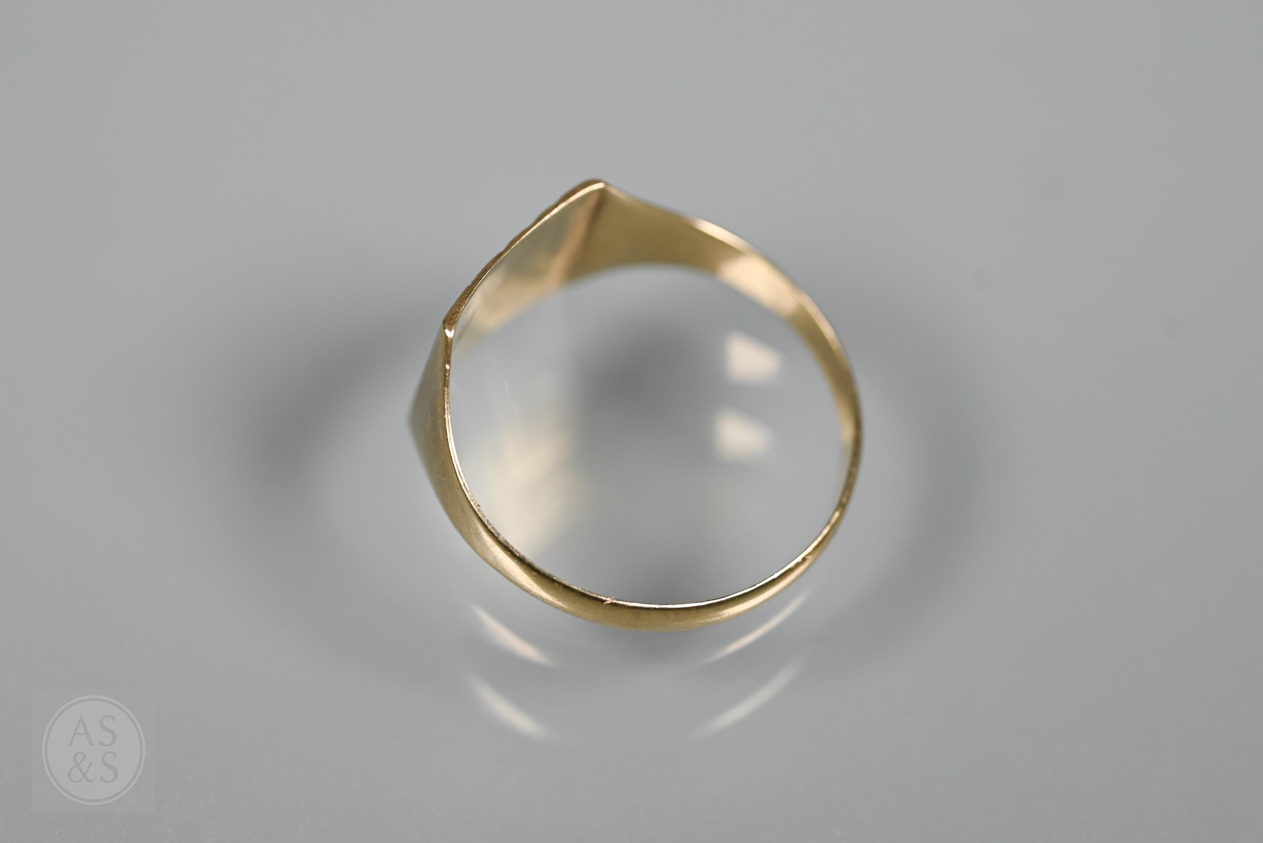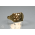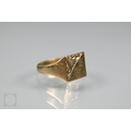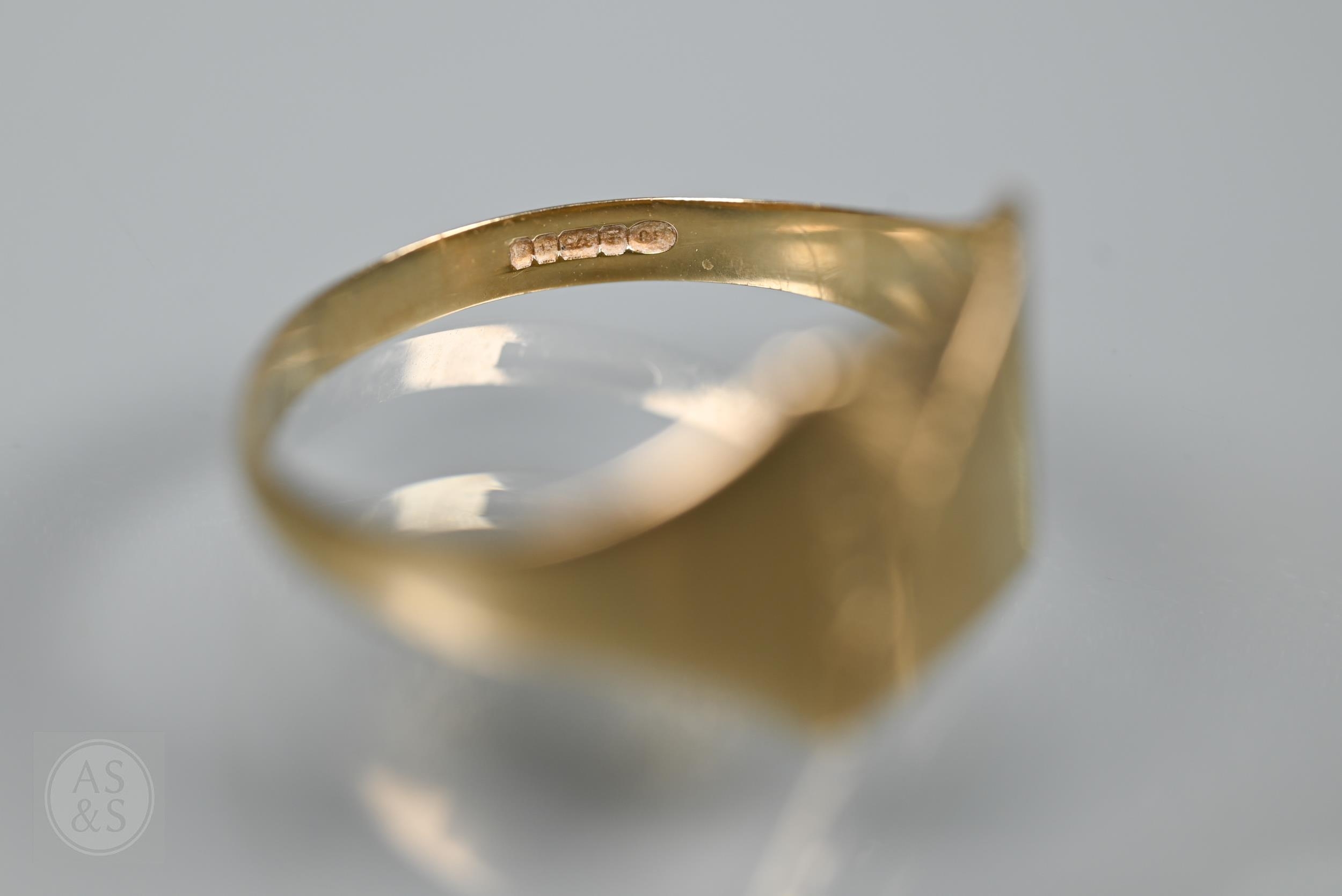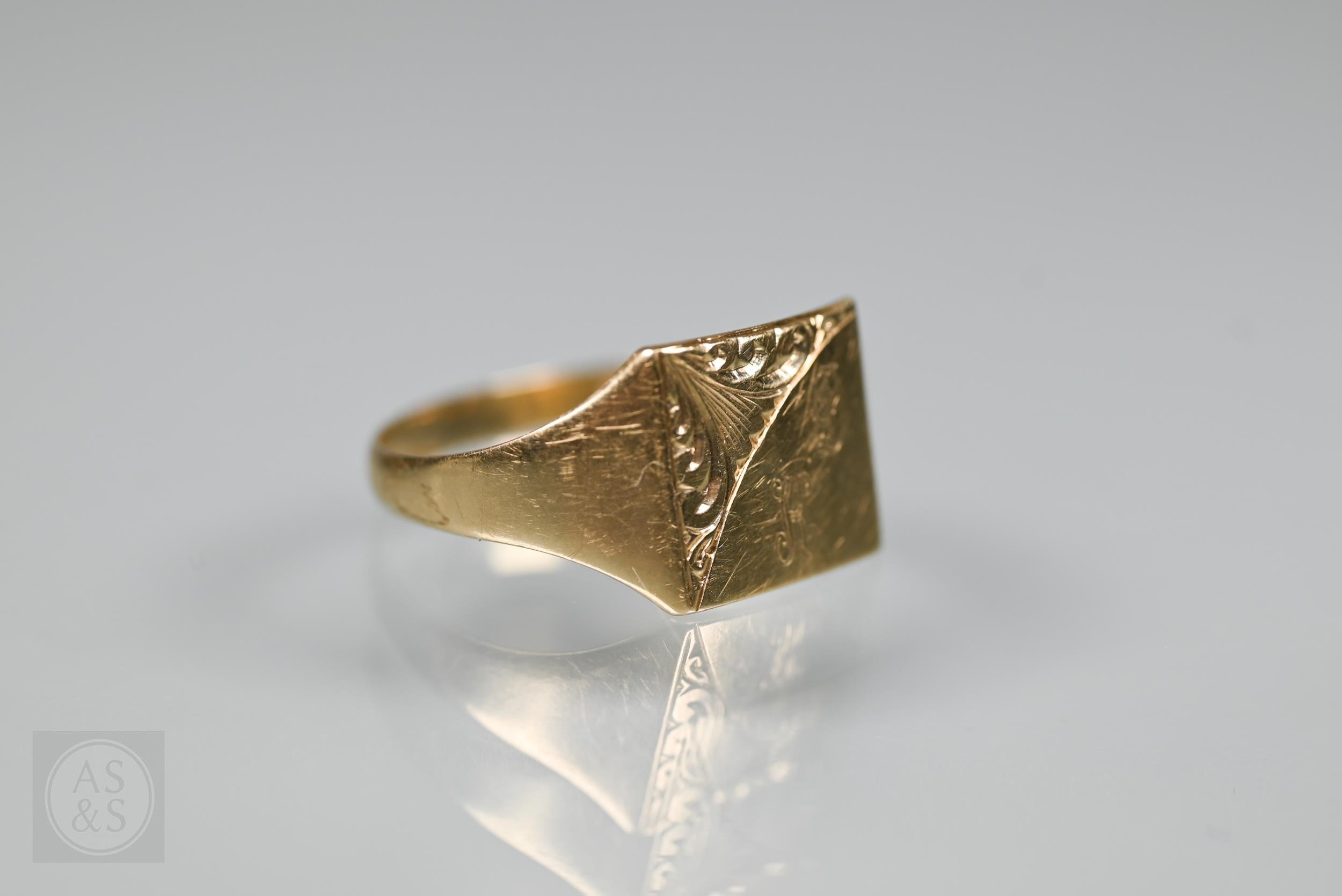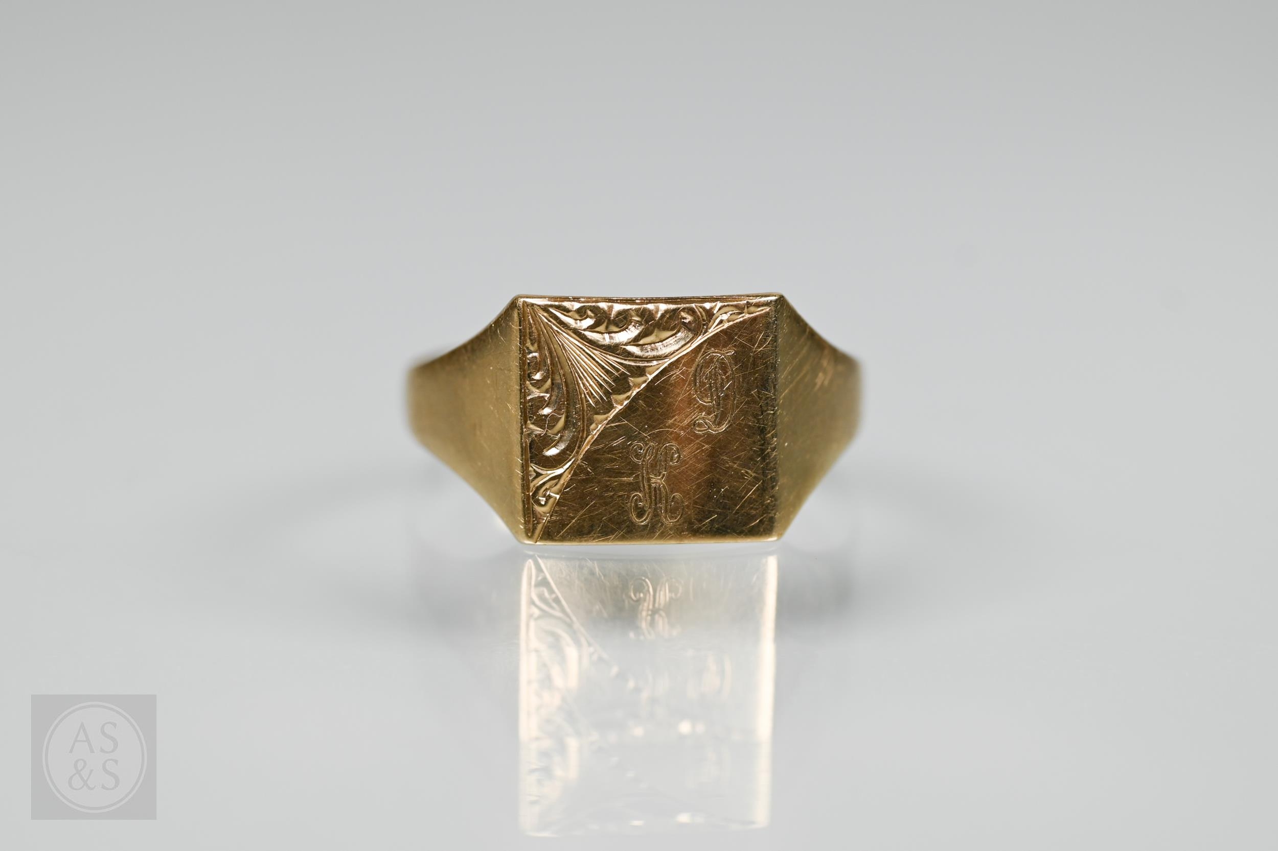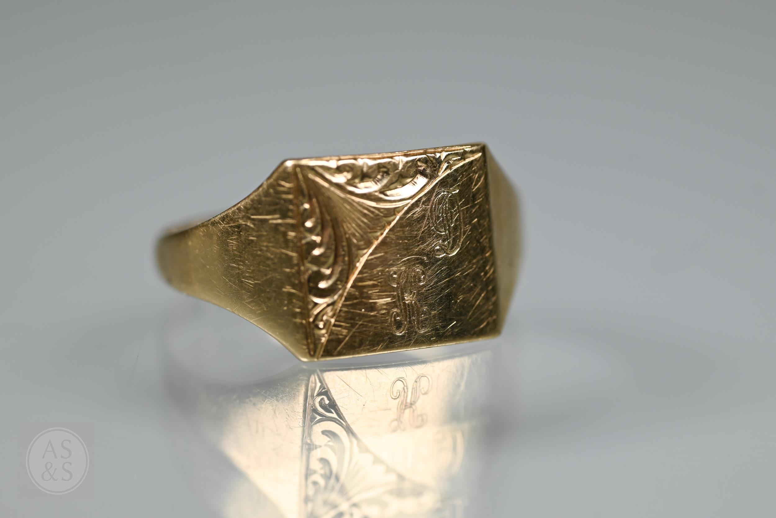 A 9ct yellow gold signet ring with rectangular face with foliate engraved corner and engraved initials KD, size S 1/2, approx 1.7g