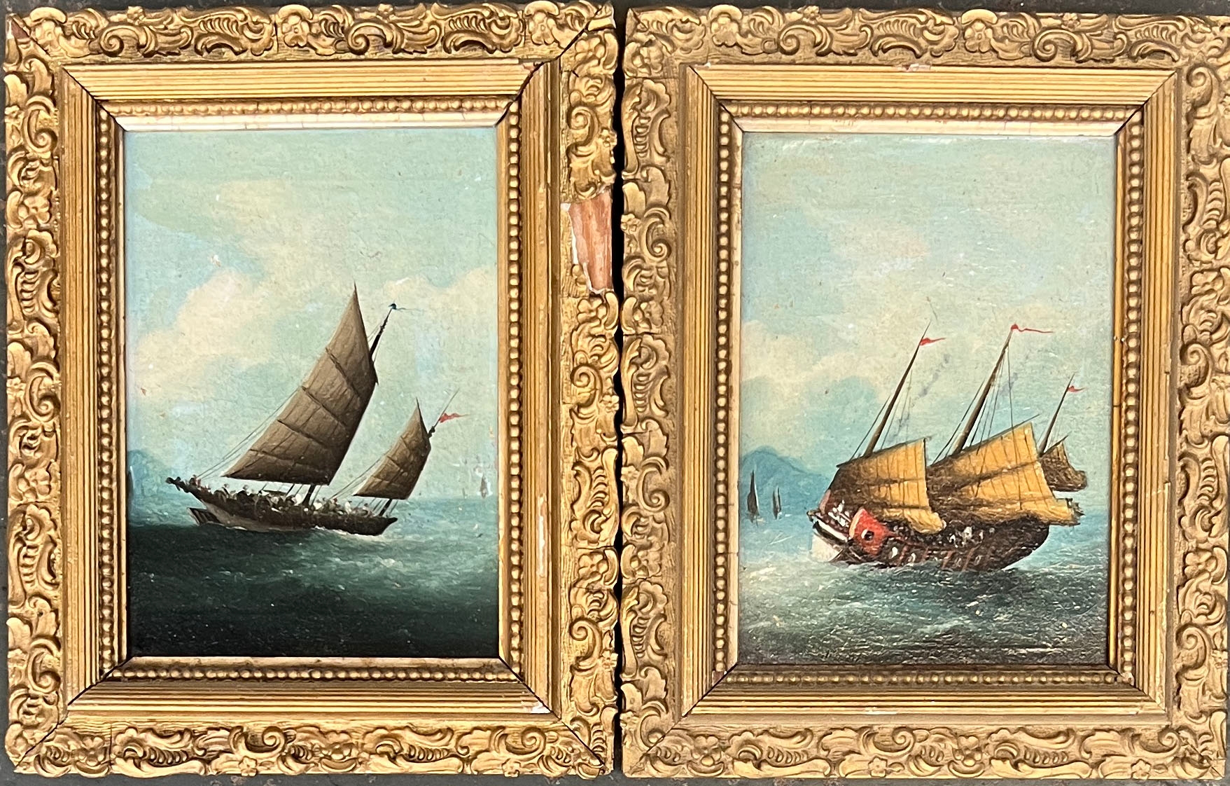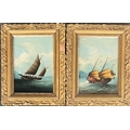 A pair of naive oil on board paintings of tall ships at sea, 16.5x11.5cm