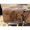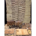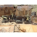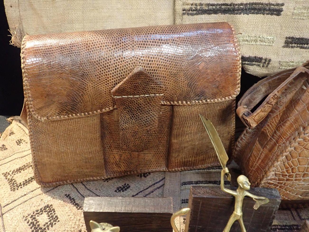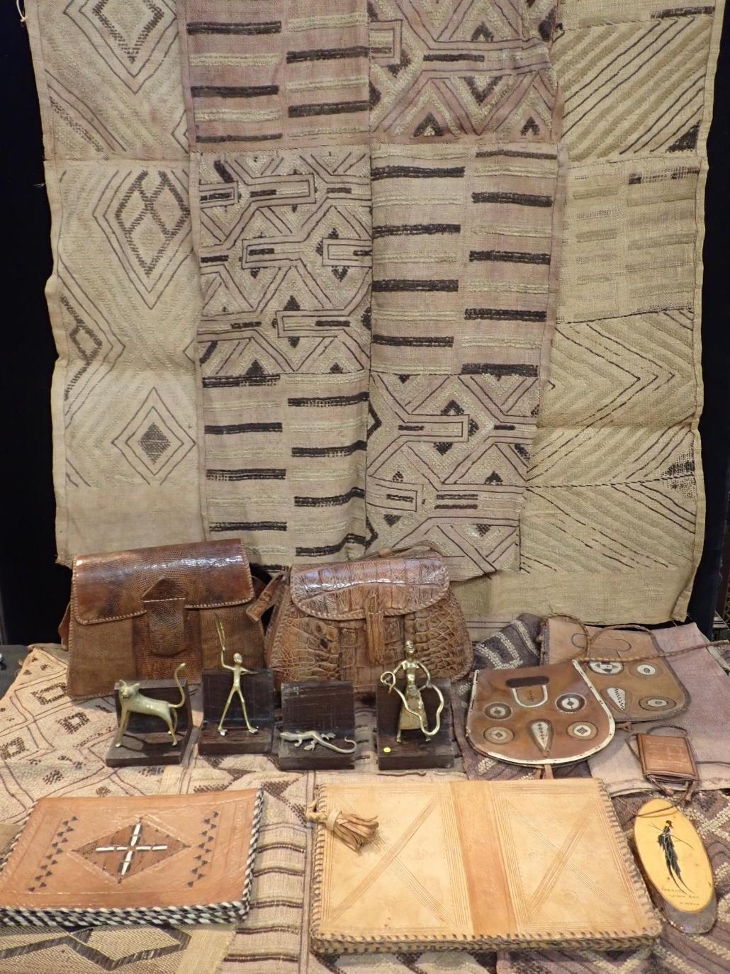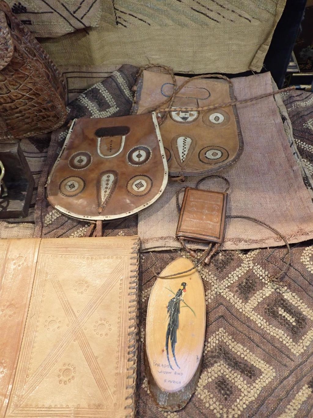 on hardwood stand, 16cm high, three similar brass figures of a man, a hyena and a lizard respectively, also with stands, two African crocodile leather handbags, five other African leather bags/purses, five African woven rush labels and a South African painted wooden panel (20)