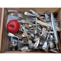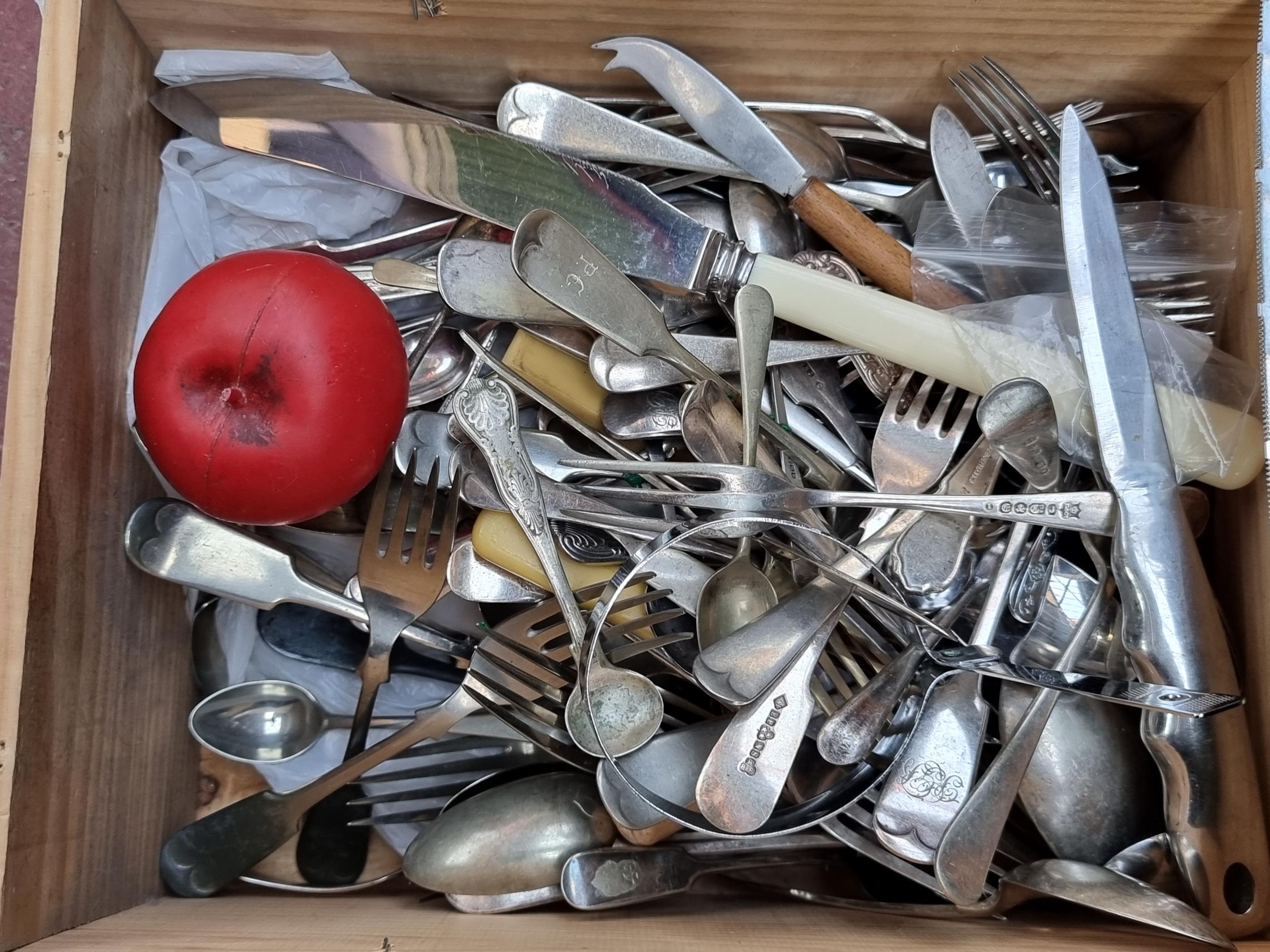 A wooden crate containing a large variety of vintage cutlery unchecked.