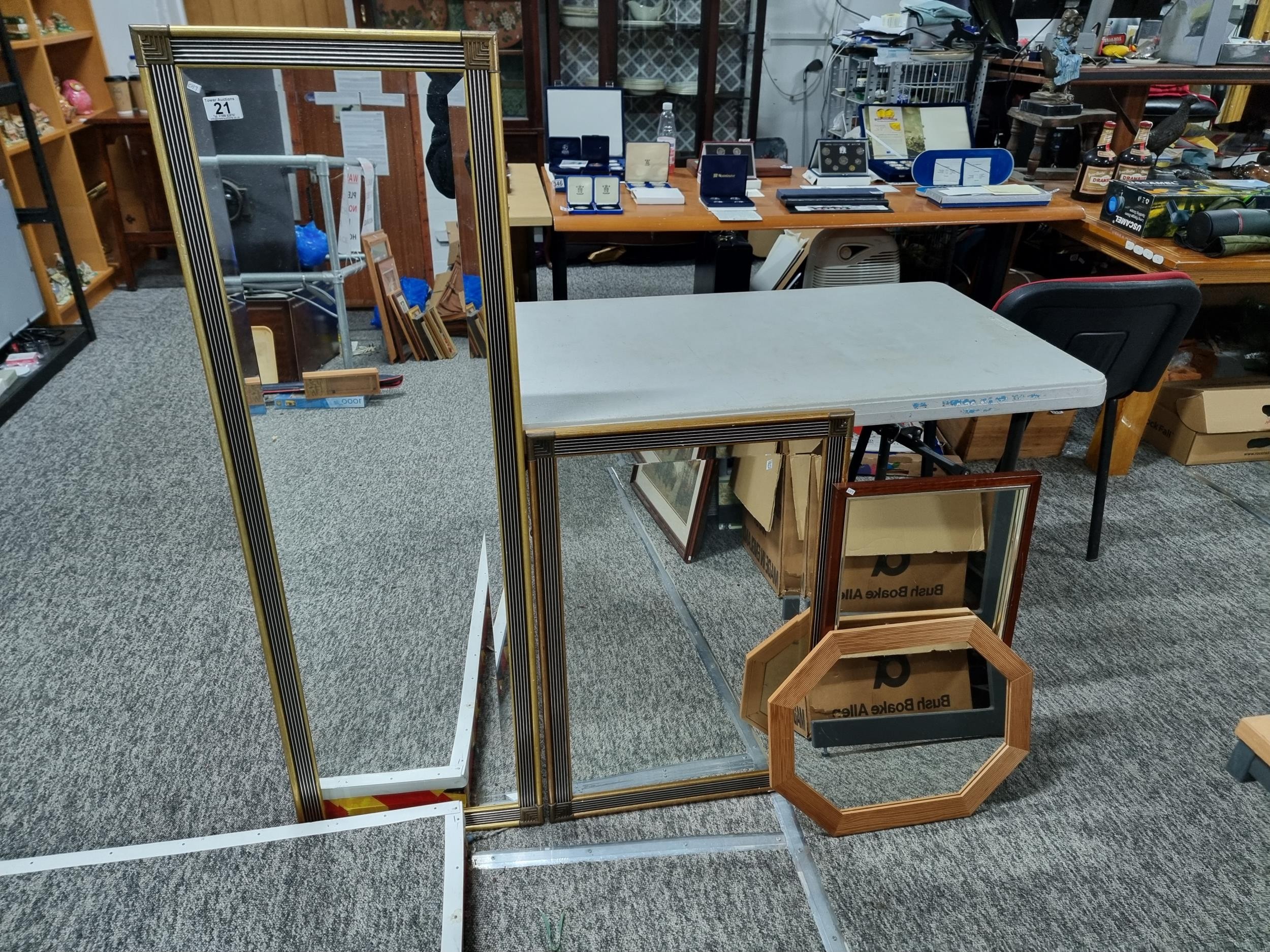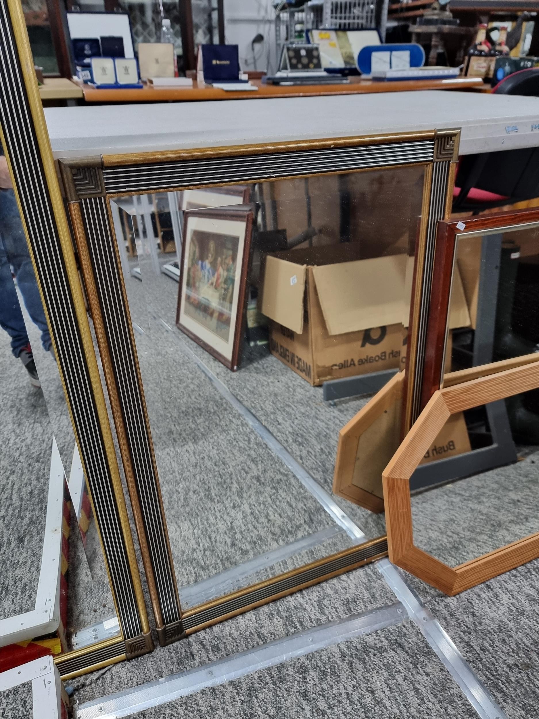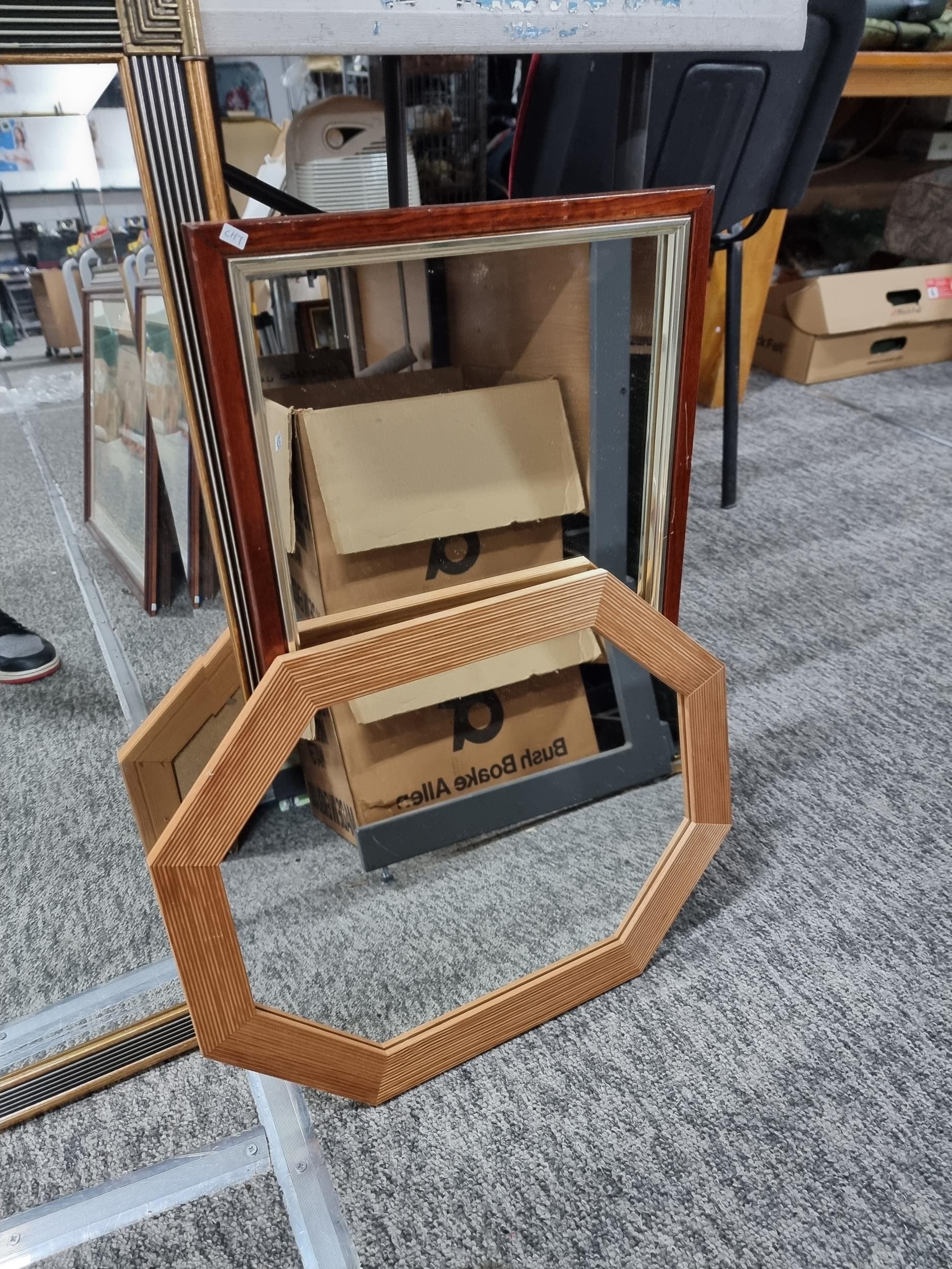 Collection of 4x framed and glazed mirrors inc 2x art deco gilt framed bevel edged mirror, a mahogany framed mirror and an octagonal pine framed mirror, largest mirror measures 125cm long by 40cm wide