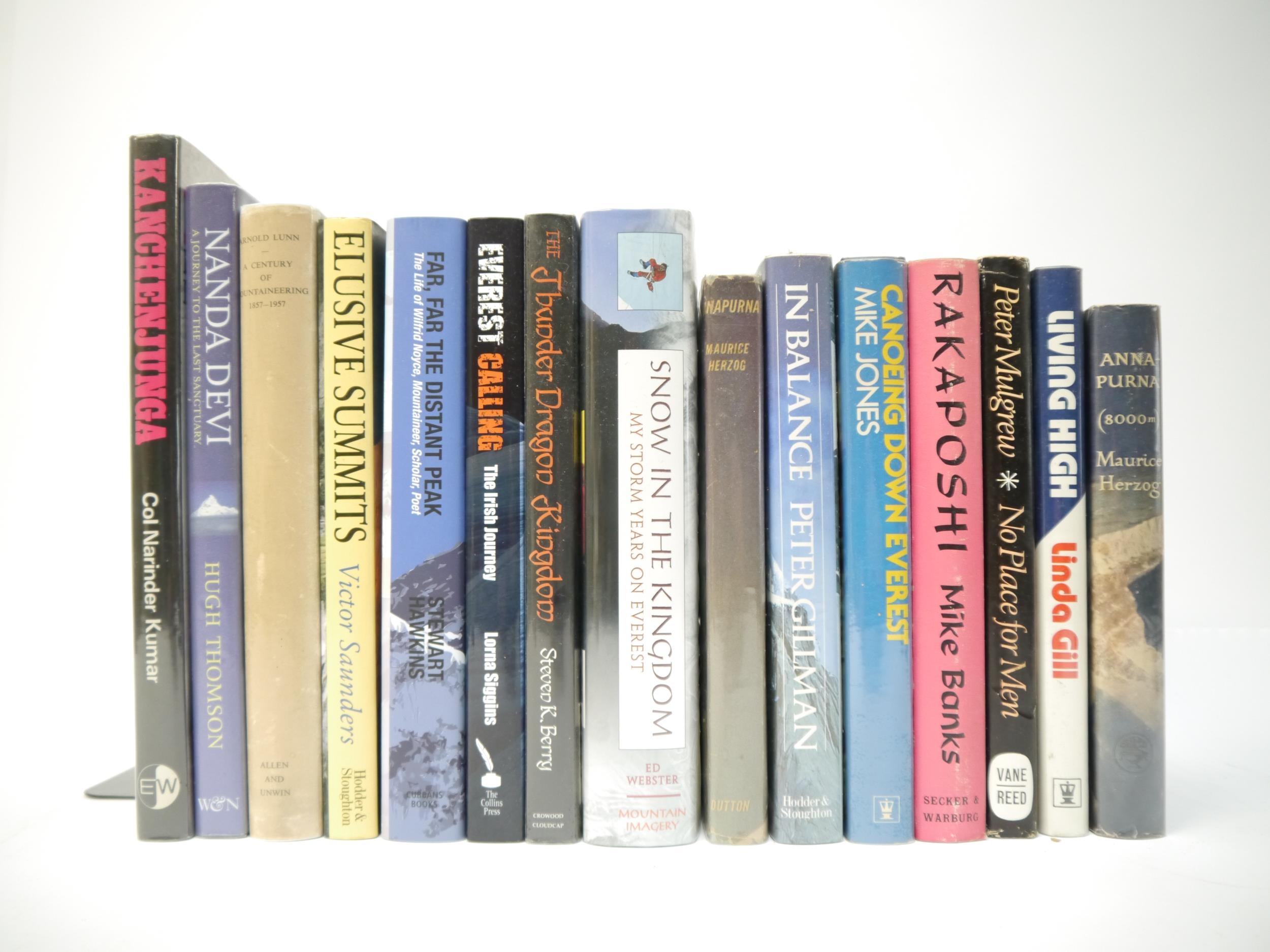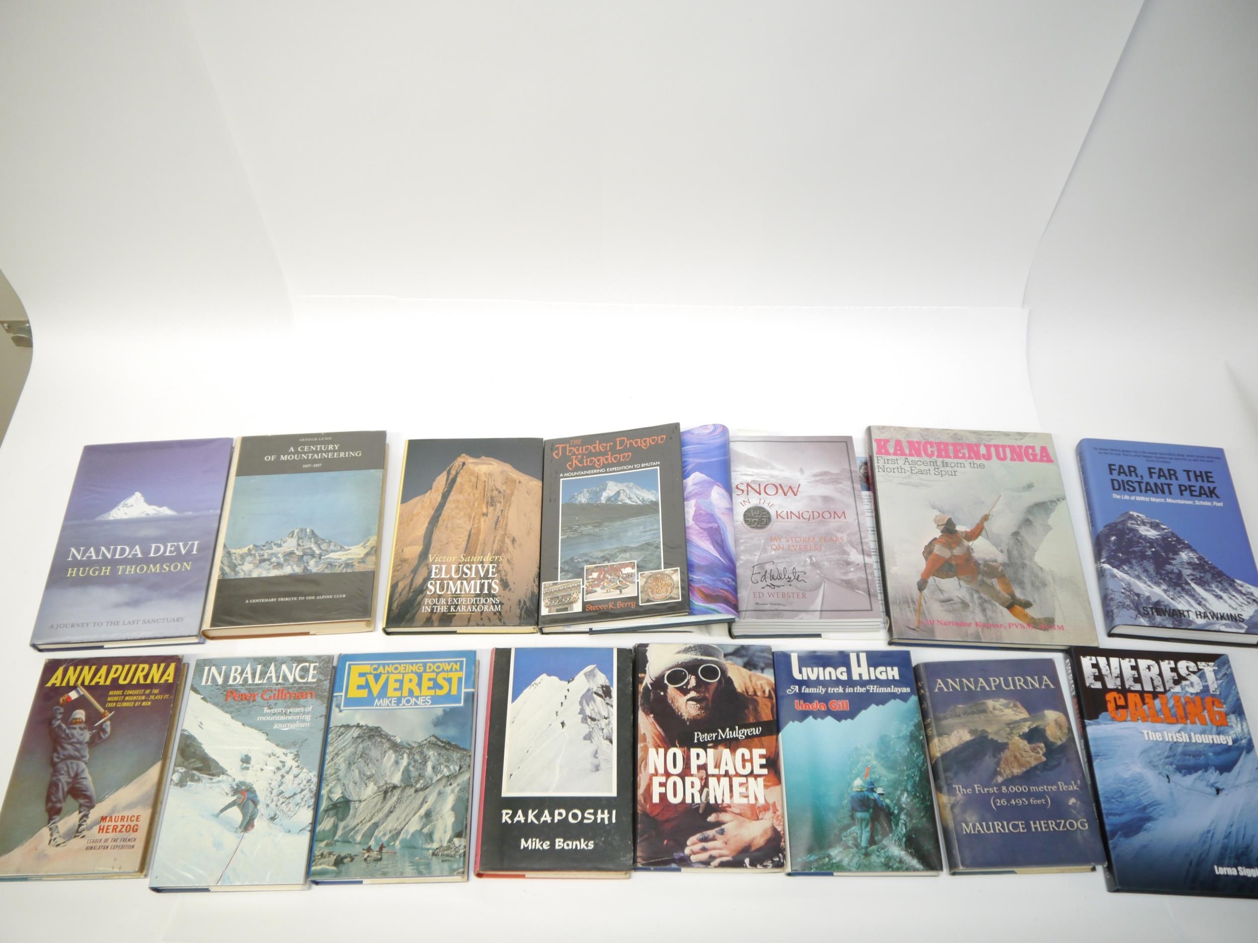 Fifteen assorted mountaineering titles, including Ed Webster: 'Snow in the Kingdom, My Storm Years on Everest', Eldorado Springs CO, Mountain Imagery, 2000, 1st edition, signed to title page, original cloth, dust wrapper; Col. Narinder Kumar: 'Kanchenjunga. First Ascent from the North-East Spur', 1978, 1st edition, original cloth, dust wrapper; Arnold Lunn: 'A Century of Mountaineering 1857-1957', L, 1957, 1st edition, orig. pictorial cloth gilt, d/w; Hawkins: 'Far, Far the Distant Peak. The Life of Wilfrid Noyce, Mountaineer, Scholar, Poet', 2014, 1st edition, orig. cloth, d/w; Berry: 'The Thunder Dragon Kingdom. A Mountaineering Expedition to Bhutan', Crowood Press, 1988, 1st edition, orig. cloth, d/w; plus others Nanda Devi, Annapurna, Everest, Rakaposhi etc (15)