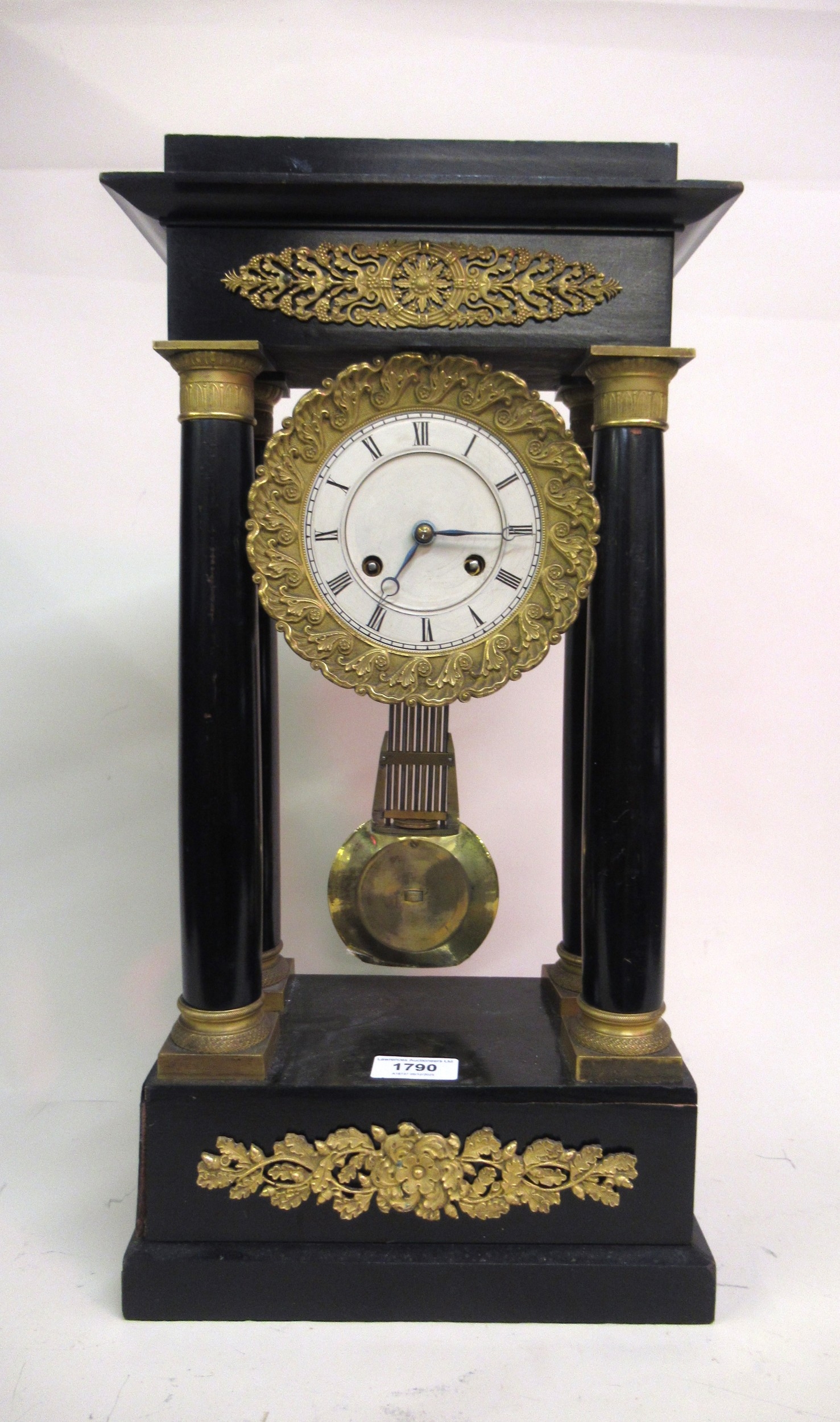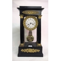 19th Century French ebonised and ormolu mounted portico clock, the circular painted dial with Roman numerals and two train movement with outside count wheel striking on a bell, signed to the back plate Gille A Paris, 25cm wide x 14cm deep x 50cm high, including pendulum and key