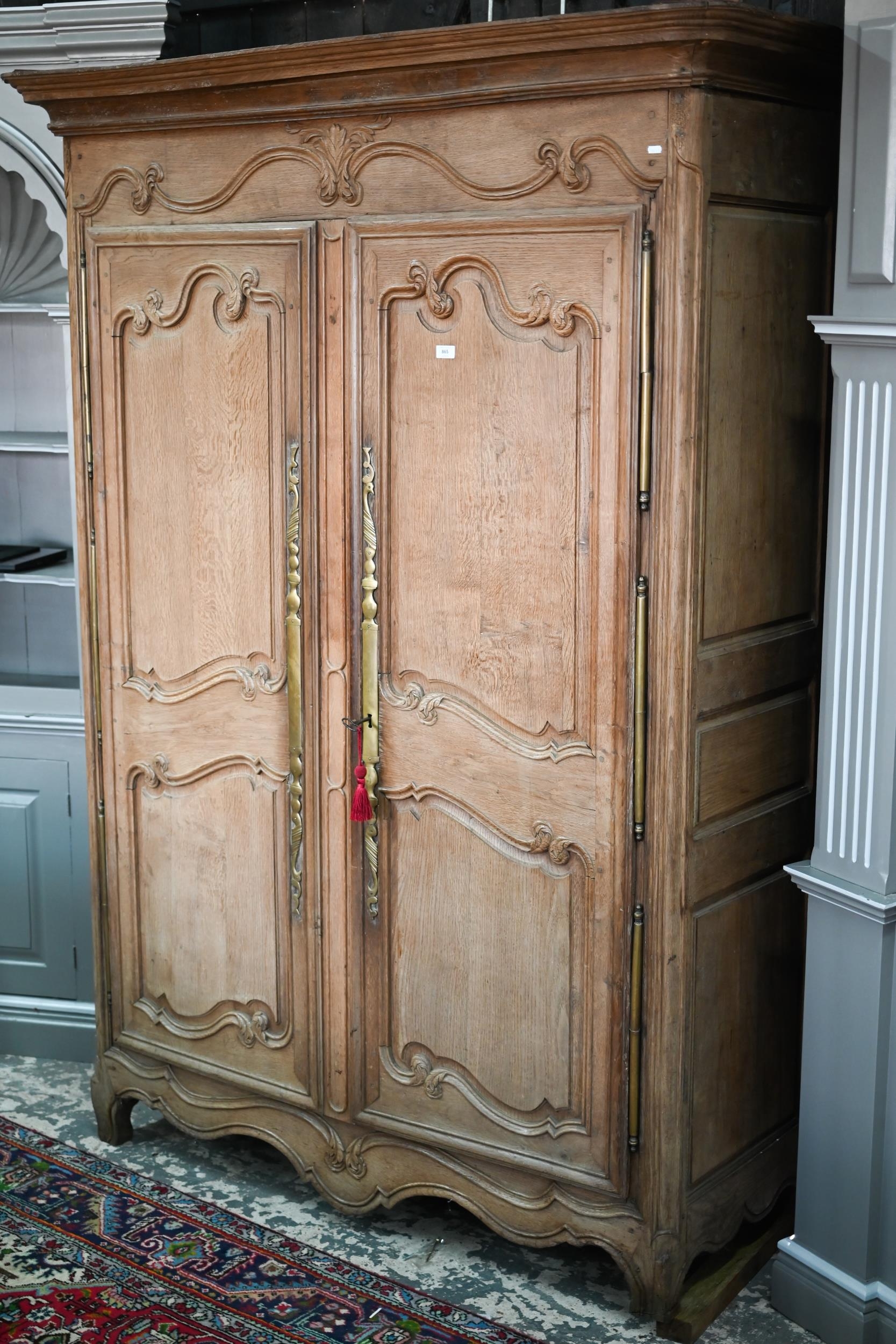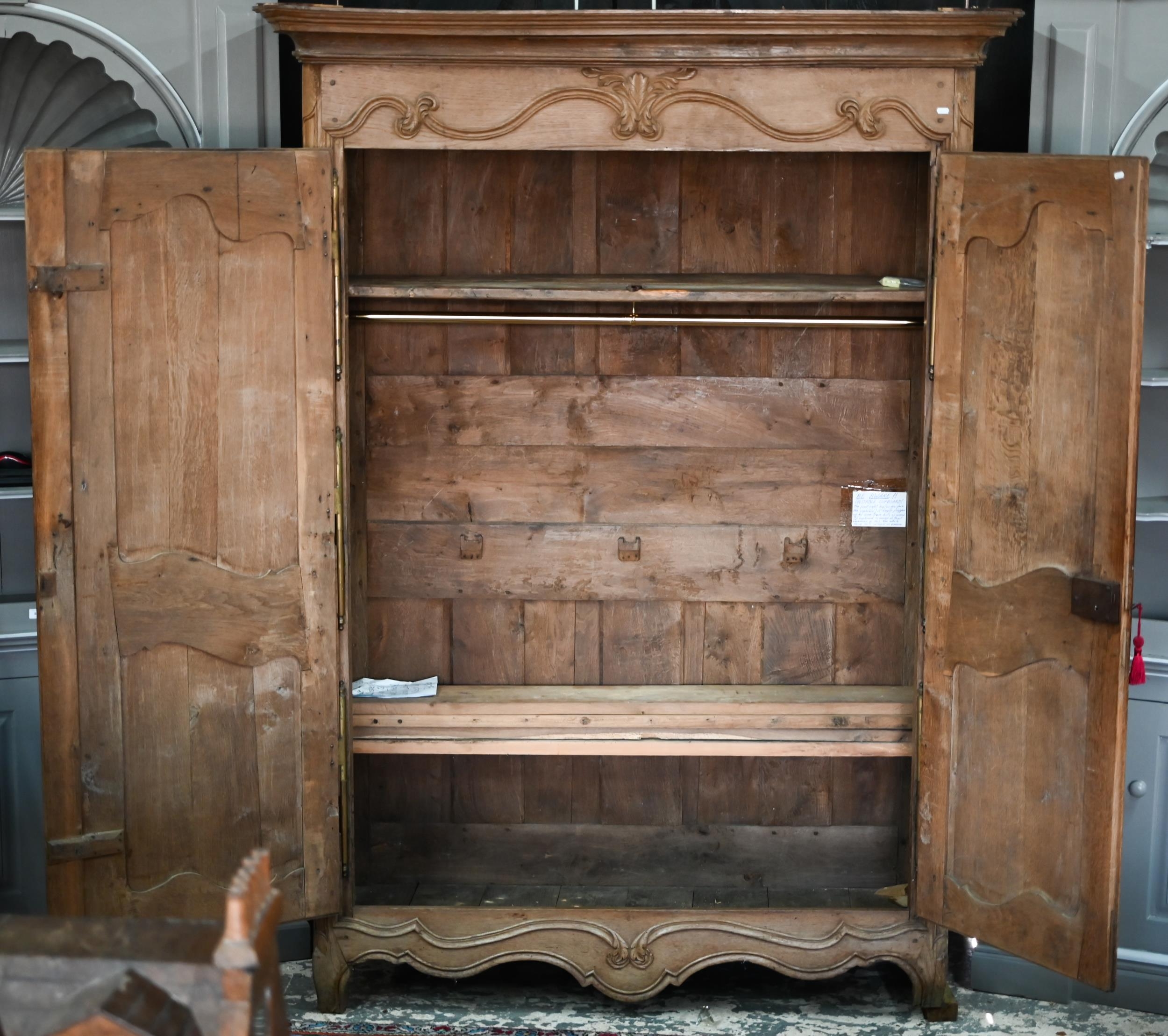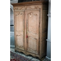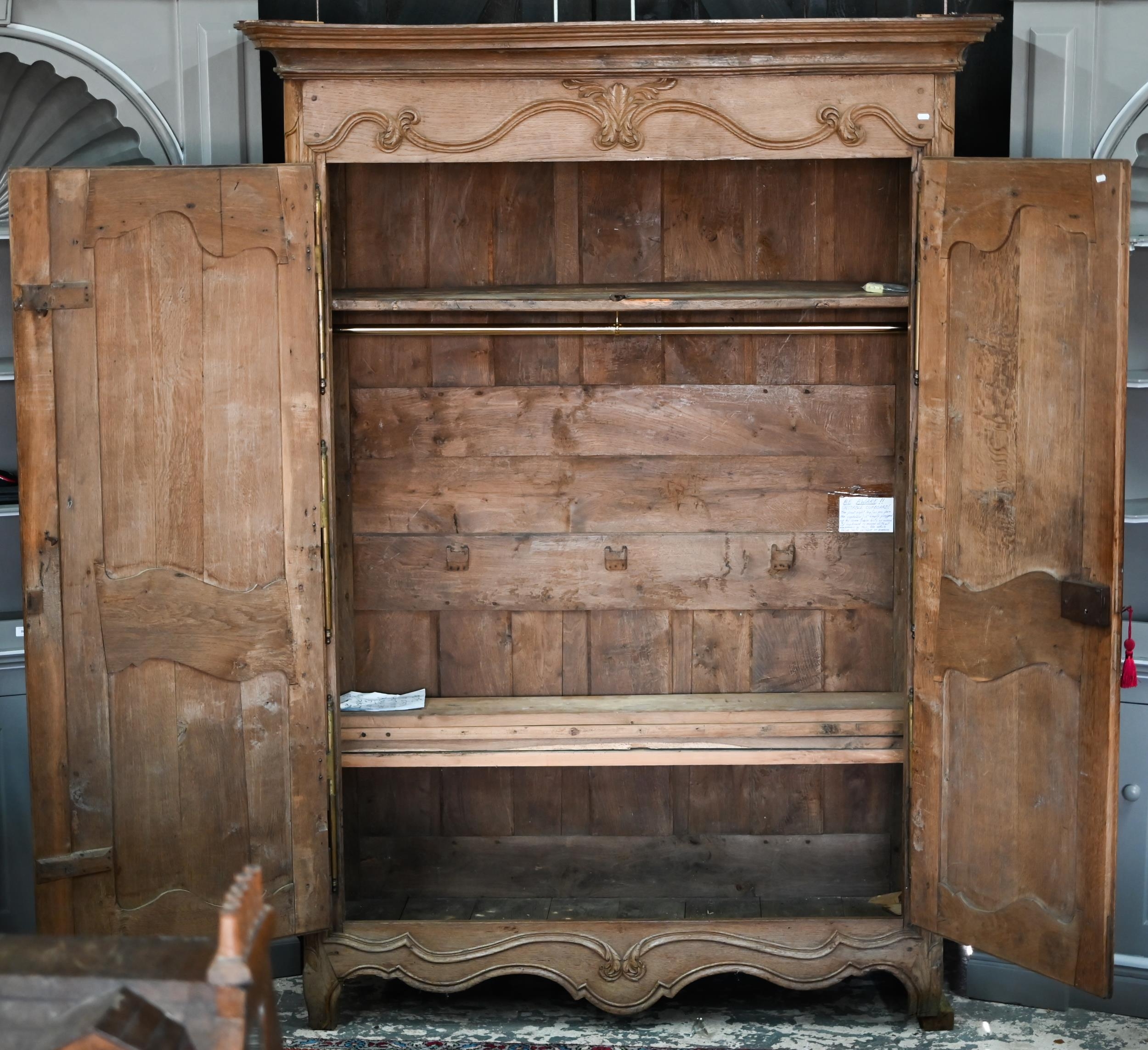 An 18th/19th century French bleached oak armoire, the moulded cornice over a pair of moulded panelled doors with brass lock plates, over a wavy apron and feet, the interior with shelf and later hanging rail, 122 cm w x 55 cm d x 160 cm h does not dissemble a/f right side feet propped to level