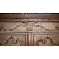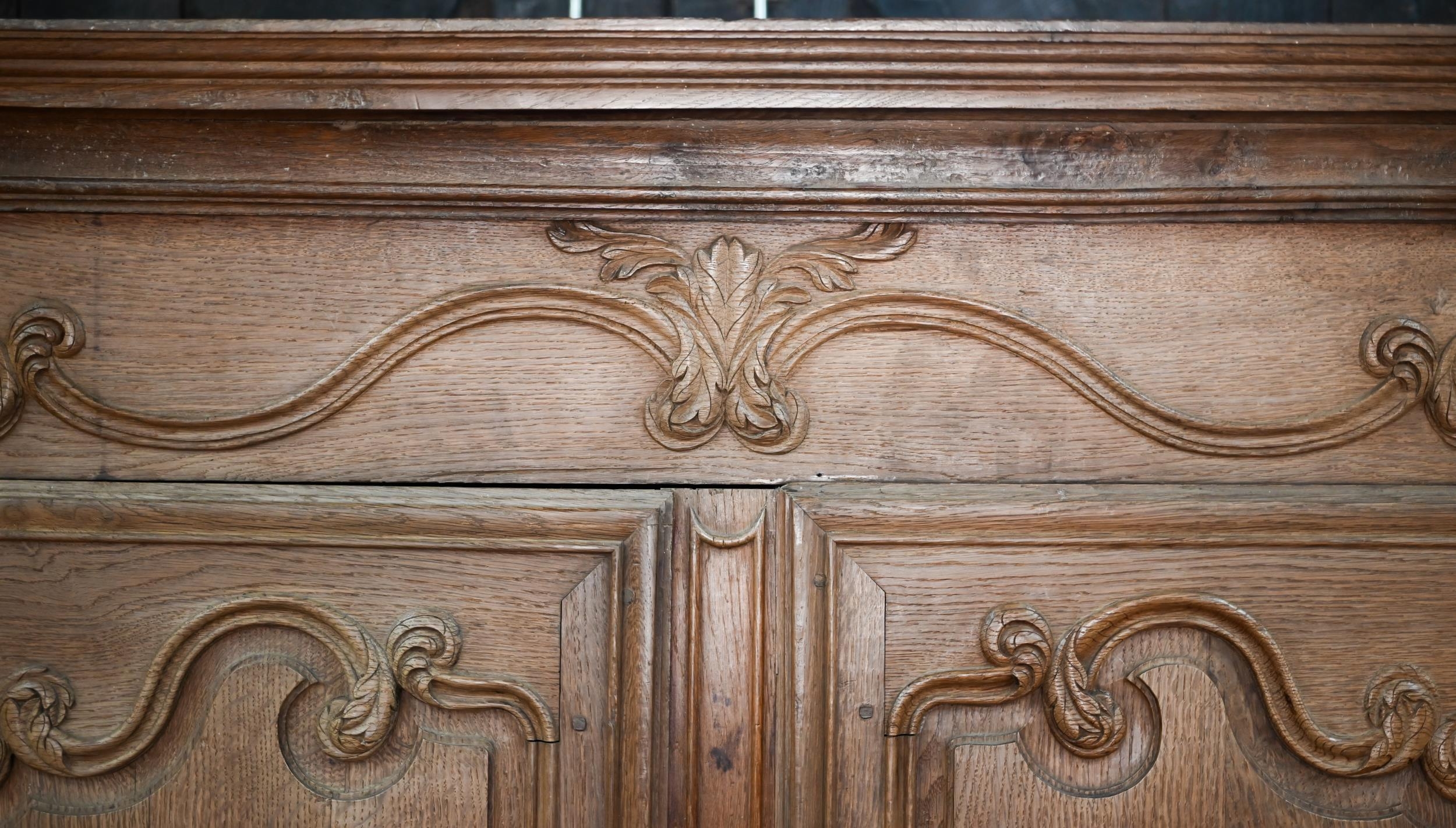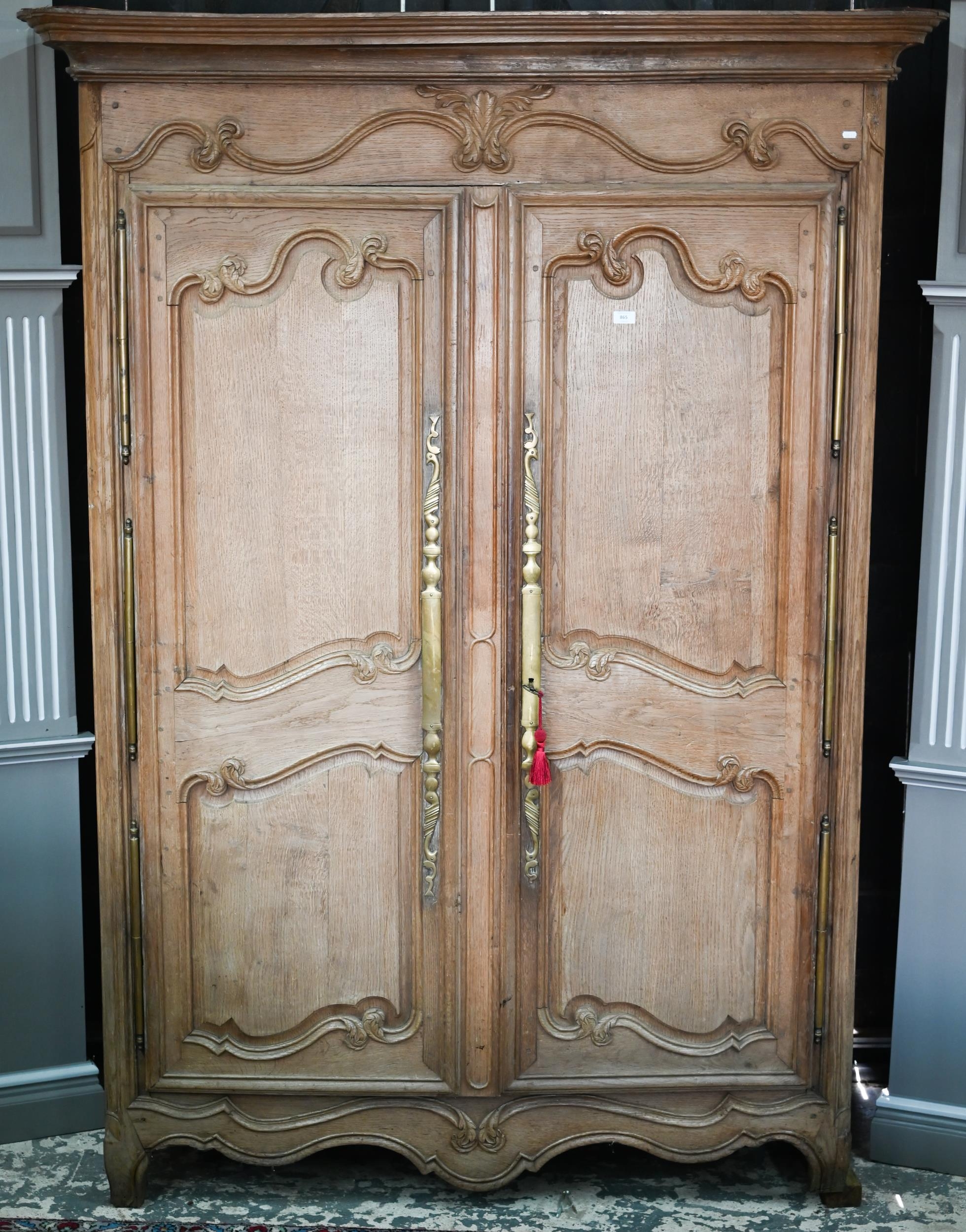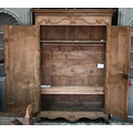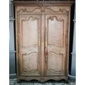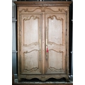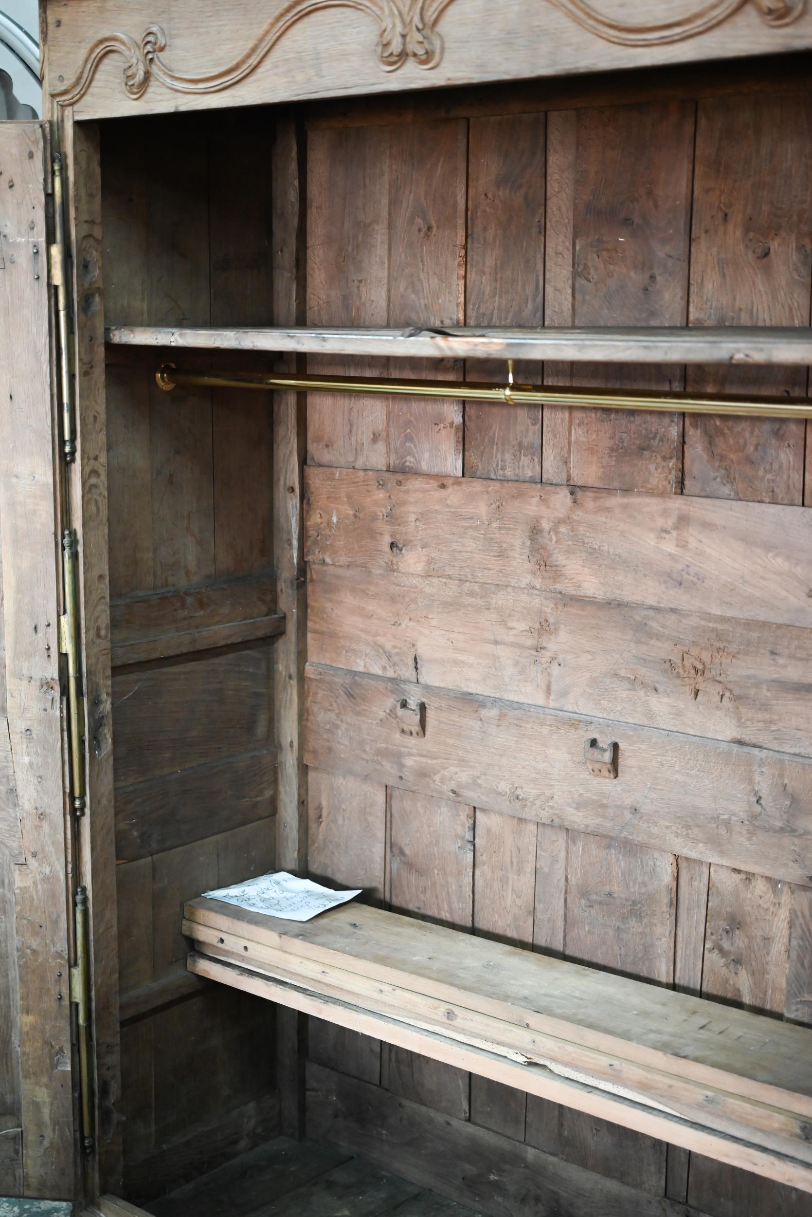 An 18th/19th century French bleached oak armoire, the moulded cornice over a pair of moulded panelled doors with brass lock plates, over a wavy apron and feet, the interior with shelf and later hanging rail, 122 cm w x 55 cm d x 160 cm h does not dissemble a/f right side feet propped to level