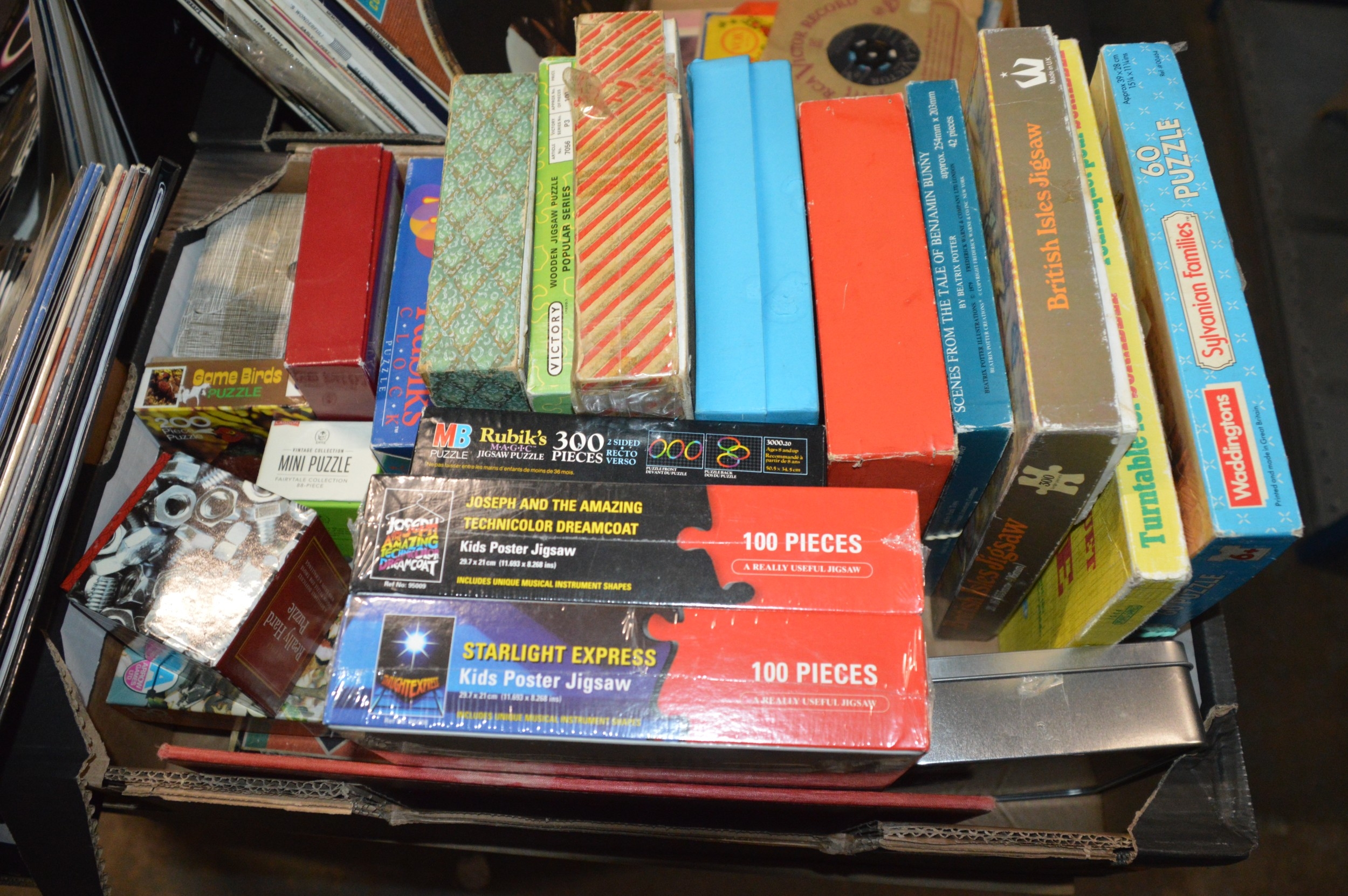 box of assorted puzzles