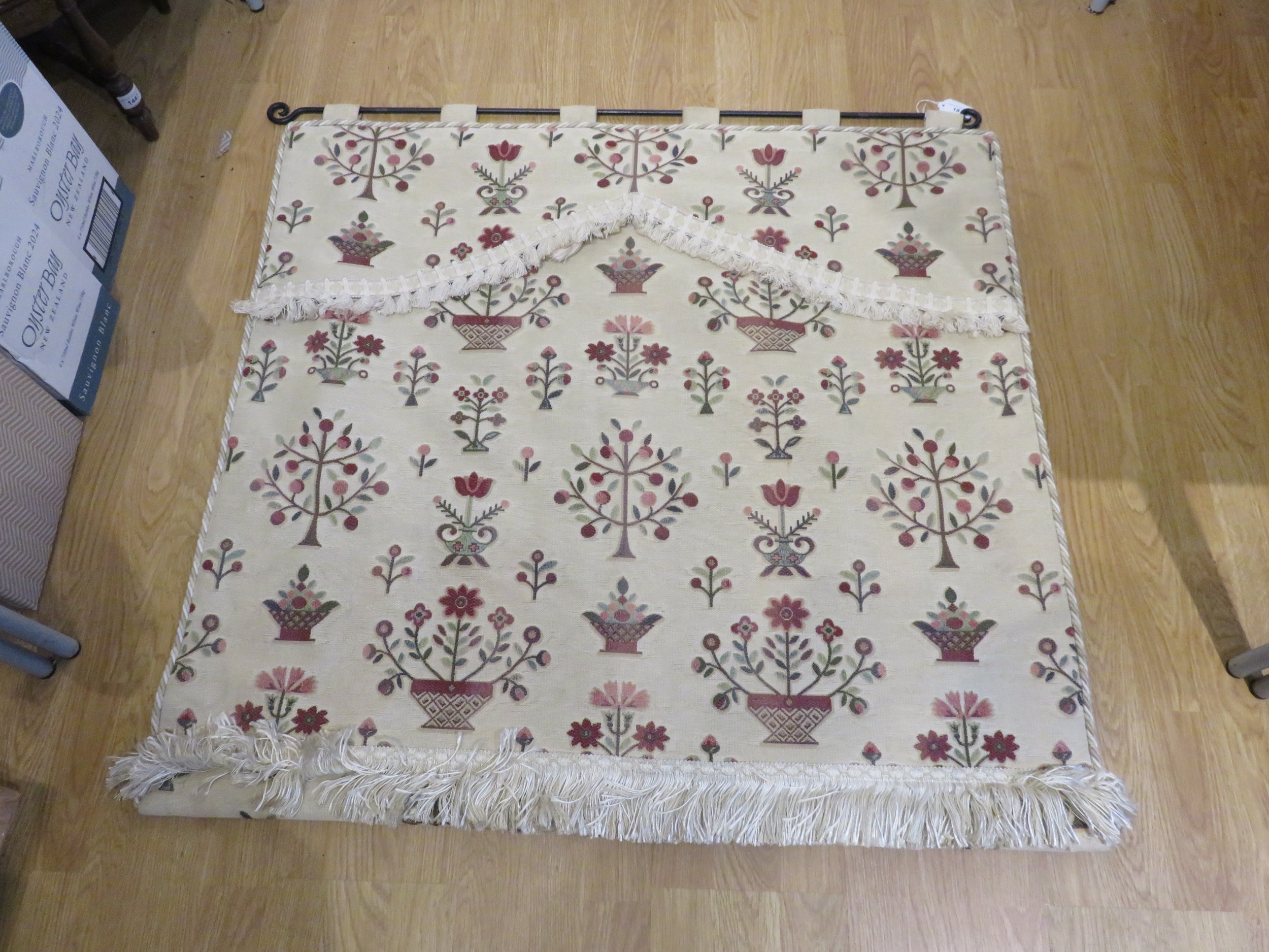 Pair of machine tapestry window lines with wrought iron poles, 99 x 92cm