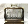 An oak and silver plated three glass decanter tantalus ,37cm wide 35cm tall. This lot cannot be posted