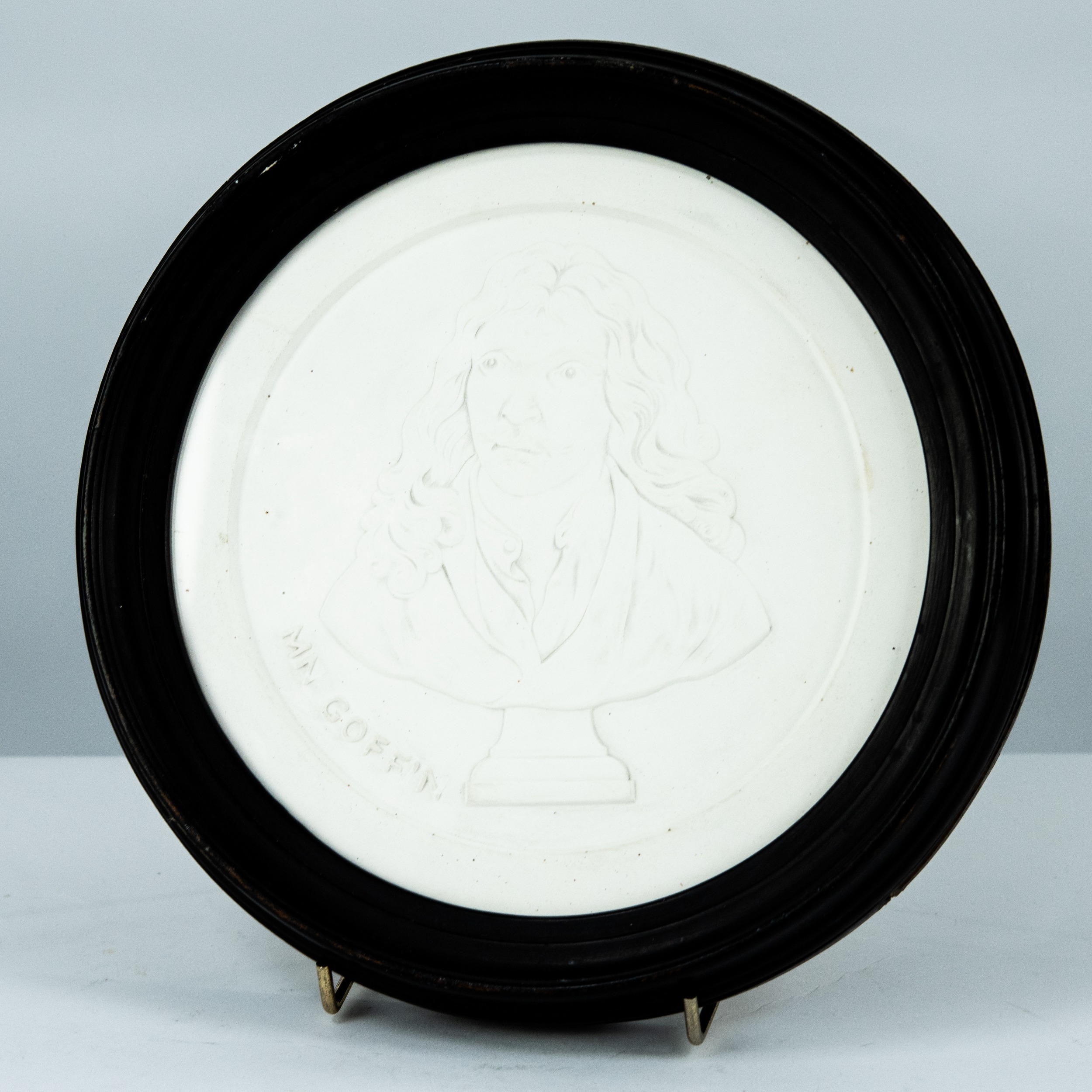 MOULDED WHITE PLASTER PORTRAIT ROUNDEL OF W M GOFFIN, in a glazed and moulded ebonised wood frame, 9 ½” (24.1cm) diameter, bears label verso for The Rowley Gallery Ltd, London, the roundel with losses to the lettering