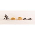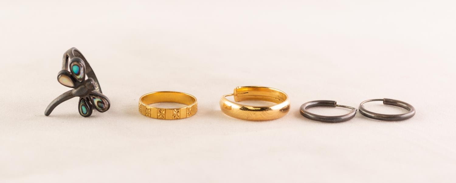 22ct GOLD WEDDING RING, 2.9 gms; a single 18ct GOLD EARRING, 2.1 gms; a white metal and abalone shell set DRAGONFLY RING (one stone replaced) and a pair of white metal EARRINGS (5)