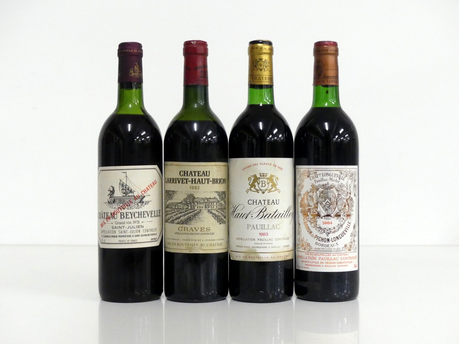 1 bt Ch. Beychevelle 1978 St-Julien us 1 bt Ch. Larrivet-Haut-Brion 1982 Graves lms 1 bt Ch. Haut-Batailley 1983 Pauillac Grand Cru Classé vts, sl stl 1 bt Ch. Pichon Baron 1984 Pauillac Grand Cru Classé vts Above 4 bottles