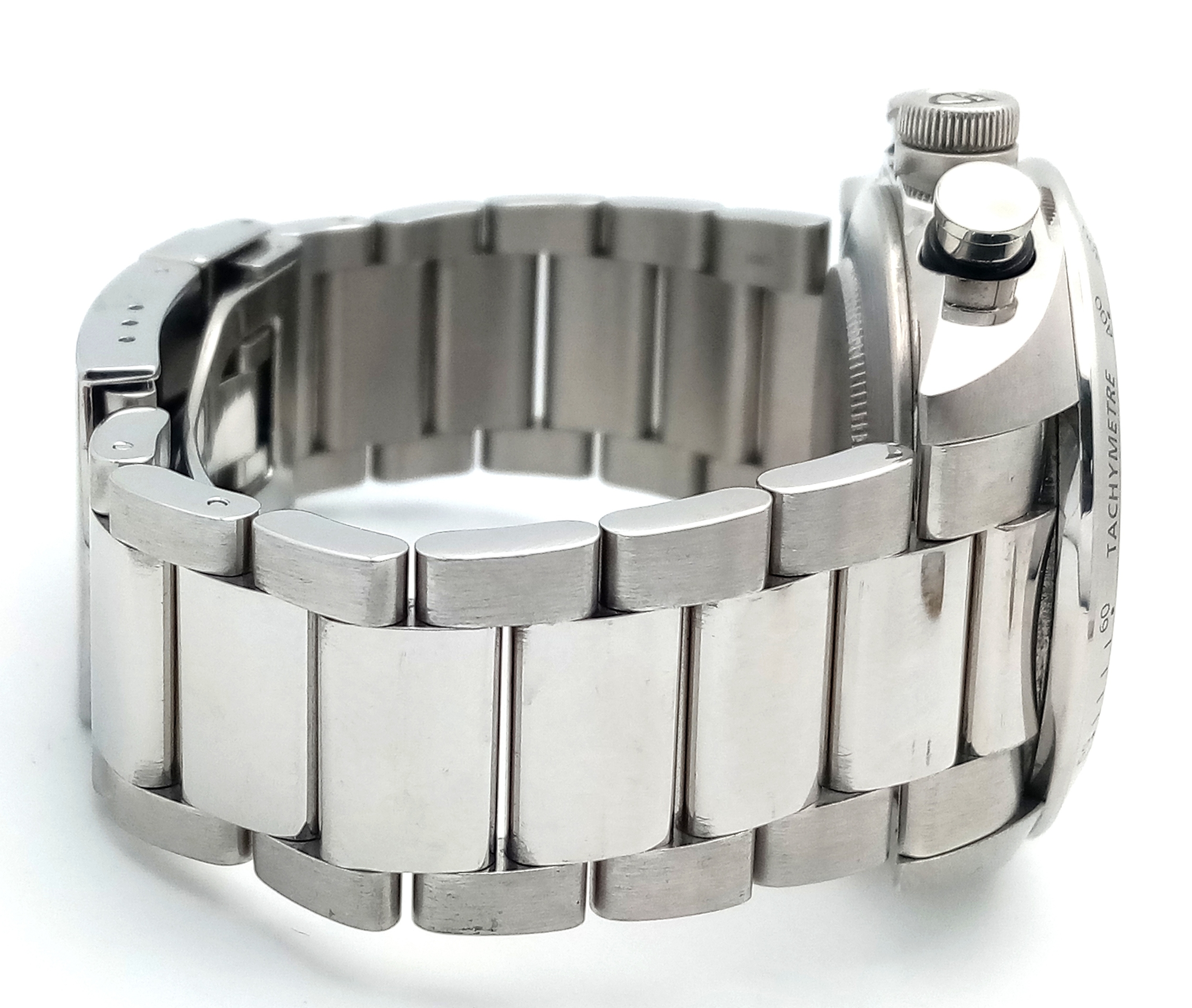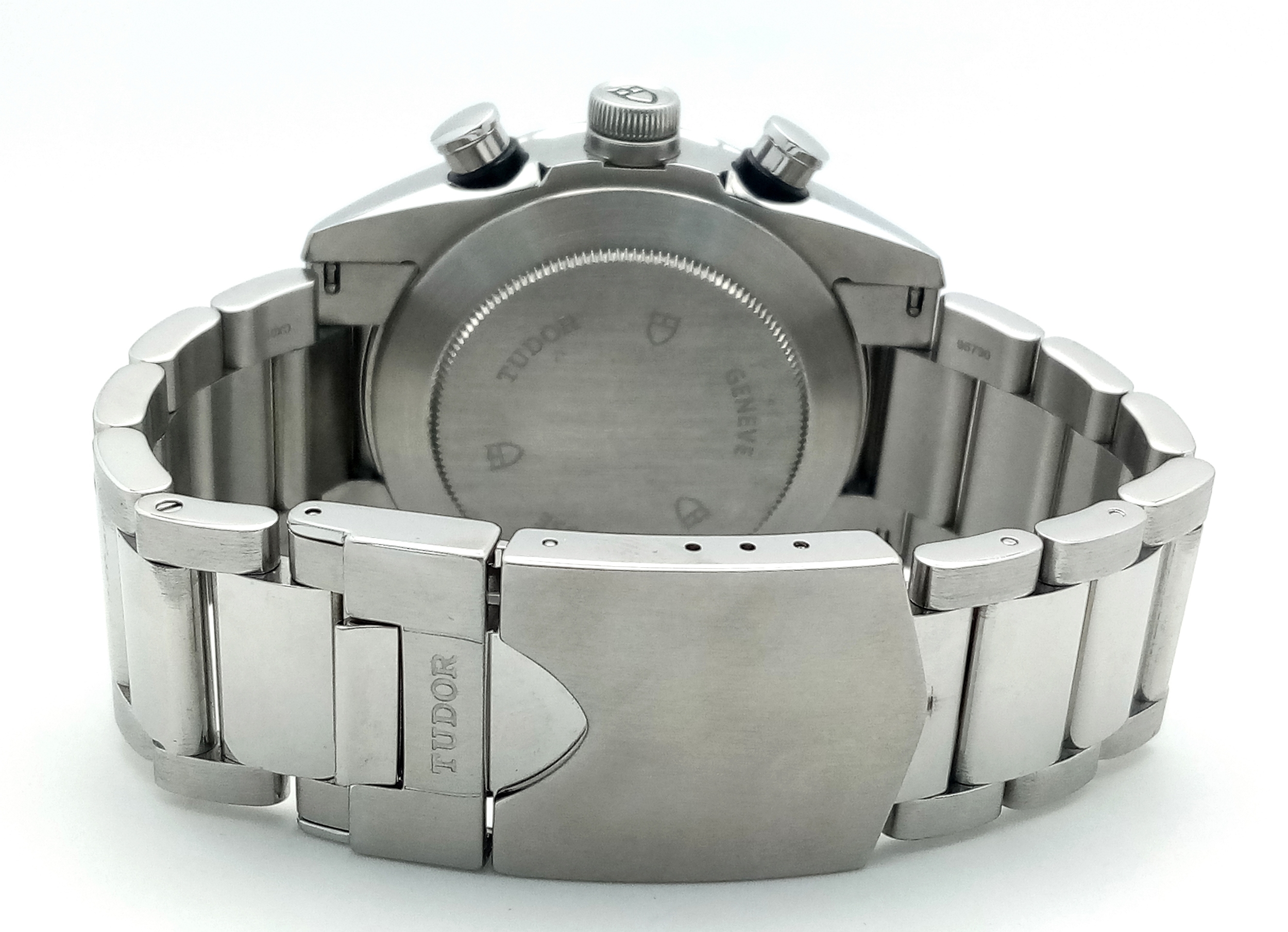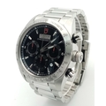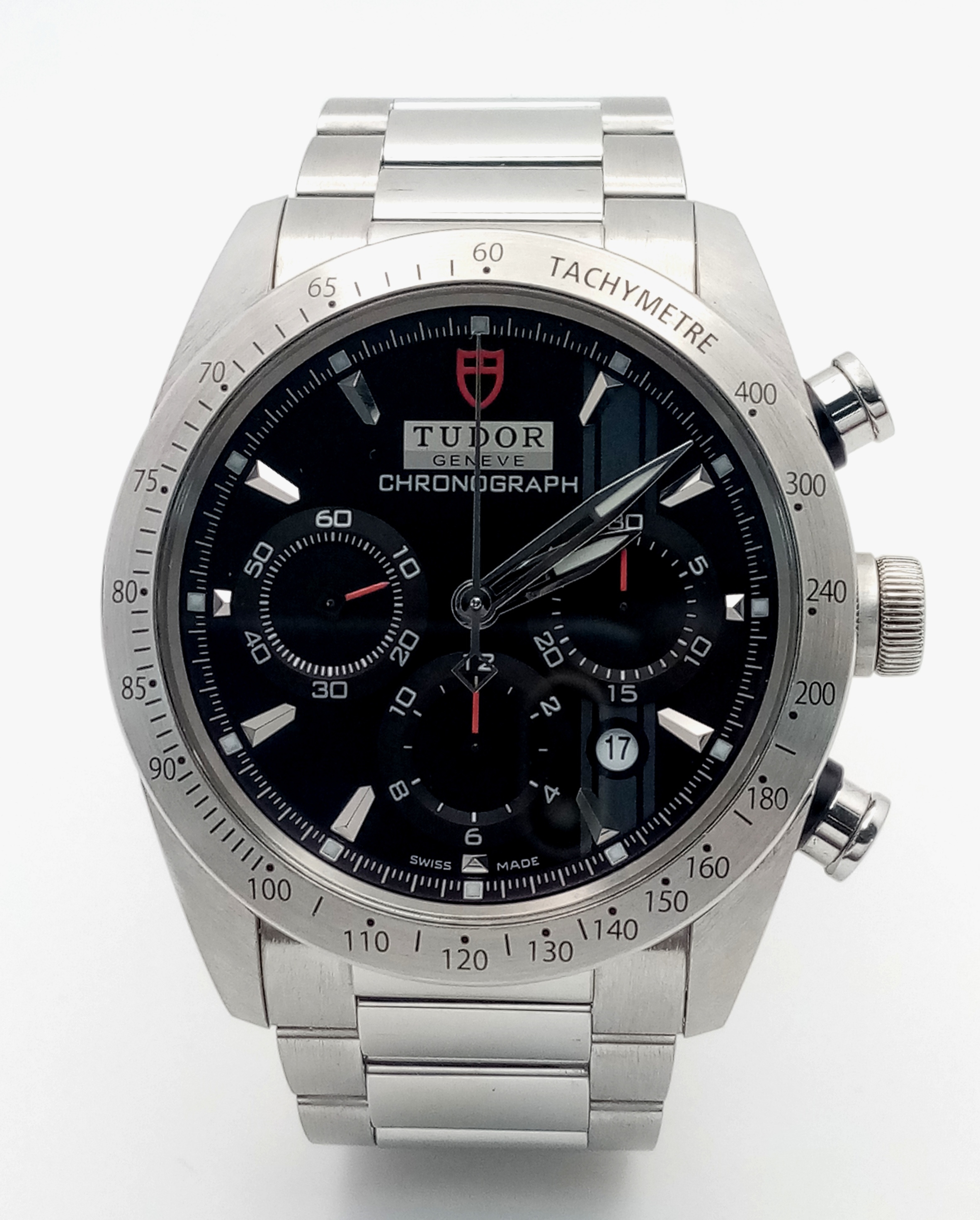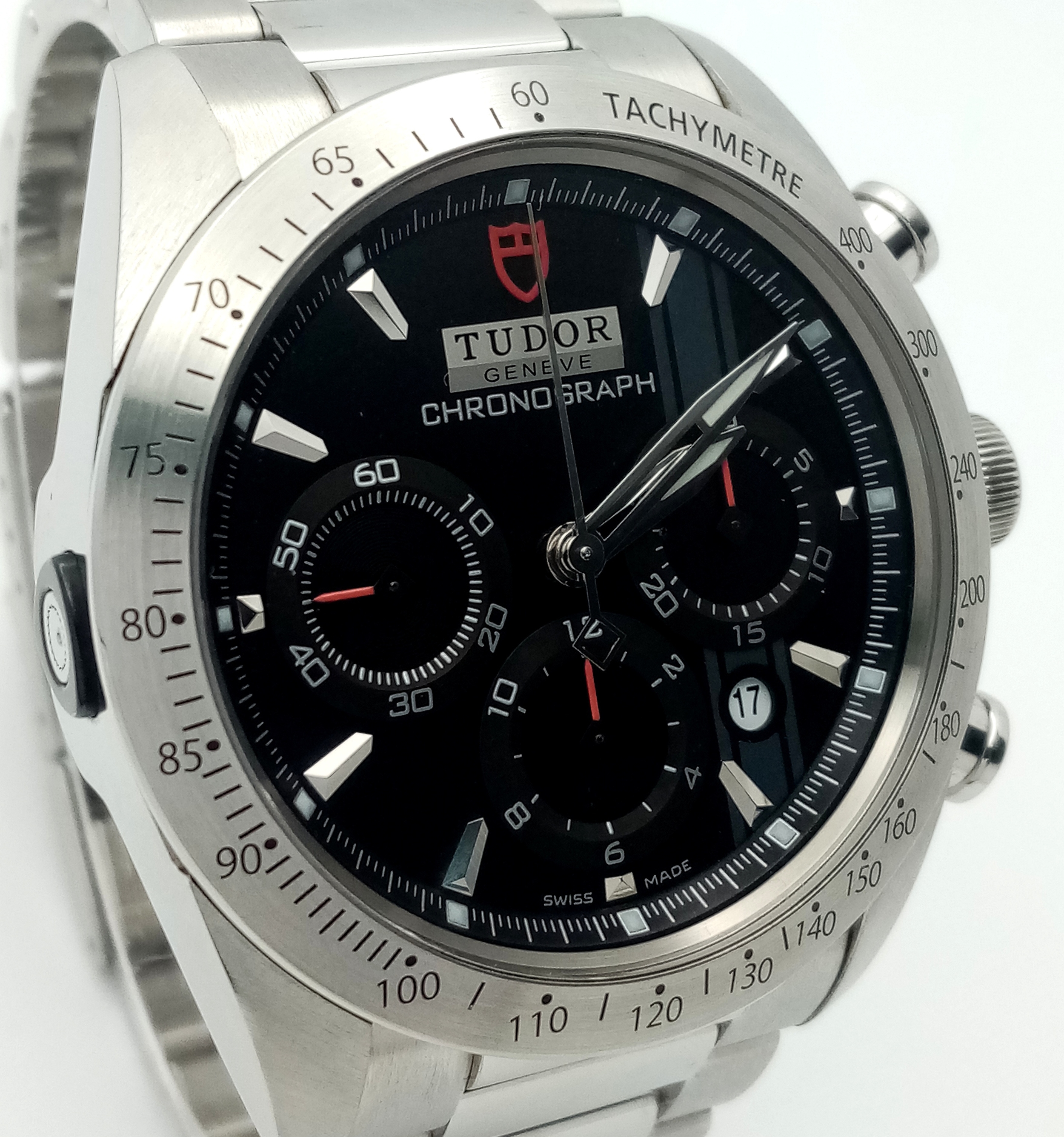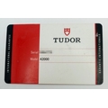 A Tudor Fastrider Chronograph Automatic Gents Watch. Model 42000. Stainless steel bracelet and case - 42mm. Black dial with three sub dials. Tachymeter bezel. In good condition and working order. Comes with a Tudor guarantee card.
