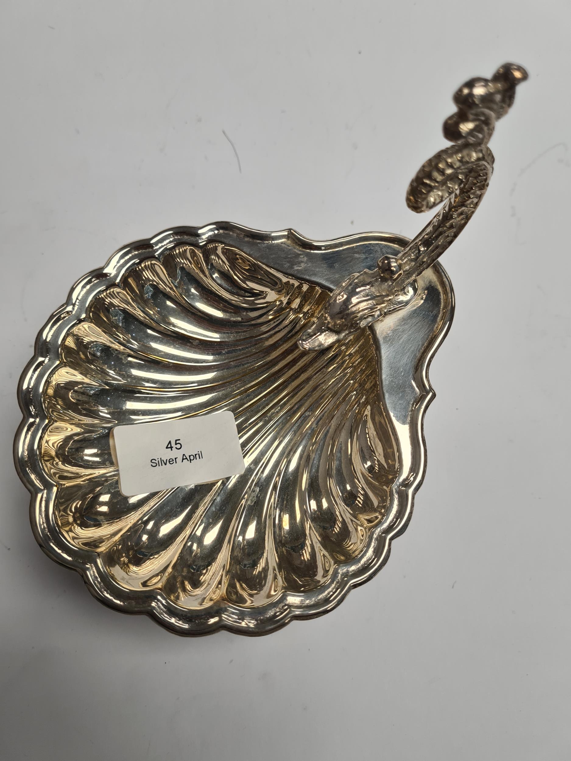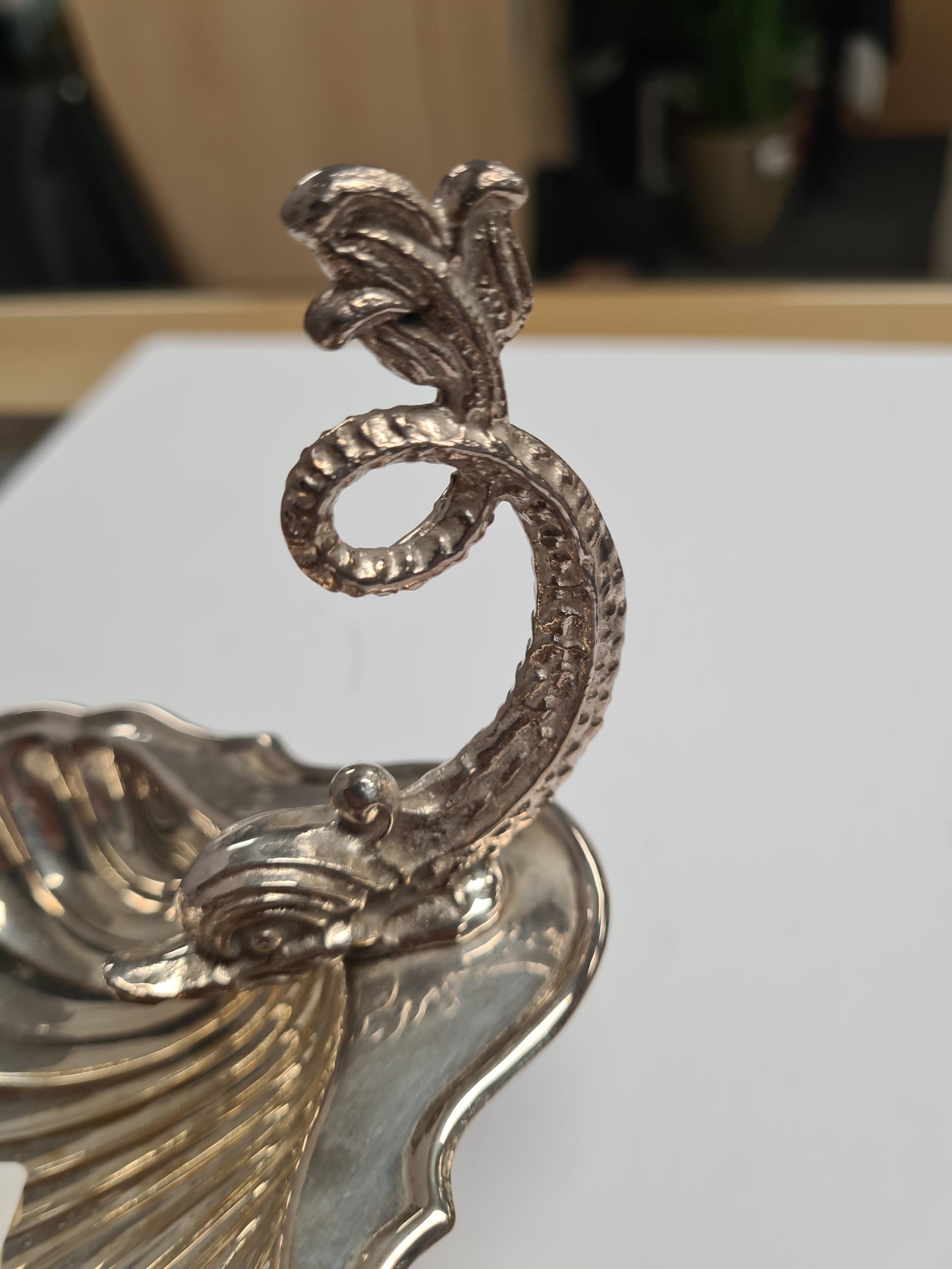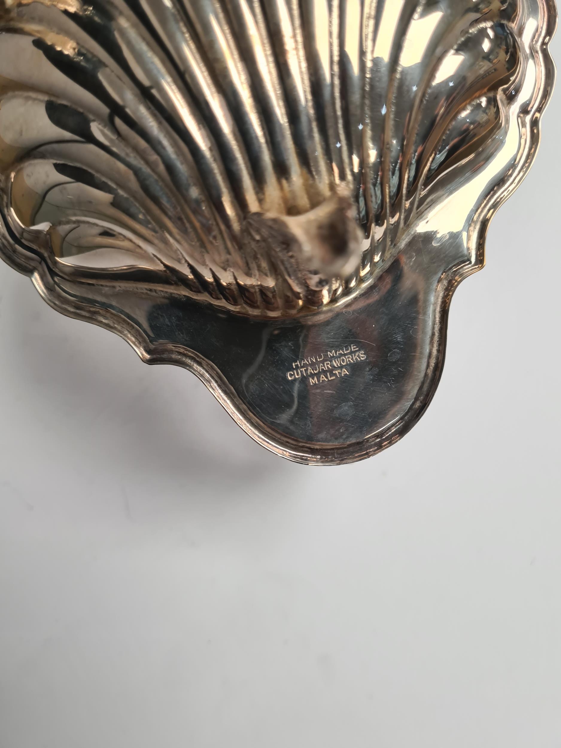 A white metal Handmade Cutajar Works Malta shell dish having ornate fish detail decoration. Ornate feet. 5.52ozt approx. Condition report; white metal, cannot see silver mark