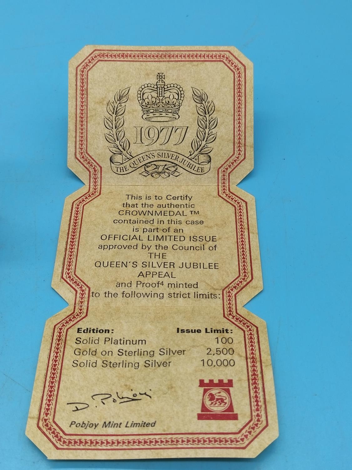 Sterling Silver Pobjoy Mint 1977 Official Limited Issue of 1000 'Council of the Queen's Silver Jubilee Appeal' Medal with Paperwork.