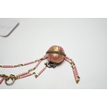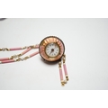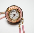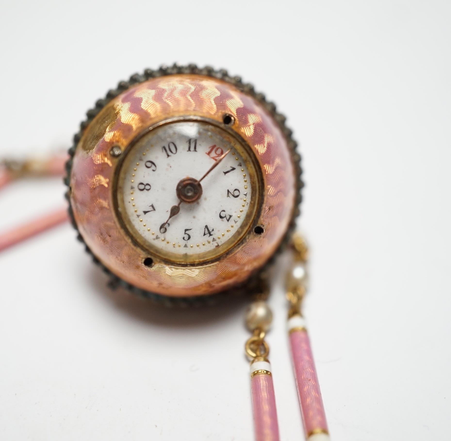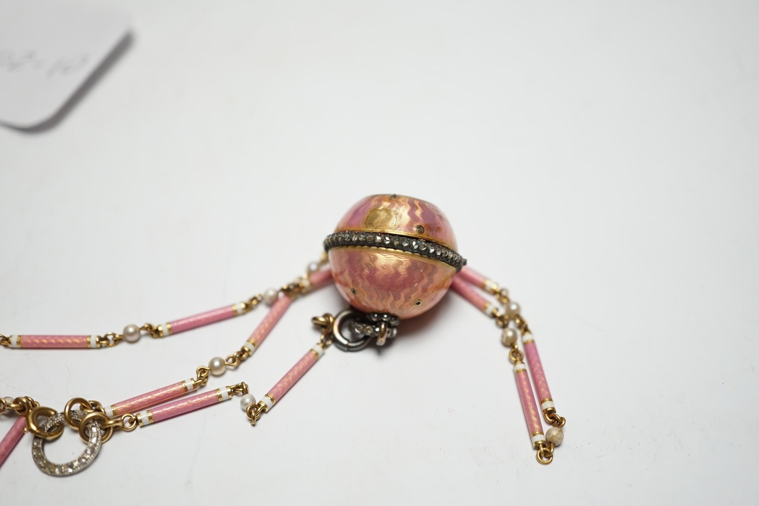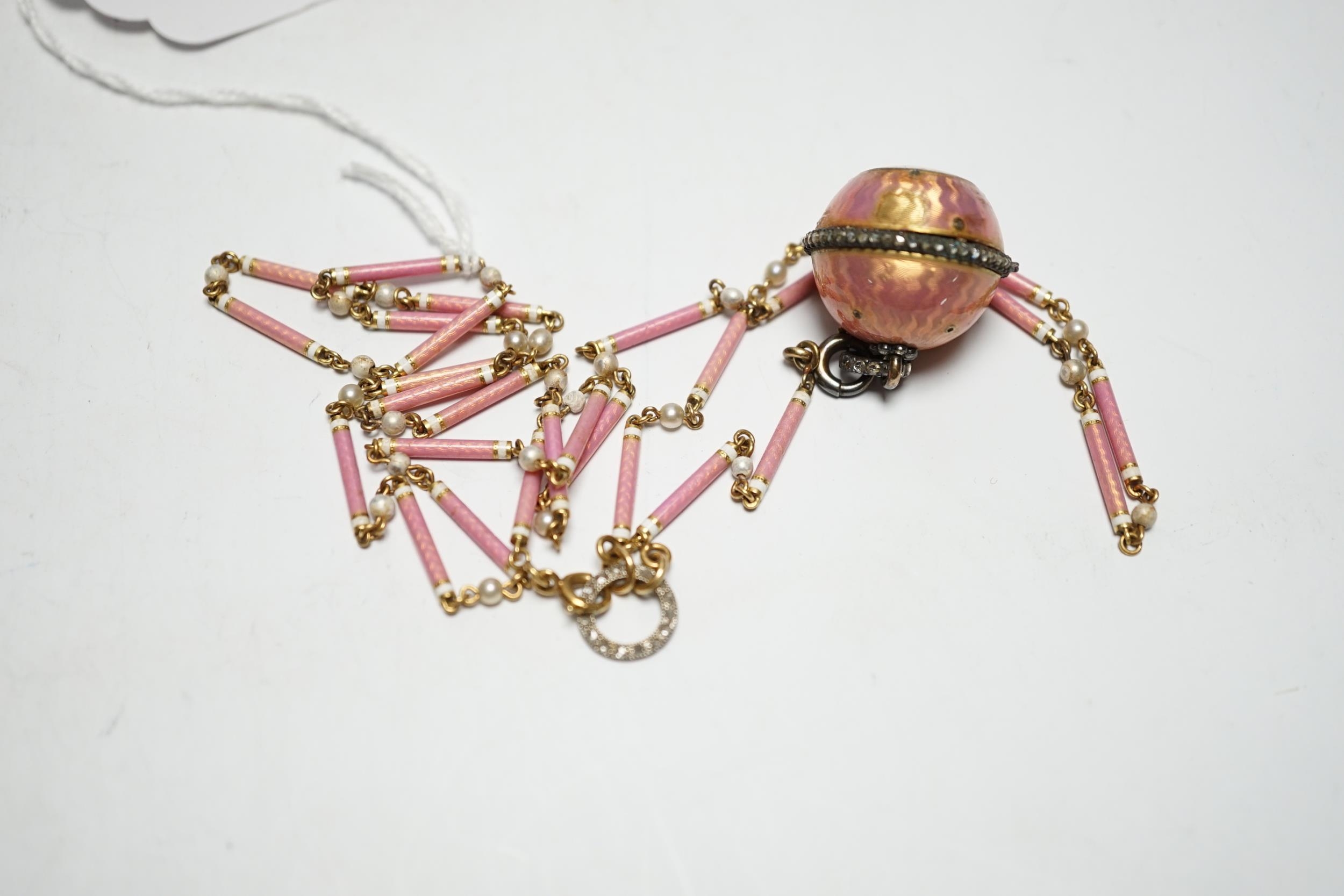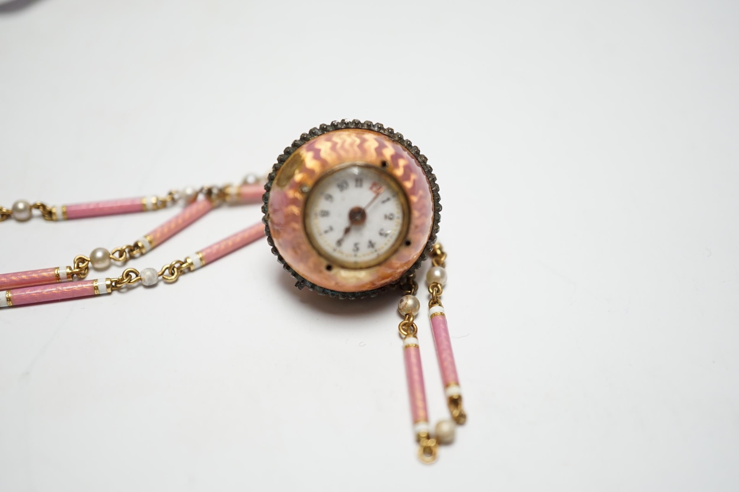 A lady's Swiss Belle Epoque yellow metal, rose cut diamond and enamelled globe watch, on a similar yellow metal rose cut diamond, two colour enamel and seed pearl set necklace, overall 84cm (a.f.).