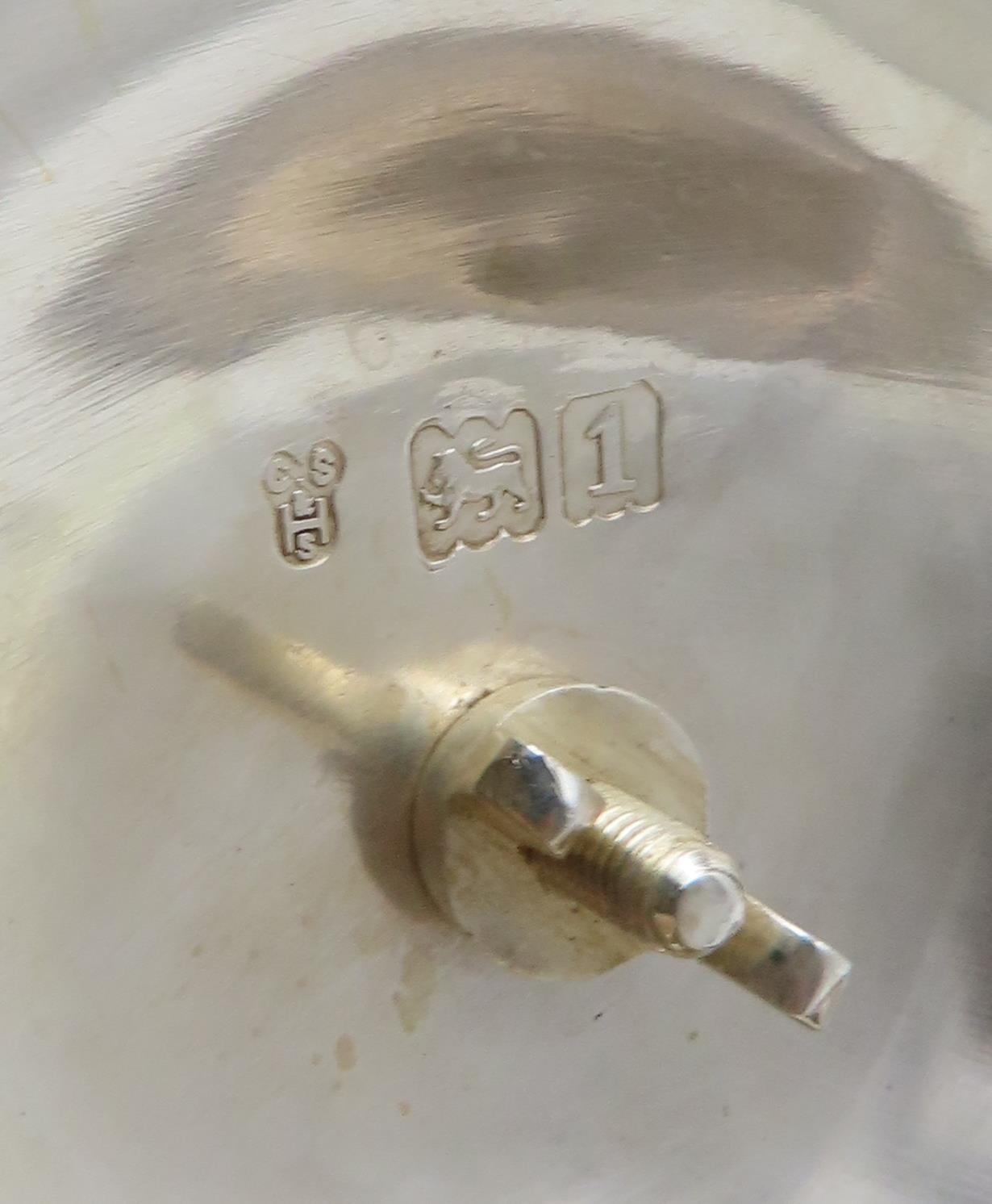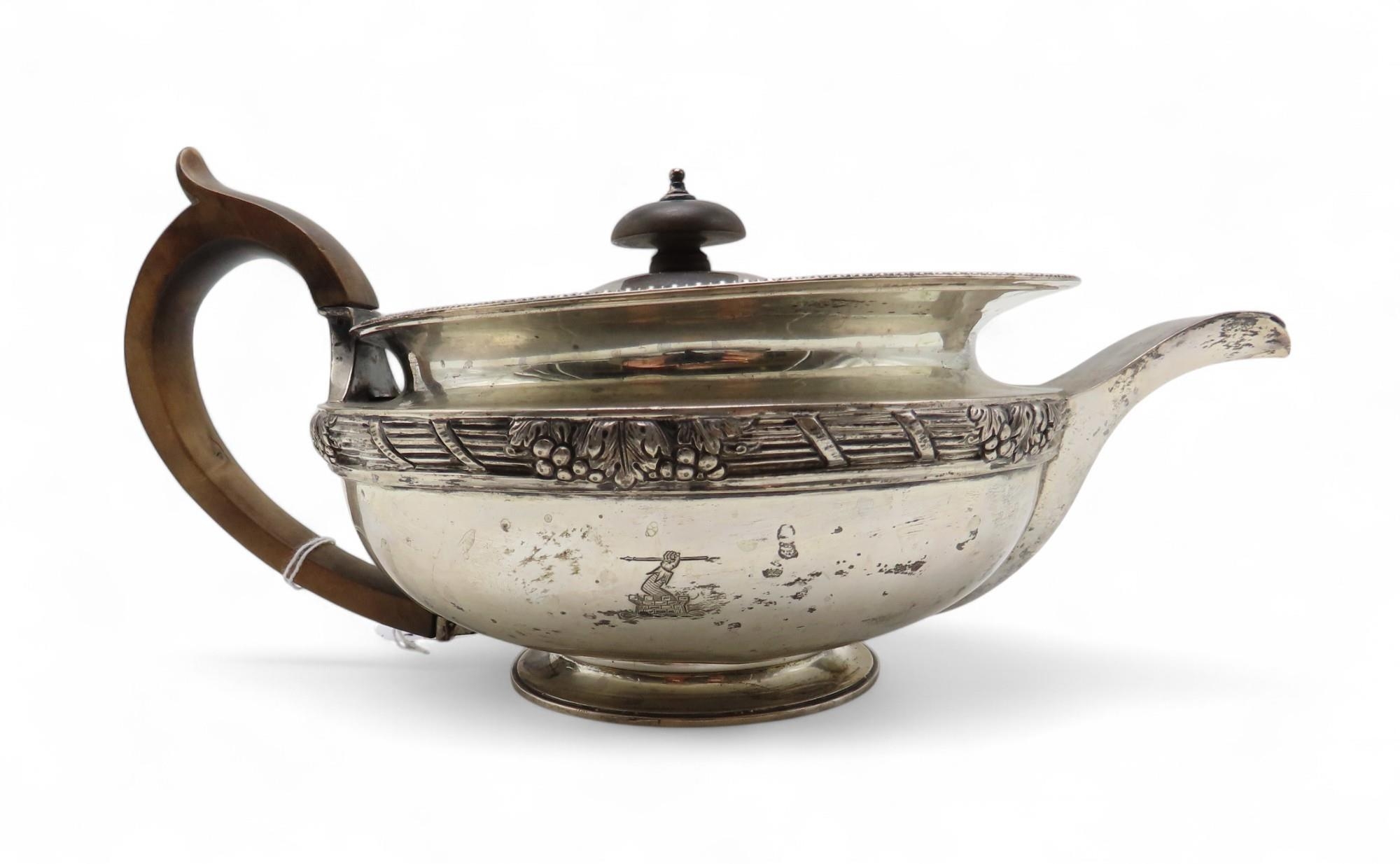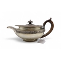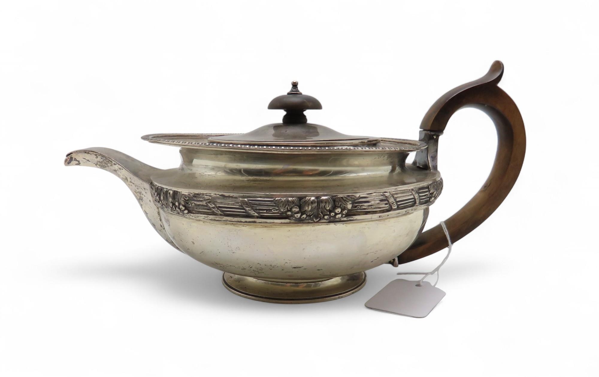 An Edwardian silver teapot, by C S Harris & Sons Ltd, London 1906, of squat baluster form, crested, with a fruitwood finial, 772gms