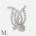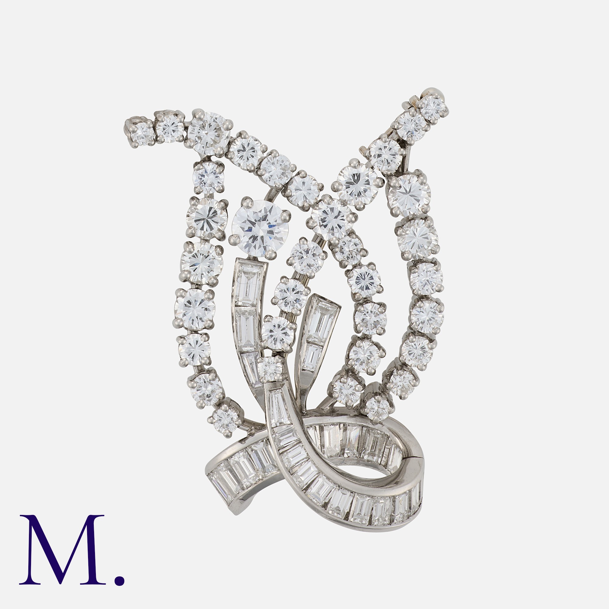 A Diamond Brooch in 18 carat white gold and platinum, Set with round brilliant and baguette cut diamonds totalling approximately 3.20 carats. Marked indistinctly, tests indicate 18 carat gold and platinum.