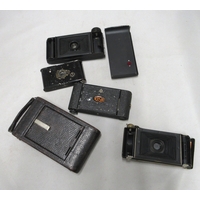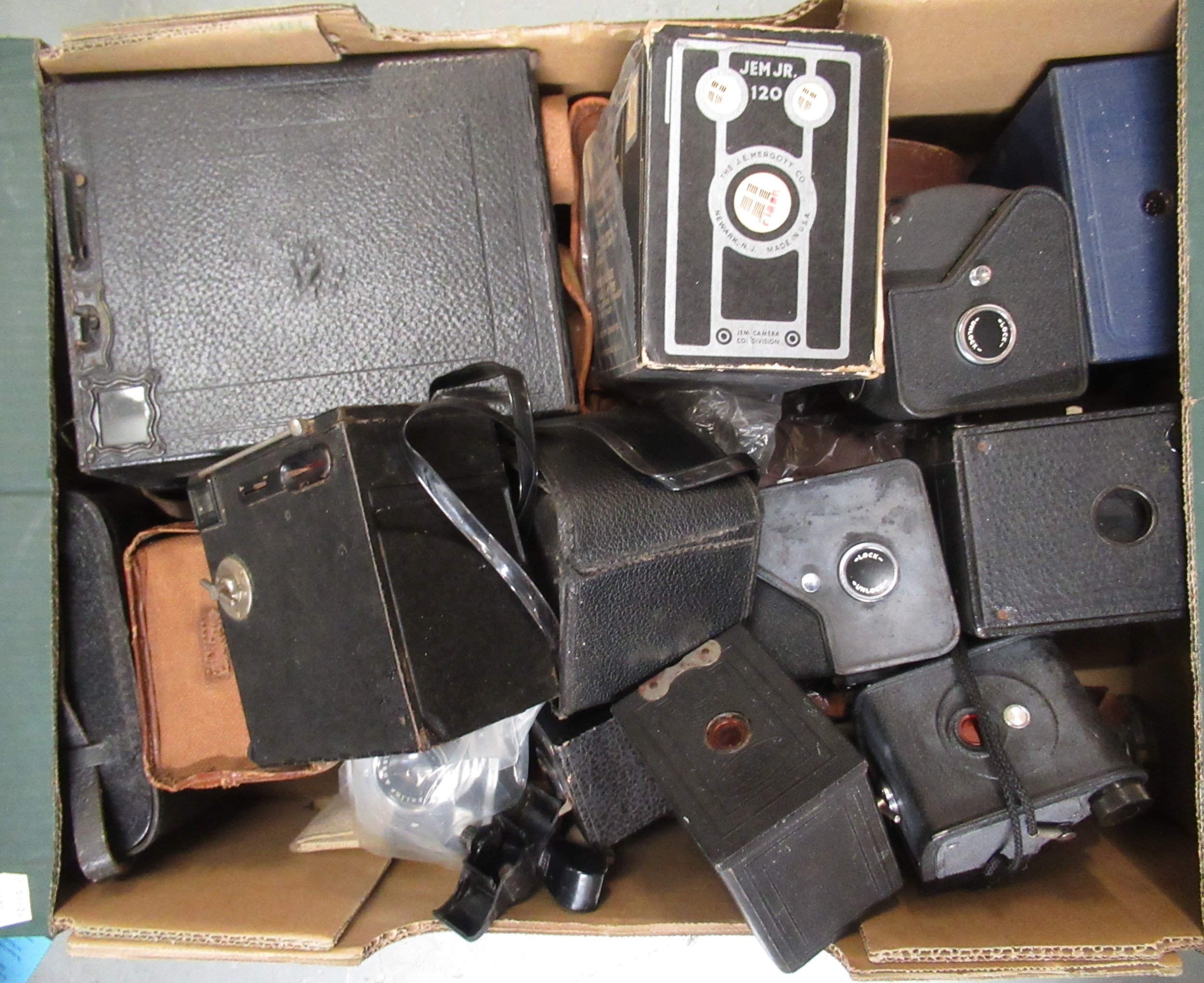 Collection of various box cameras, including a Gem Junior 120 with an original cardboard carton