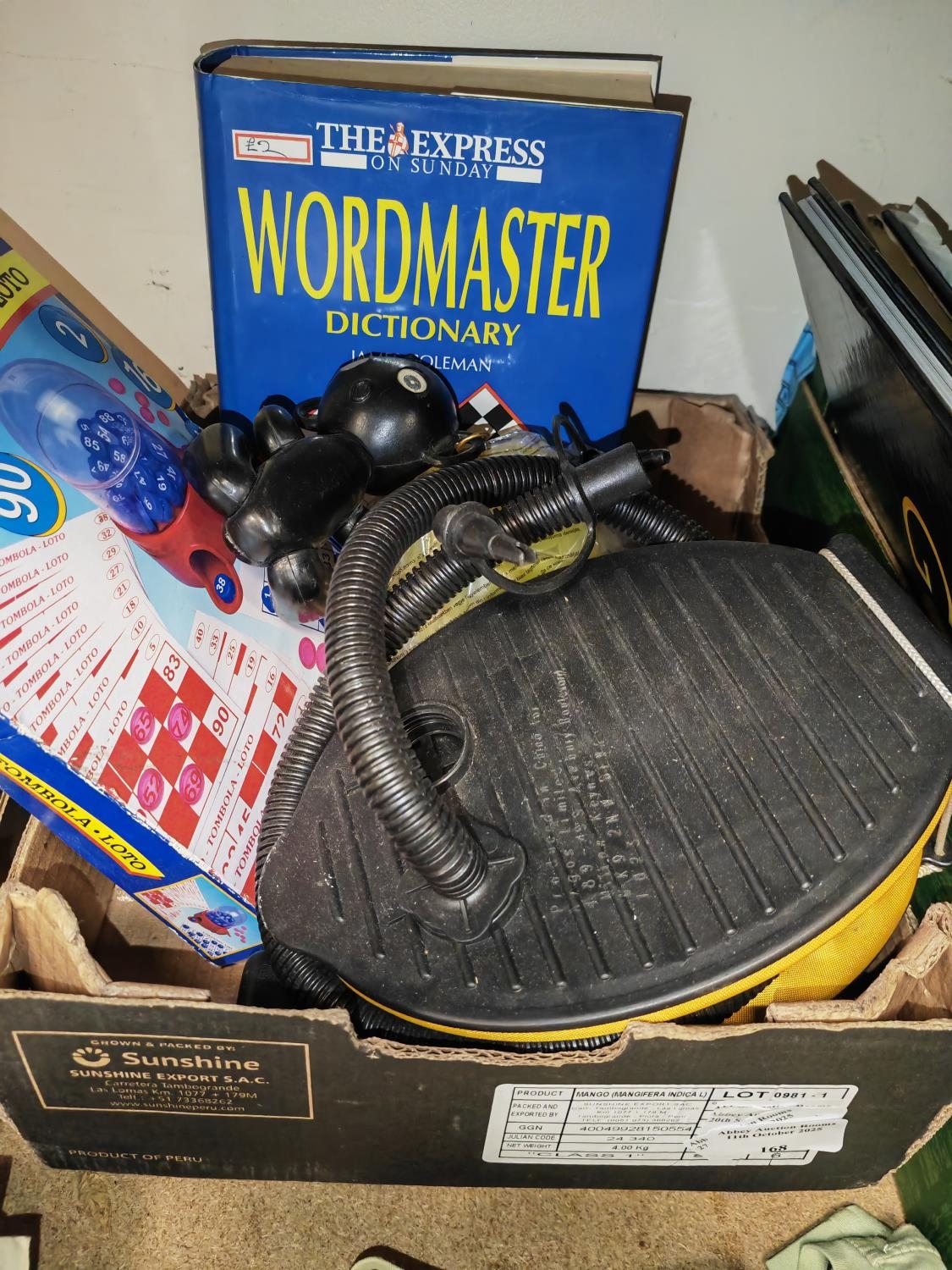 Box Of Mixed Items, Including Foot Pump, Games Books Etc