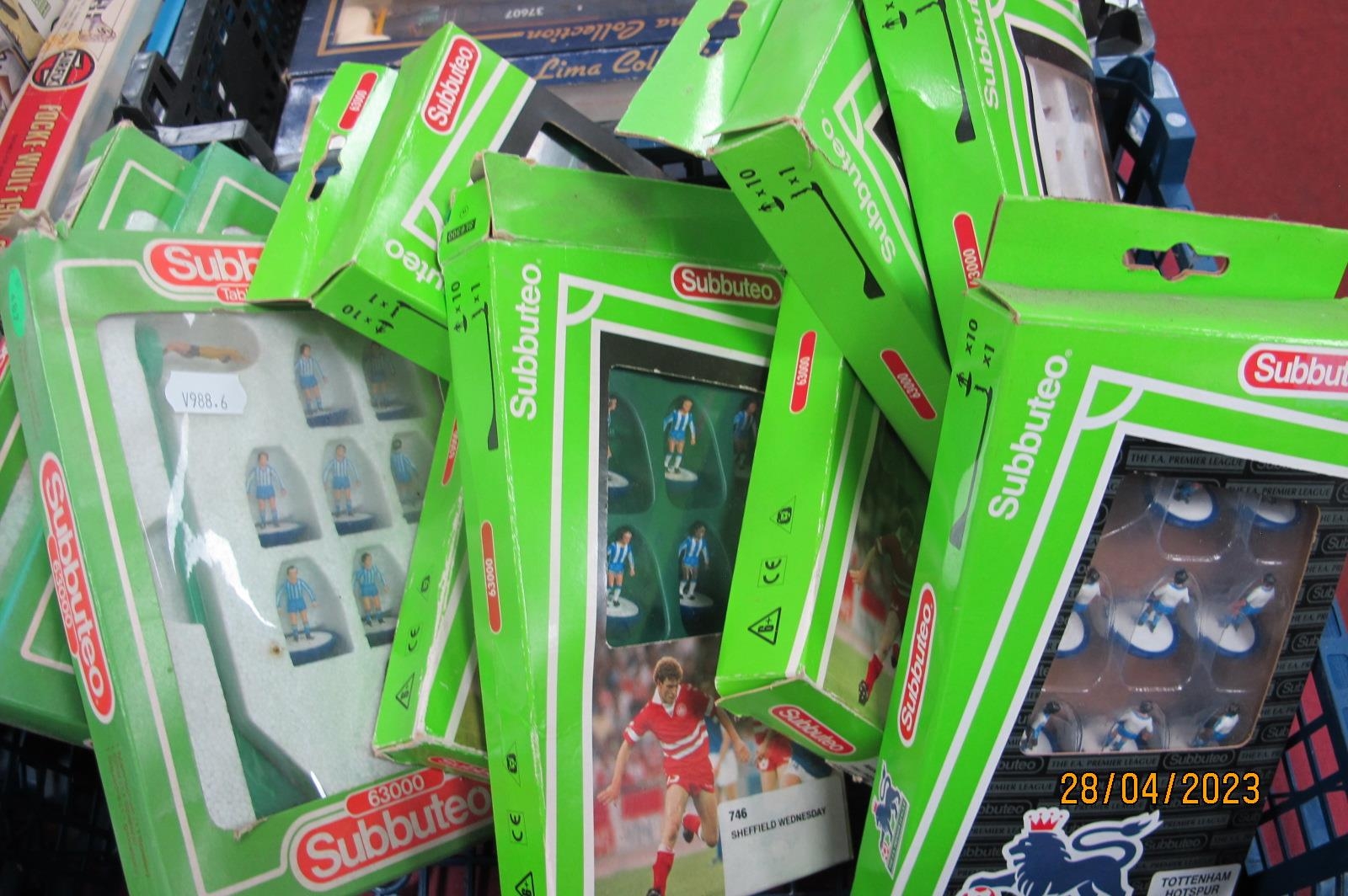 Subbuteo - Ten Boxed Football Teams, to include #487 Goteborg, #629 Tottenham Hotspur, #744 Manchester City, #771 Manchester United 2nd,, #472 Barcelona, #746, Sheffield Wednesday, box condition variable.