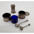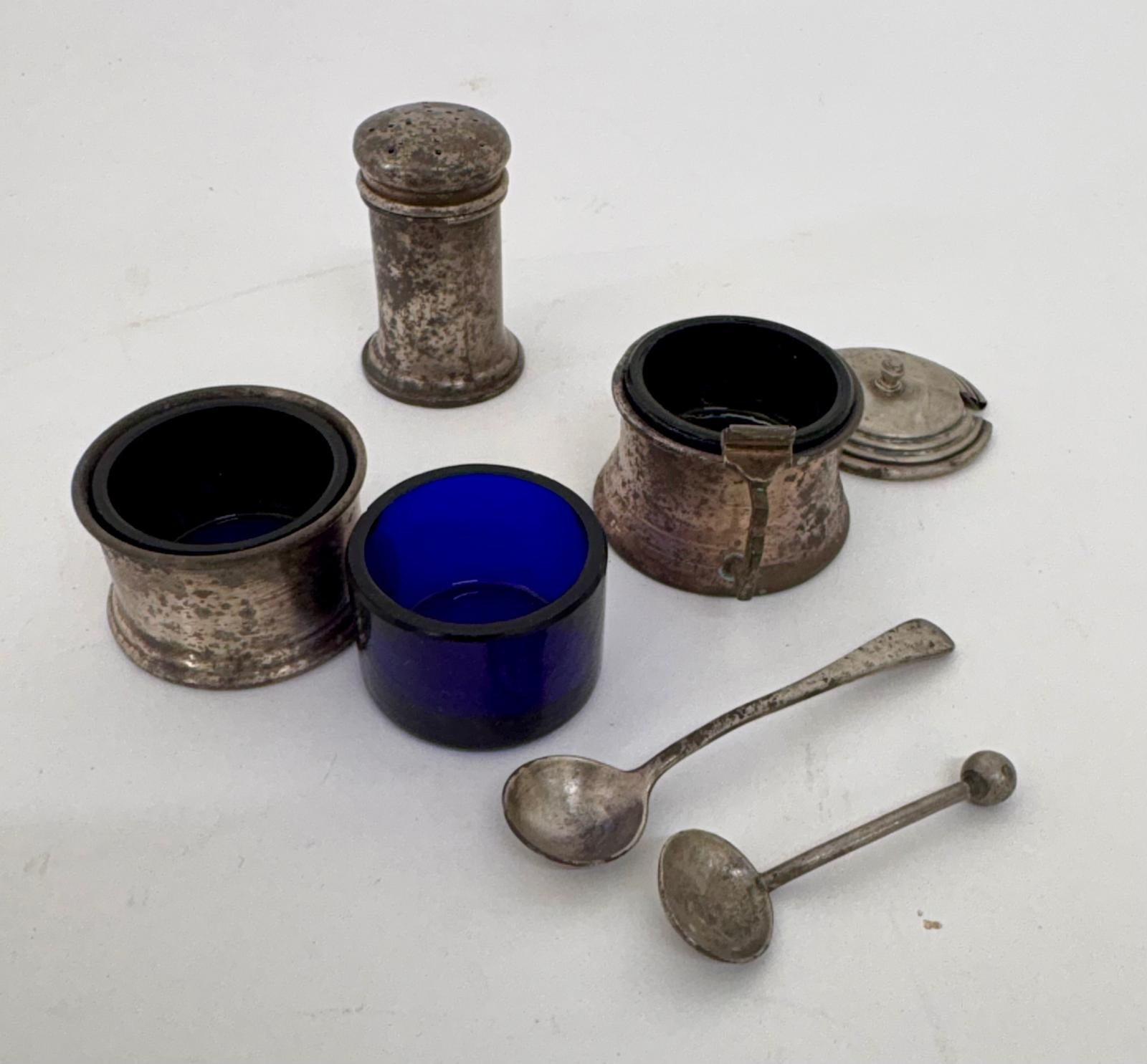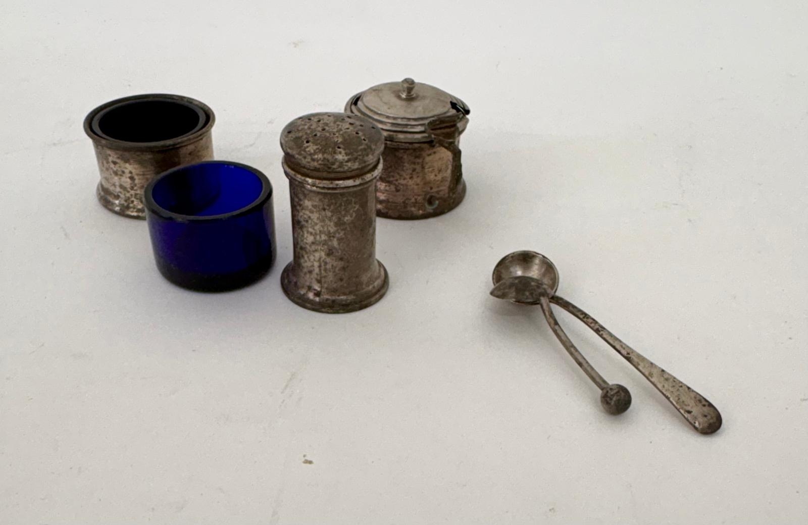 A silver part condiment set, with extra blue glass sleeve and two matched salt spoons.