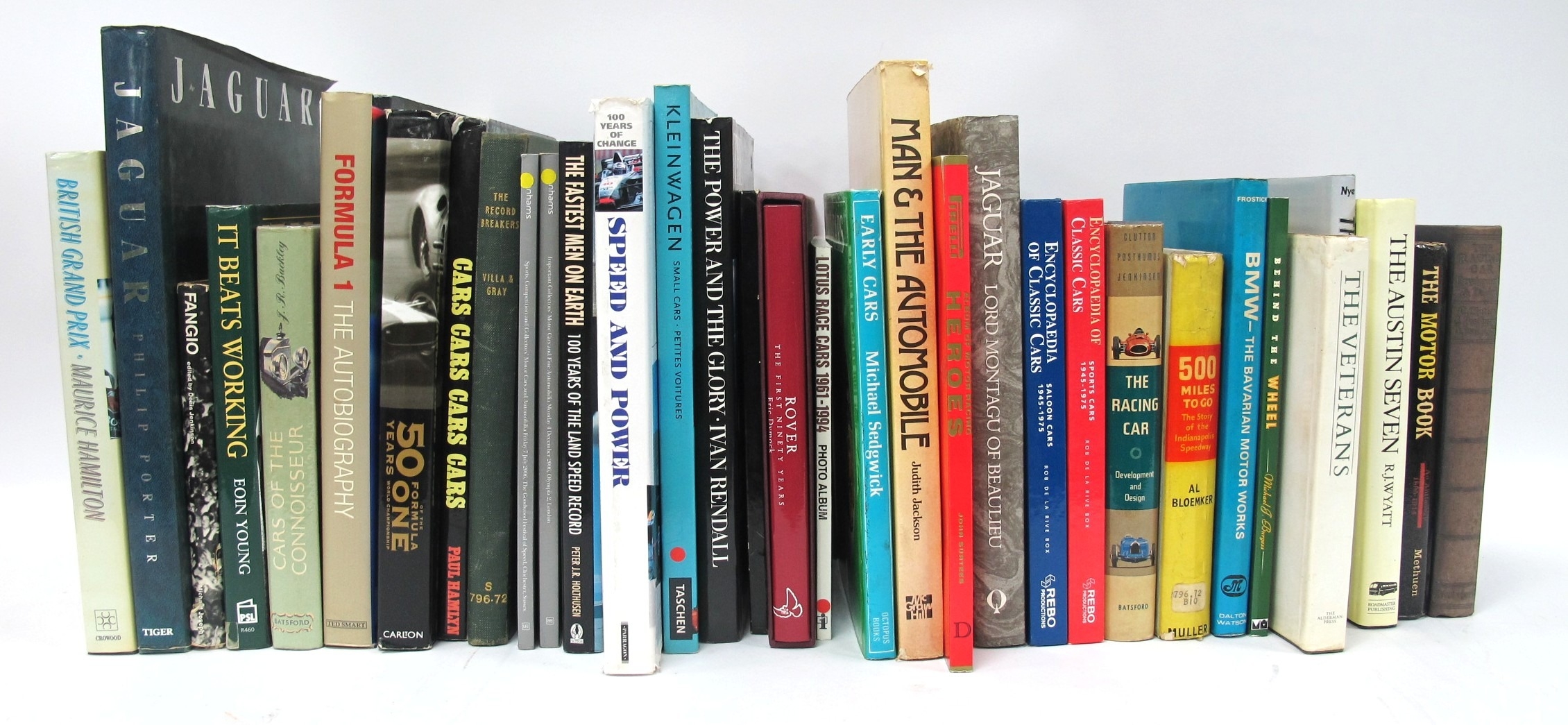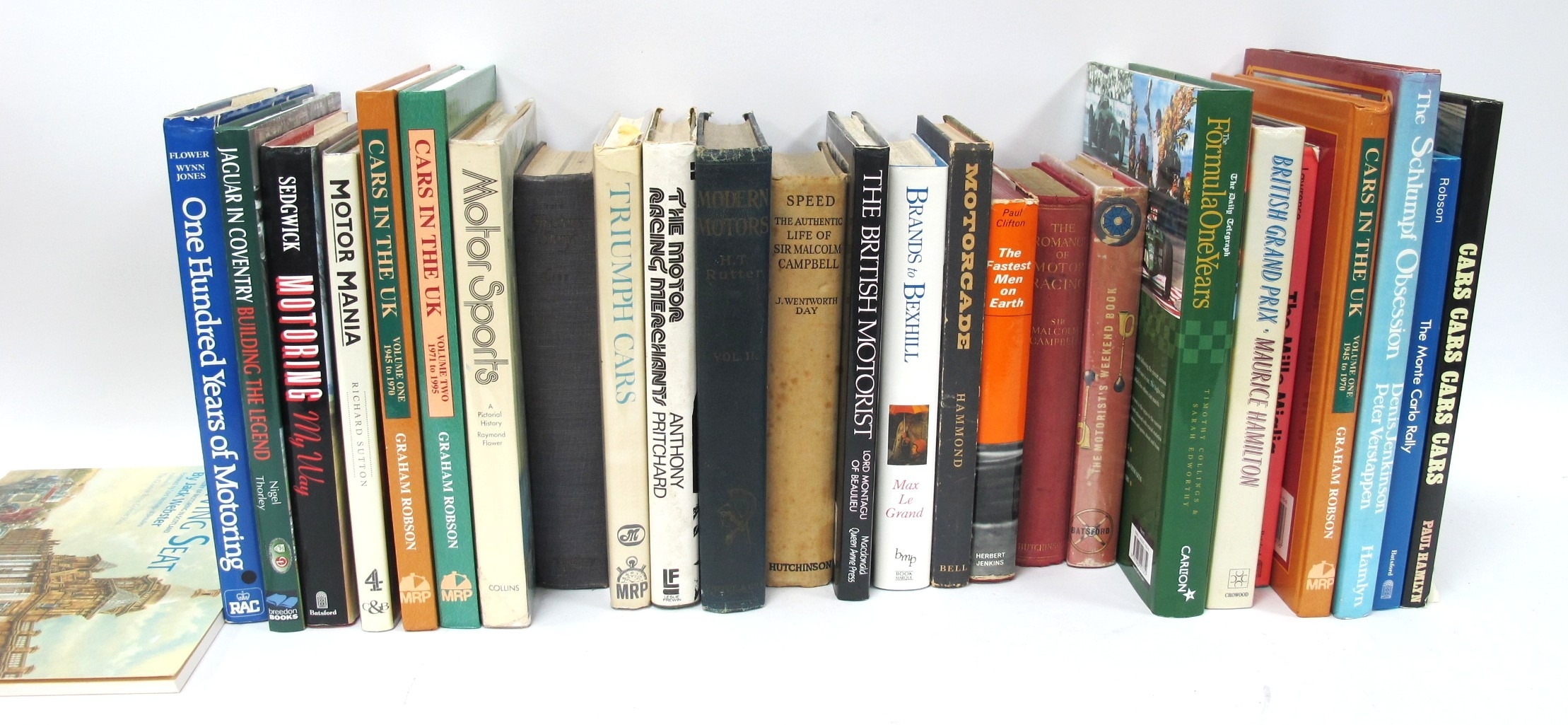 A Gentleman's Motoring Archive Library, containing approximately one hundred books / catalogues. To include George Eyston Safety Last signed first edition 1975, Allan Moffat's Scrapbook reprint 1979, Challenger Mickey Thompson's Own Story Of His Life Of Speed first edition 1964, Formula Junior Competition Cars published in association with The Motor first edition 1961, Ecurie Ecosse by David Murray first edition 1962 (missing dust jacket), Uphill Racers The History of British Speed Hill Climbing by Chris Mason first edition 1990, This Motoring by Stenson Cooke signed 13th impression 1933, Formula Junior by John Blunsden first edition 1961, etc. Conditions vary. Both signatures are unverified.