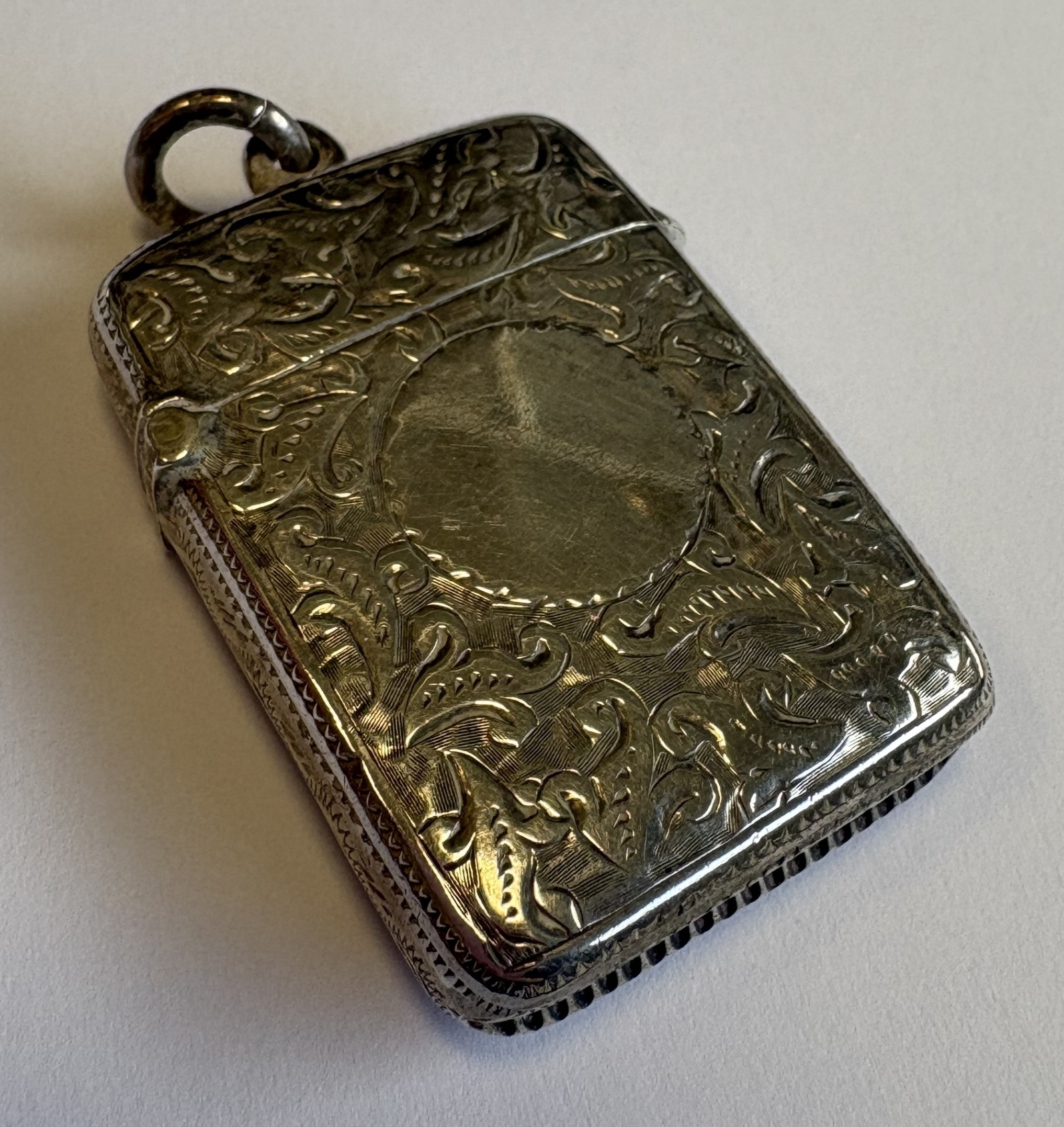 A silver vesta case with engraved decoration. Birmingham 1891. By John Millward Banks. Approx. 18 grams. Est. £20 - £30.
