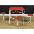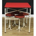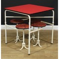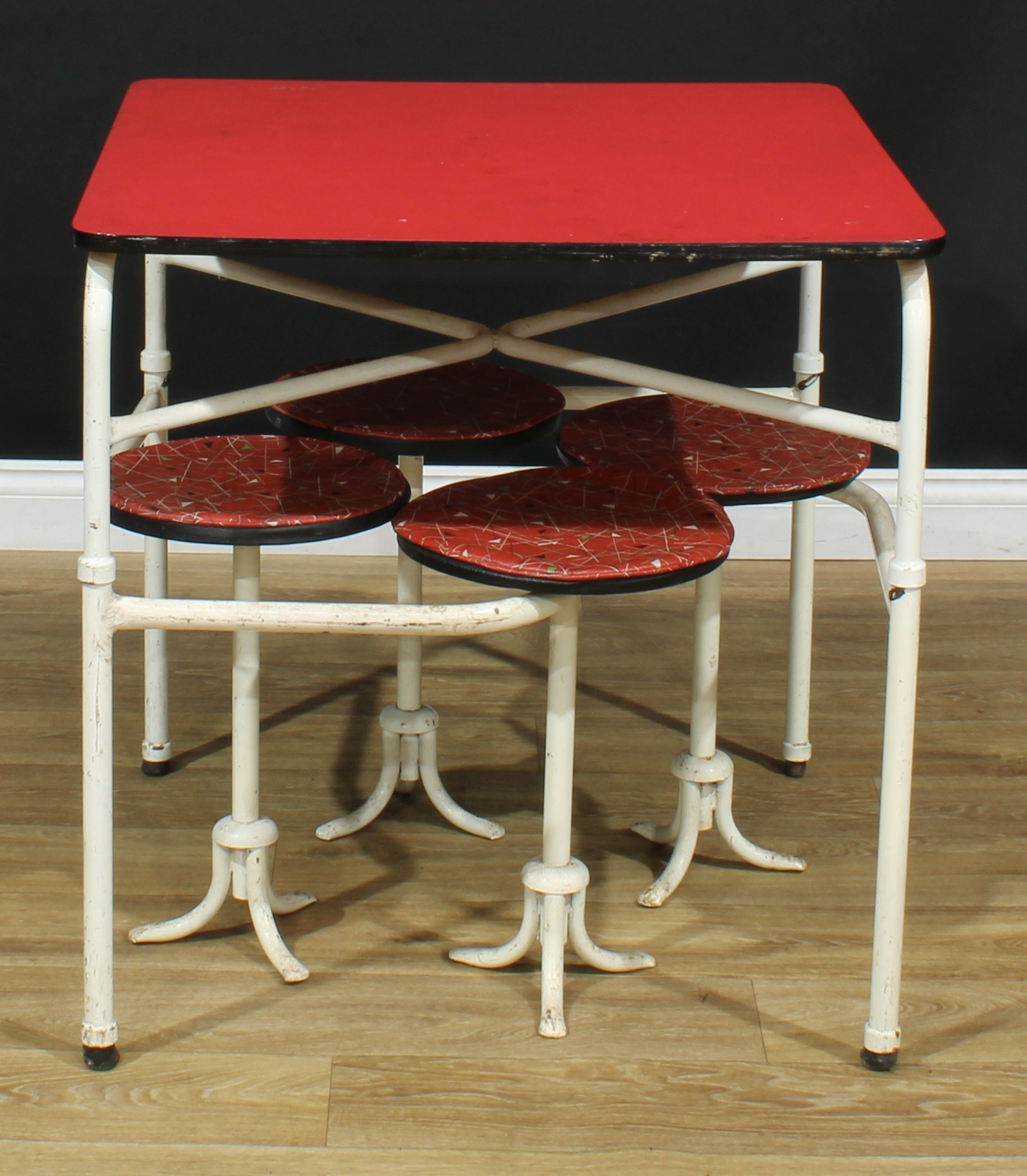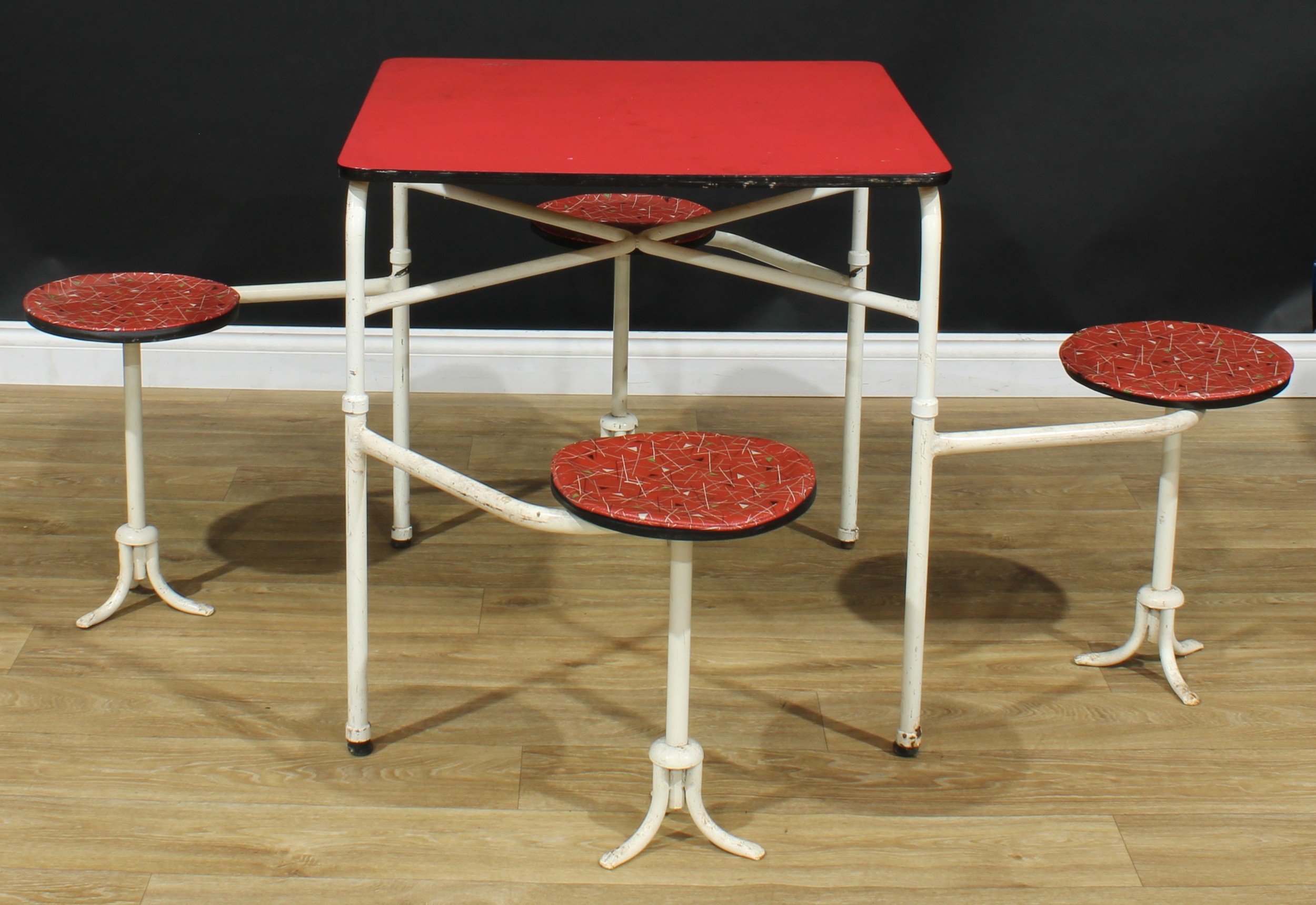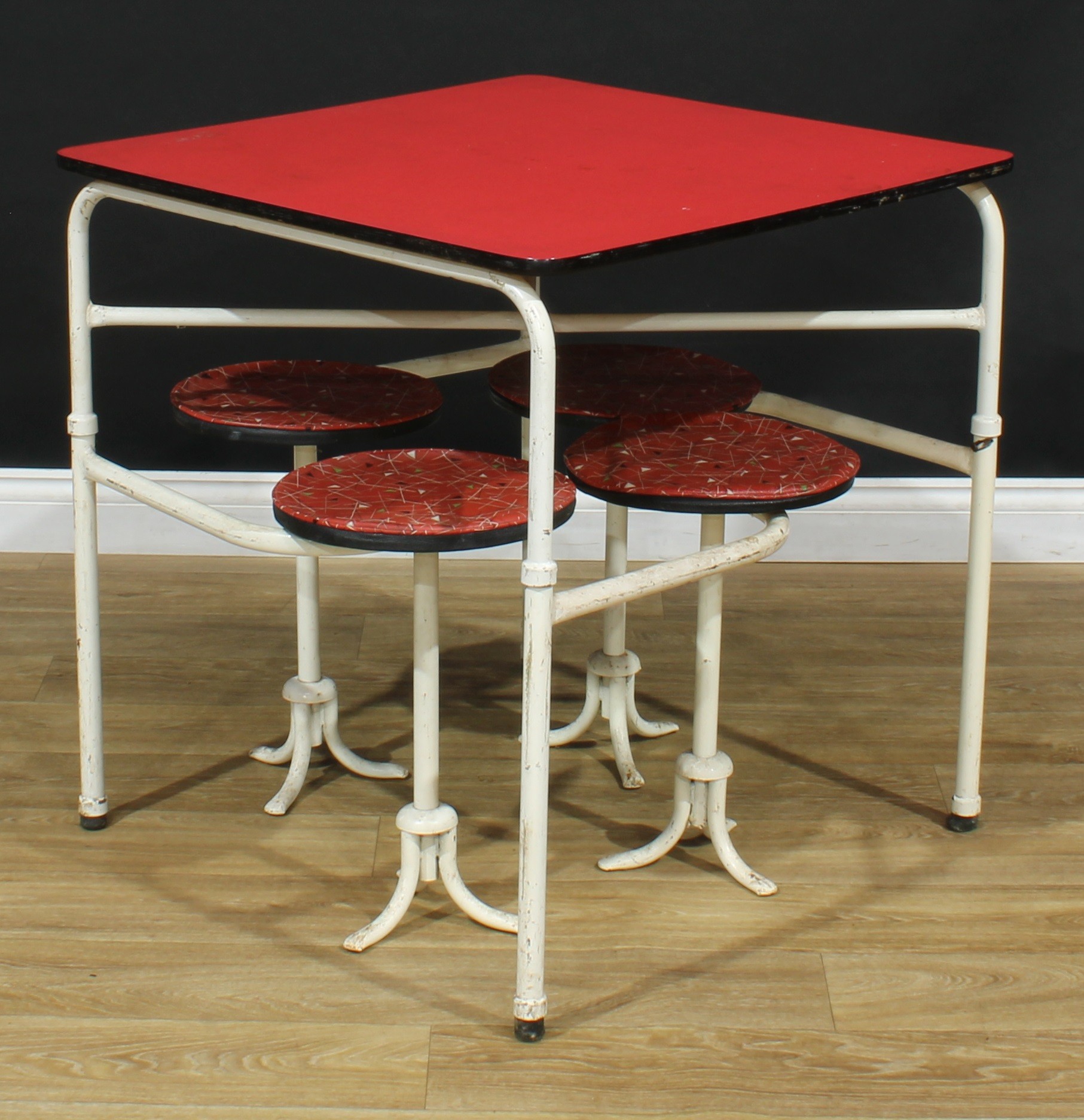 A retro mid-20th century tubular metal framed diner or bistro banqueting table, integral swivel-out stools, 76cm high, 73.5cm square