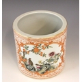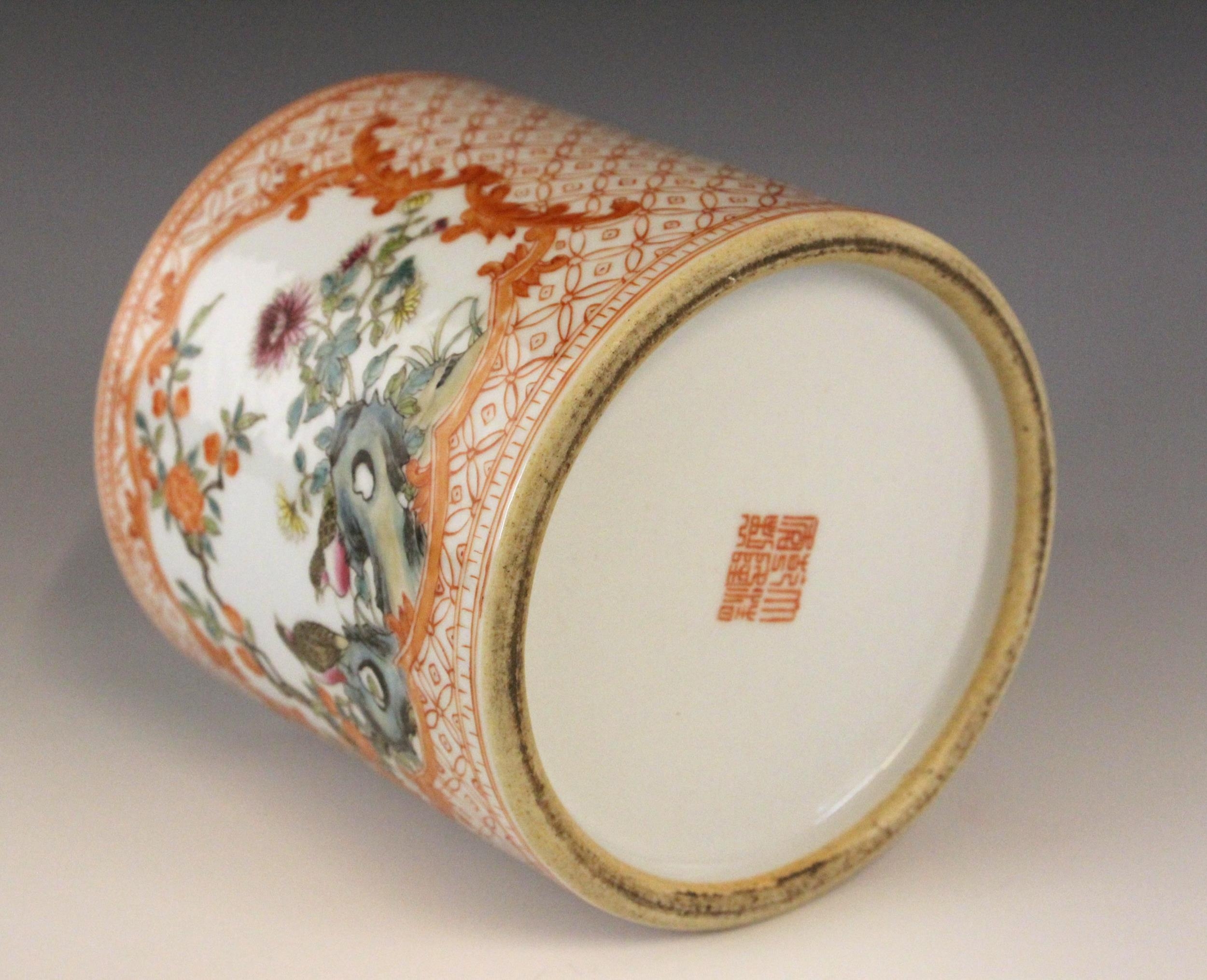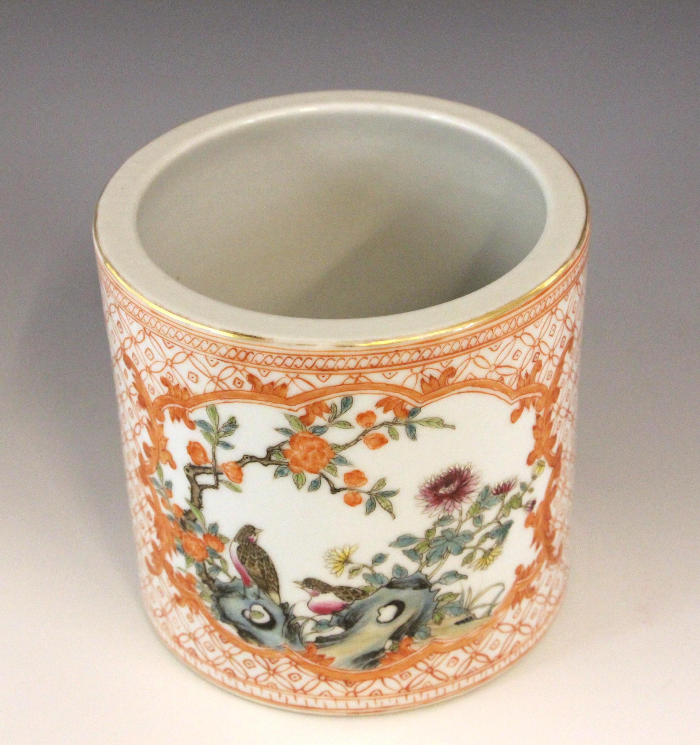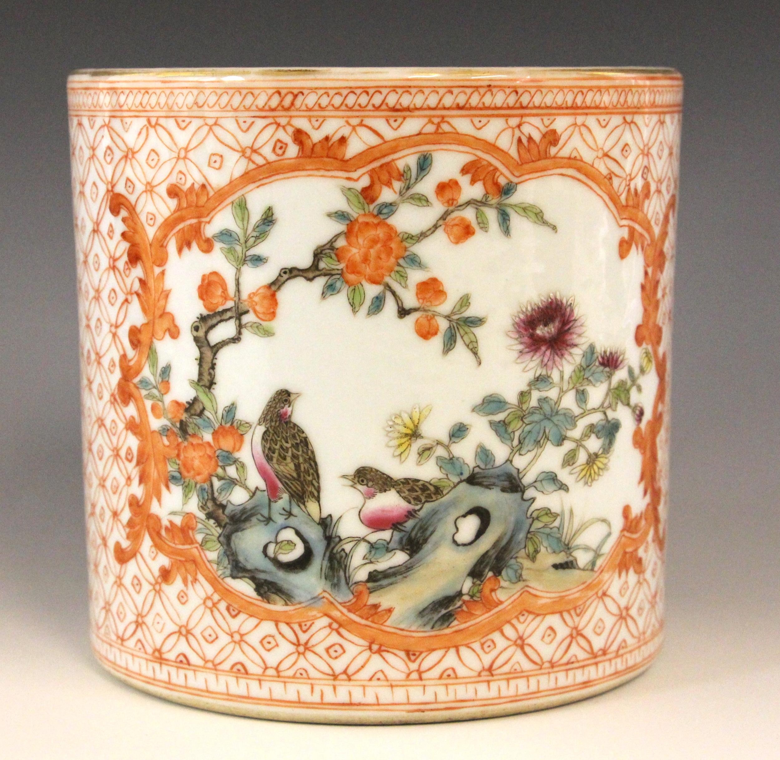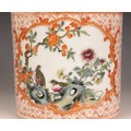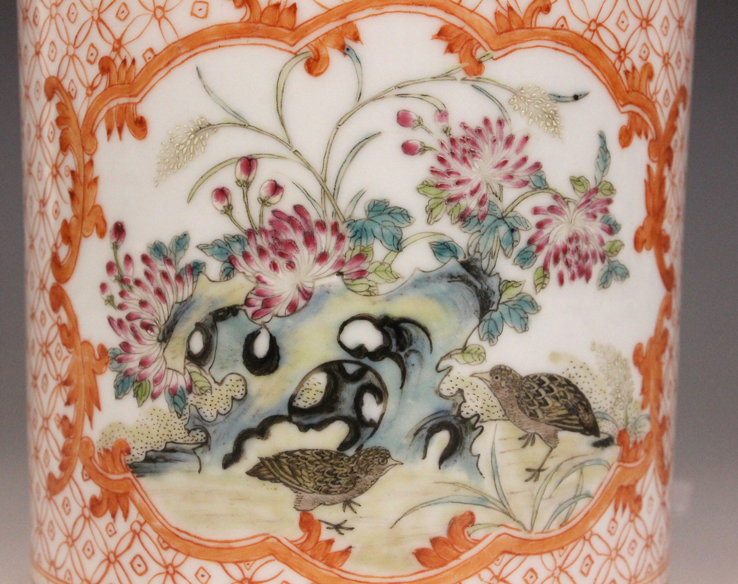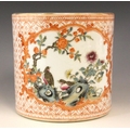 A Chinese porcelain iron-red brush pot (bitong), Qianlong seal mark, of cylindrical form and externally painted with two famille rose reserves depicting quail beside a rocky outcrop, iron-red seal mark to the underside, 13.5cm high