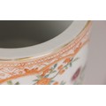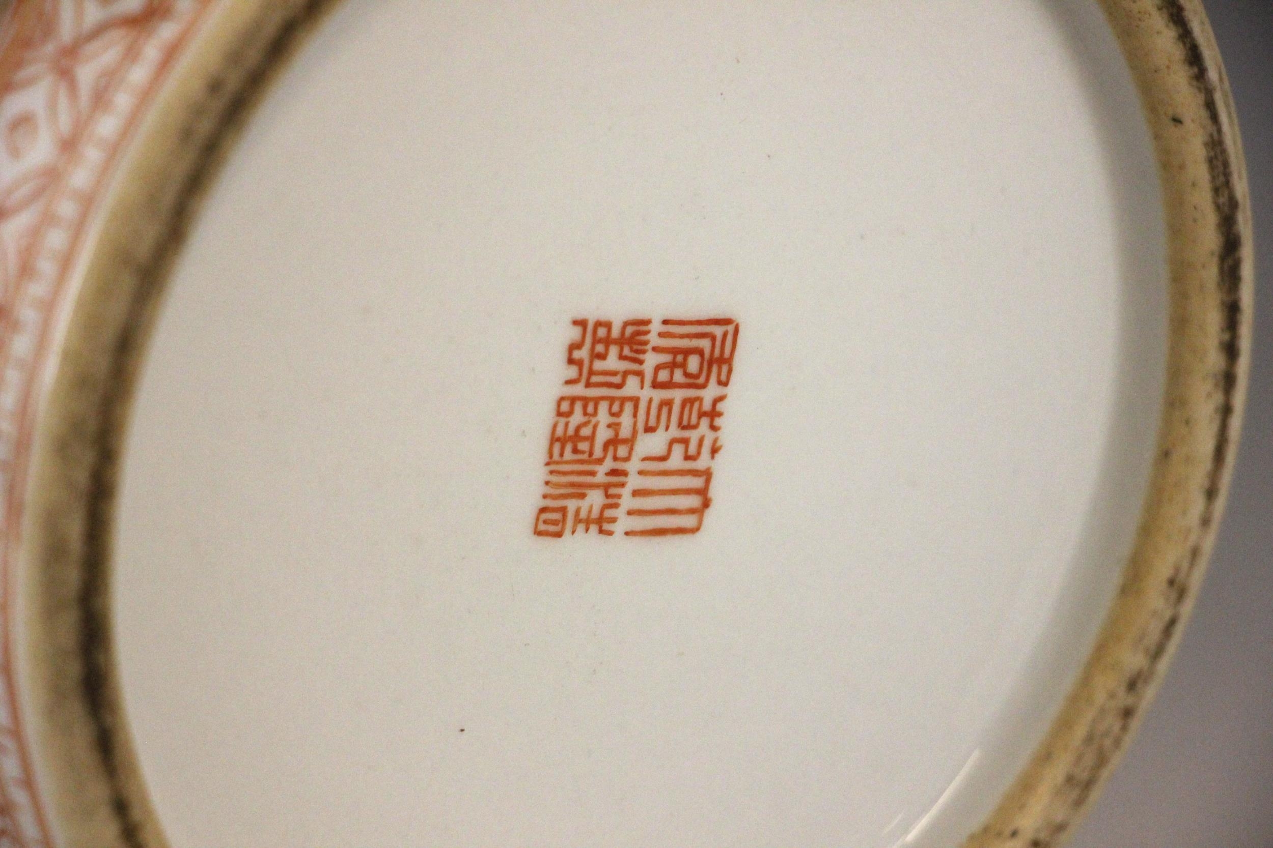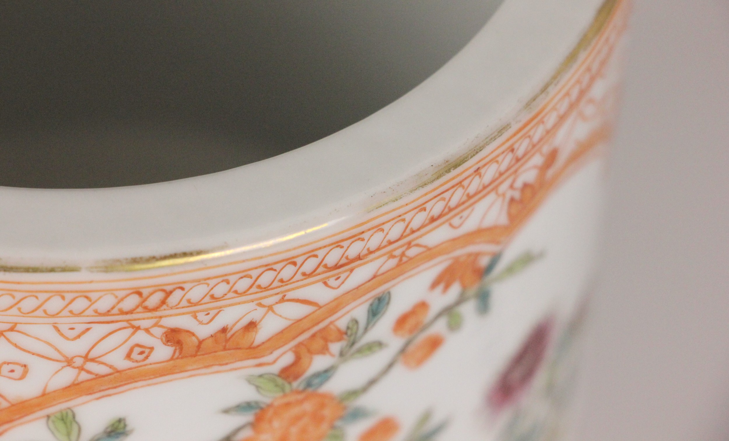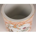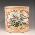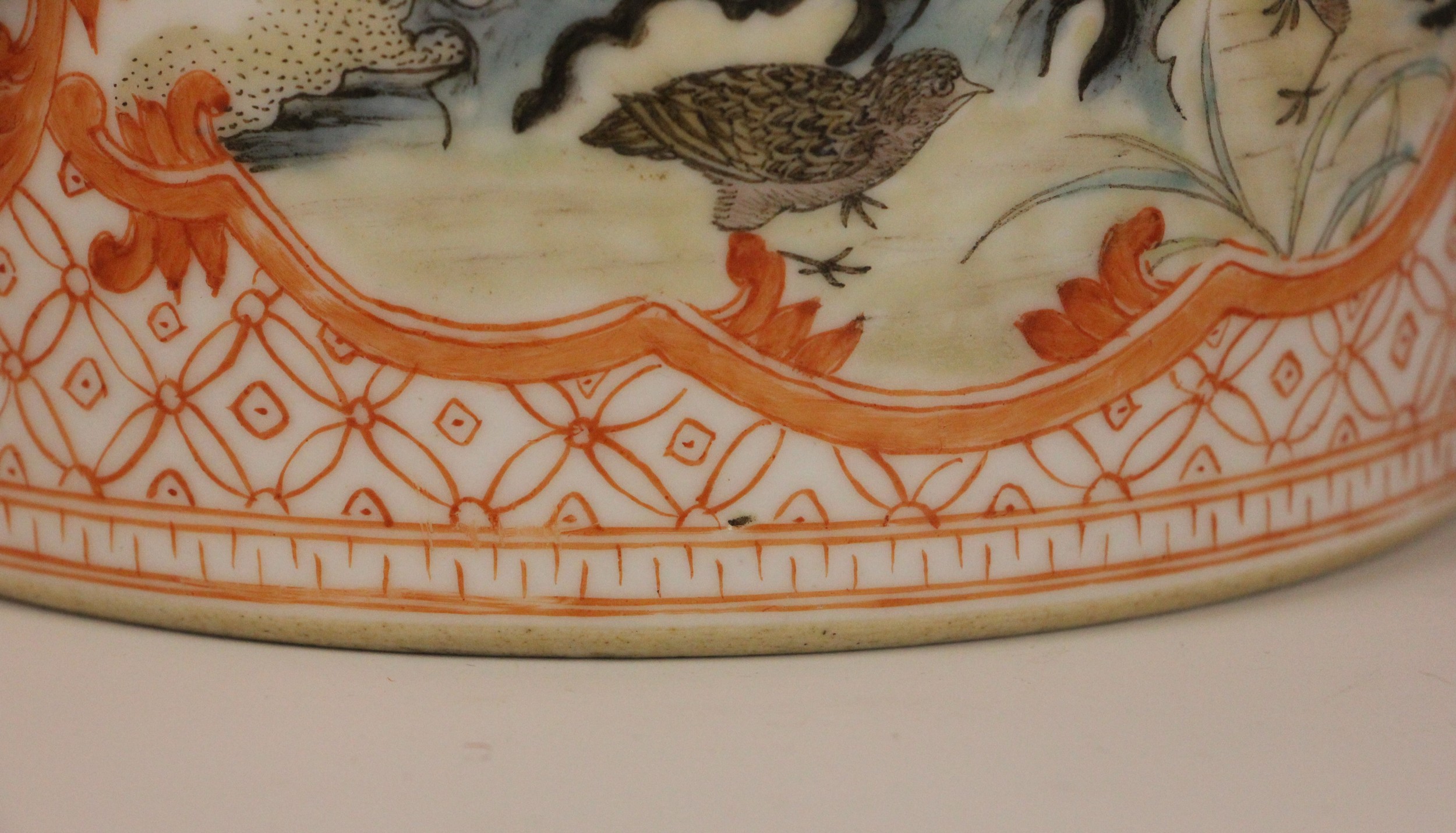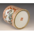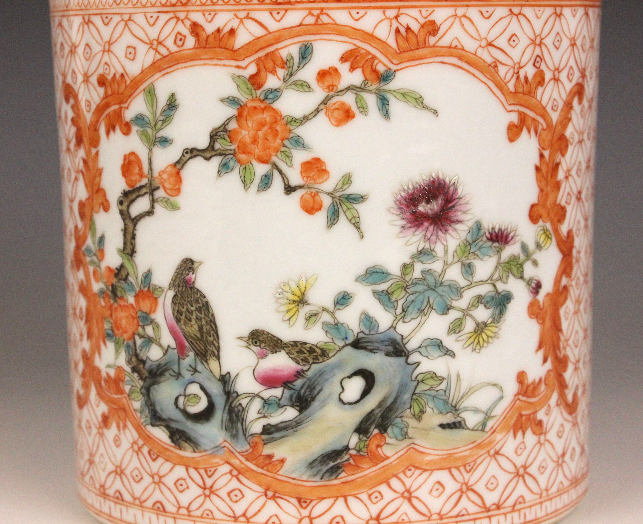 A Chinese porcelain iron-red brush pot (bitong), Qianlong seal mark, of cylindrical form and externally painted with two famille rose reserves depicting quail beside a rocky outcrop, iron-red seal mark to the underside, 13.5cm high