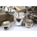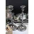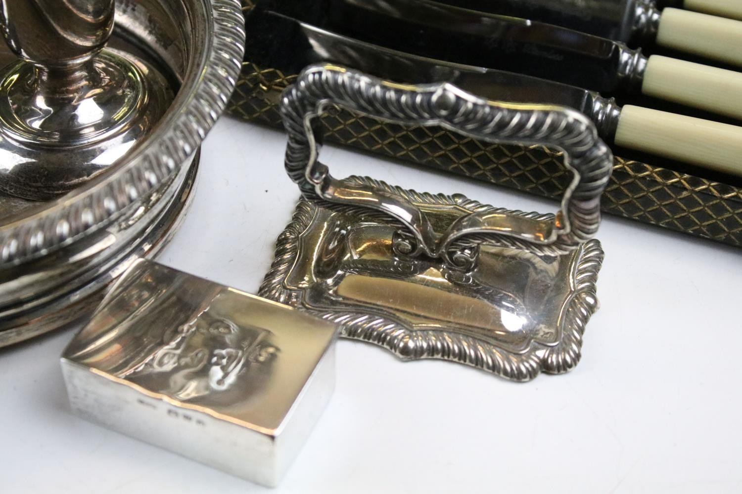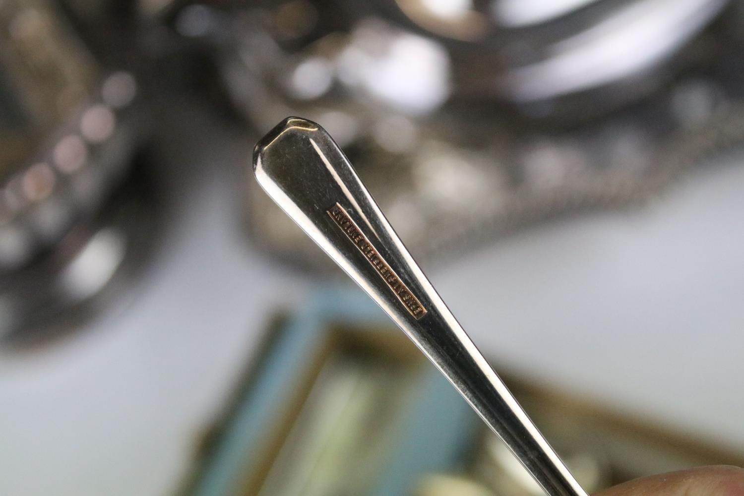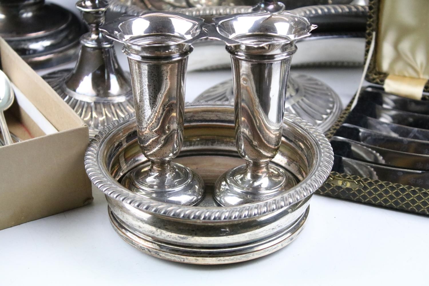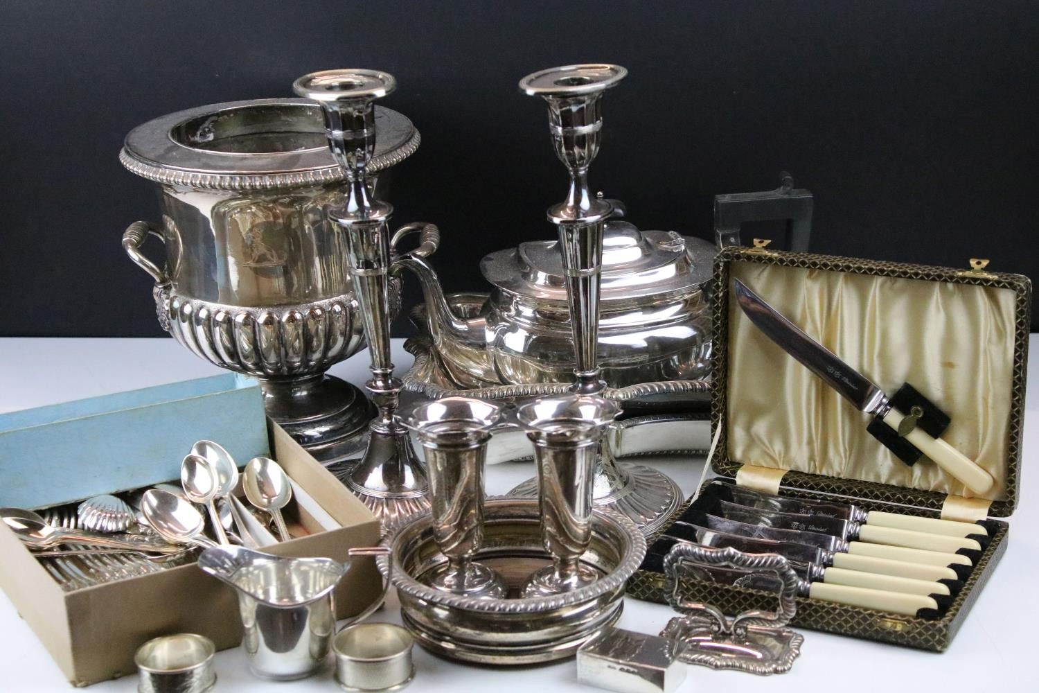 Collection of silver and silver plated items to include a Georgian silver hallmarked tea caddy spoon, three 19th Century silver hallmarked teaspoons, a silver hallmarked spill vase, small silver hallmarked box, twin handled ice bucket, pair of wine coasters, pair of candlestick holders, teapot, lidded tureen etc.