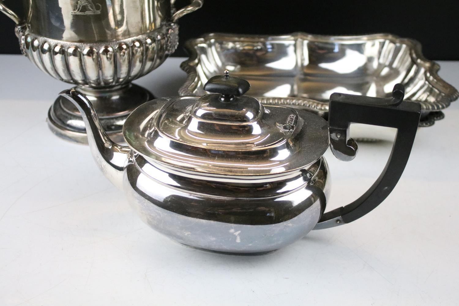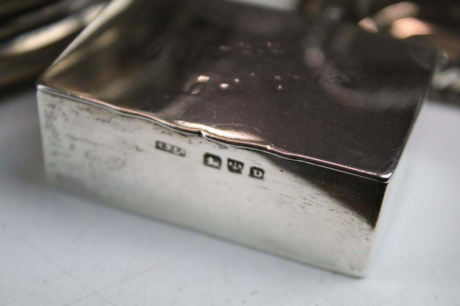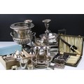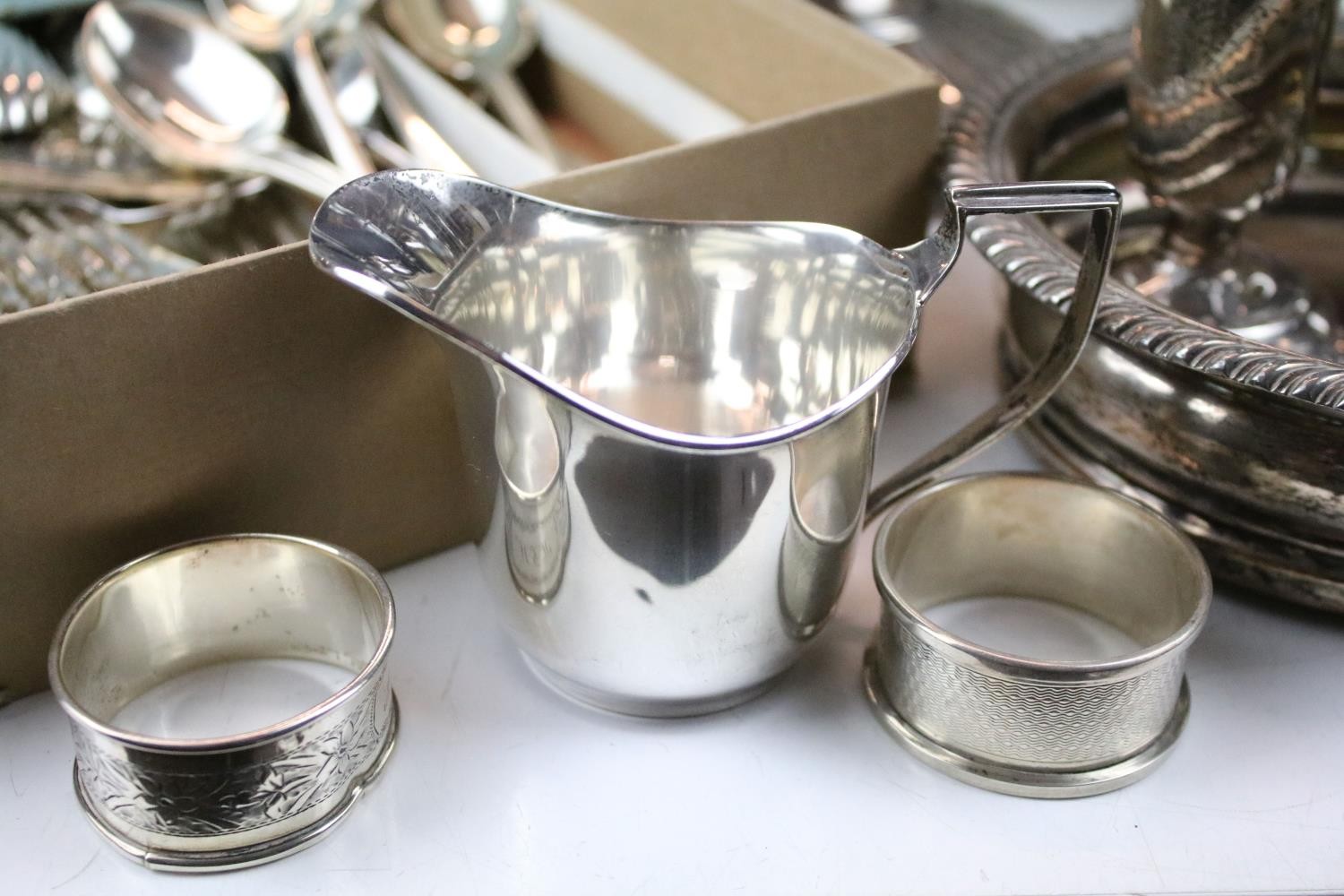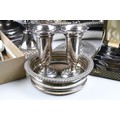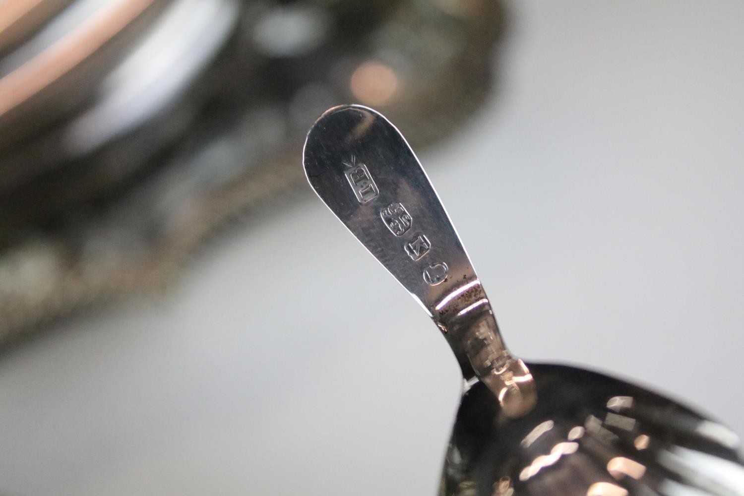 Collection of silver and silver plated items to include a Georgian silver hallmarked tea caddy spoon, three 19th Century silver hallmarked teaspoons, a silver hallmarked spill vase, small silver hallmarked box, twin handled ice bucket, pair of wine coasters, pair of candlestick holders, teapot, lidded tureen etc.