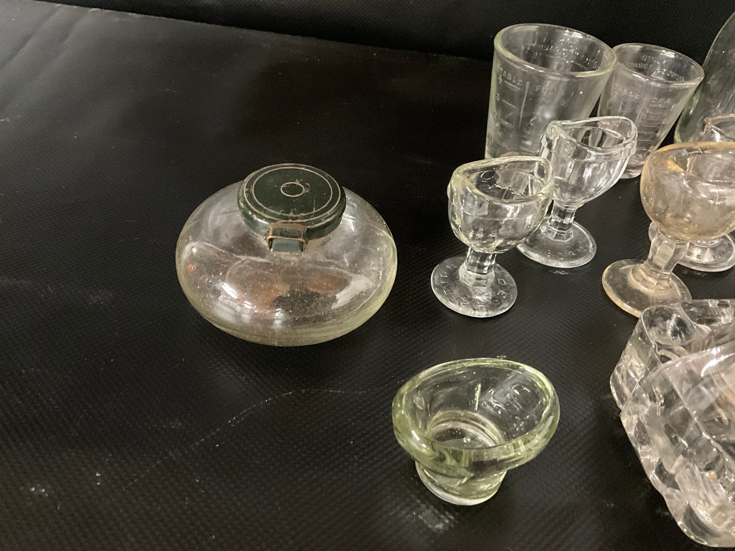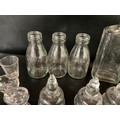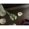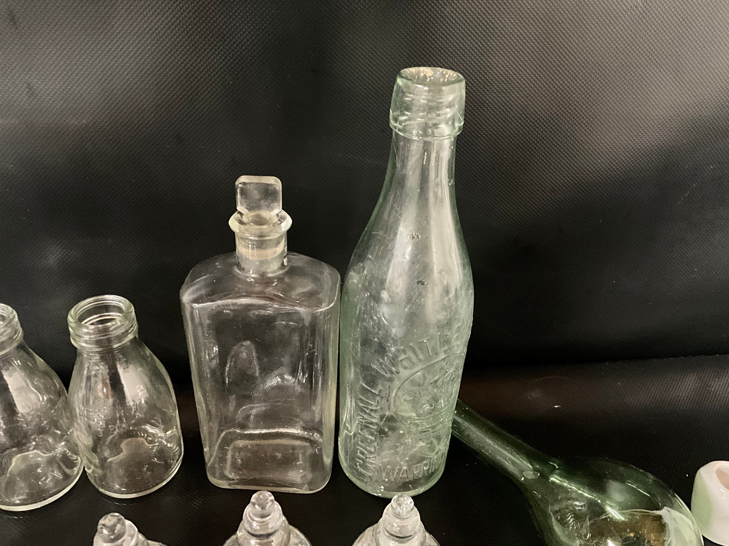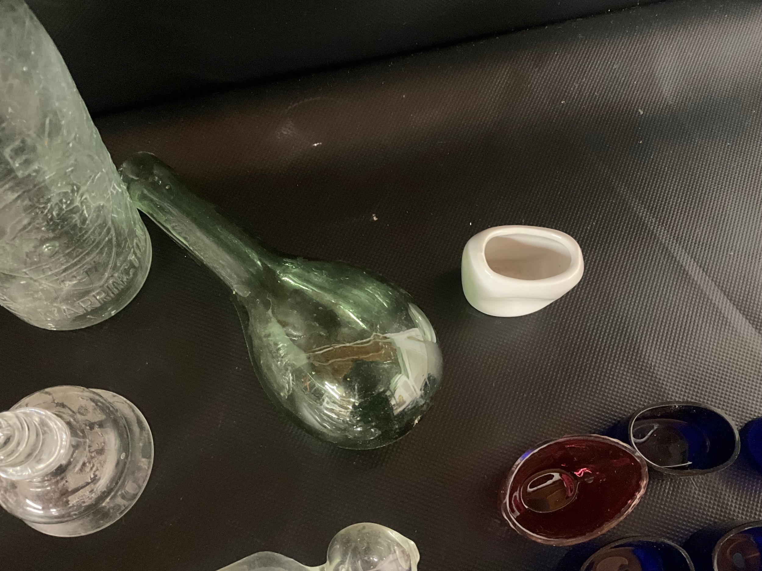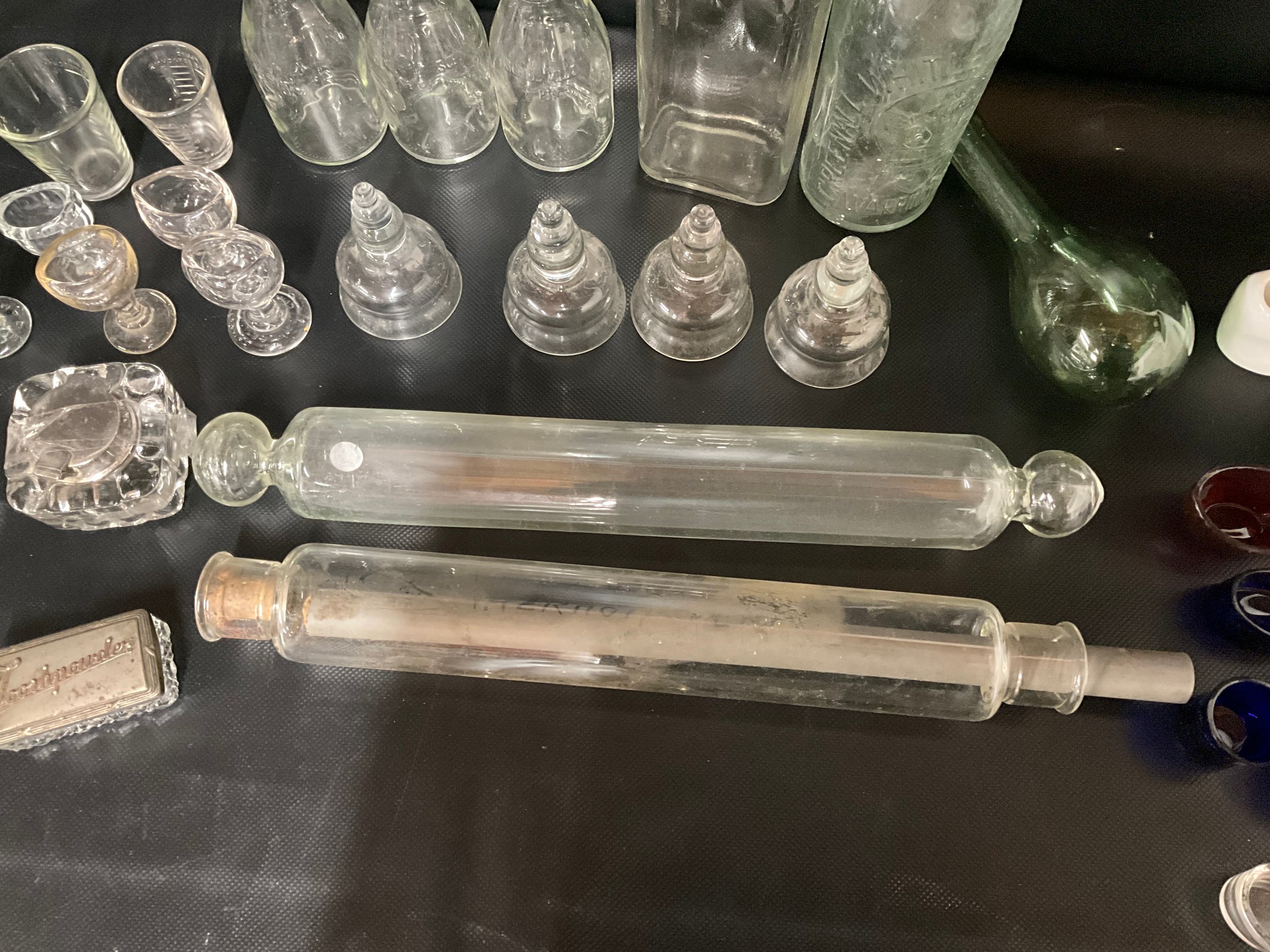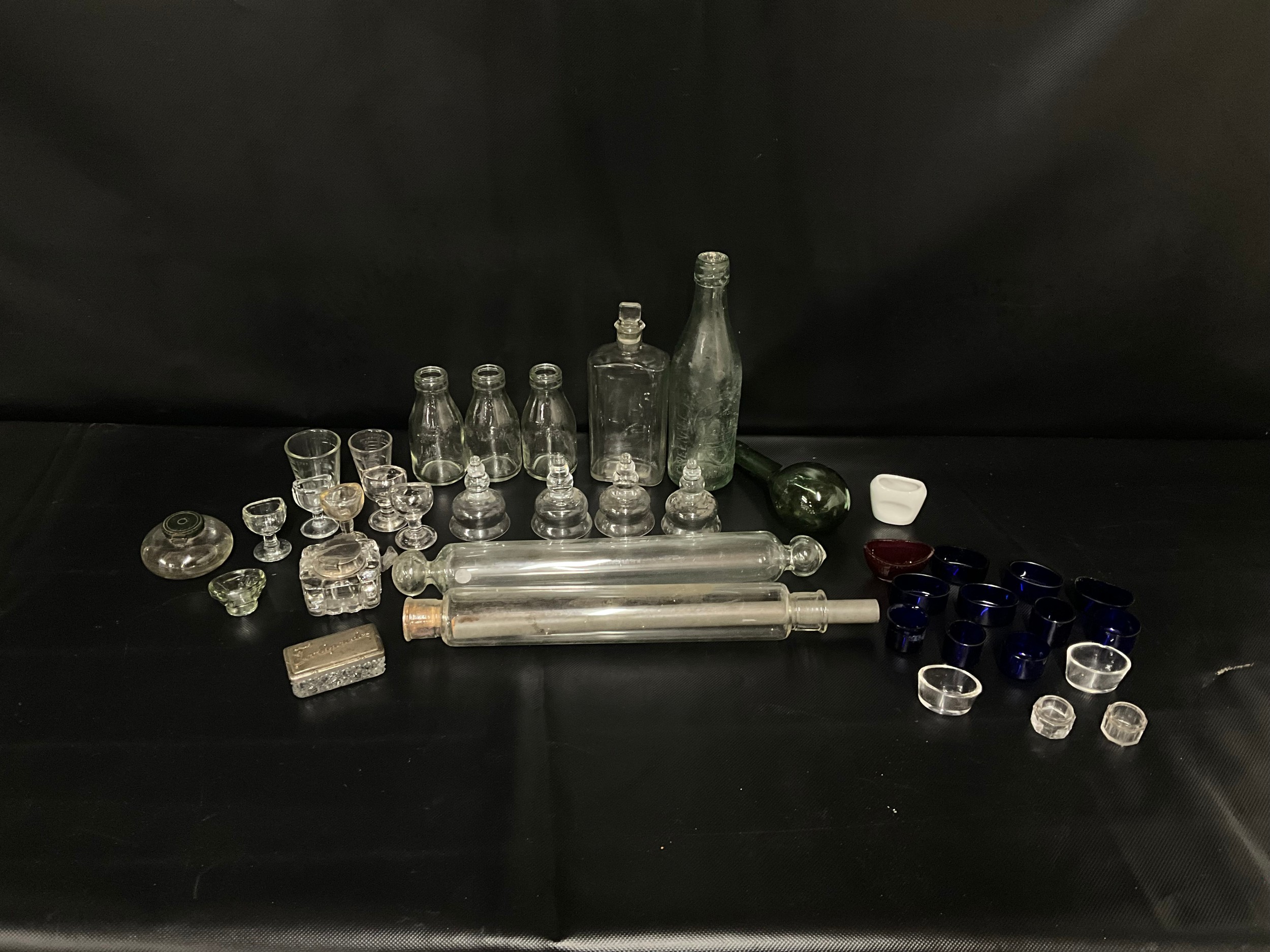 BOX OF VICTORIAN AND LATER GLASSWARE TO INCLUDE INKWELLS, EYE GLASSES, ROLLING PINS, COLOURED GLASS AND GREENALL & WHITLEY & CO WARRINGTON ADVERTISING BOTTLE