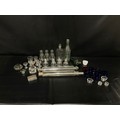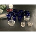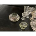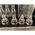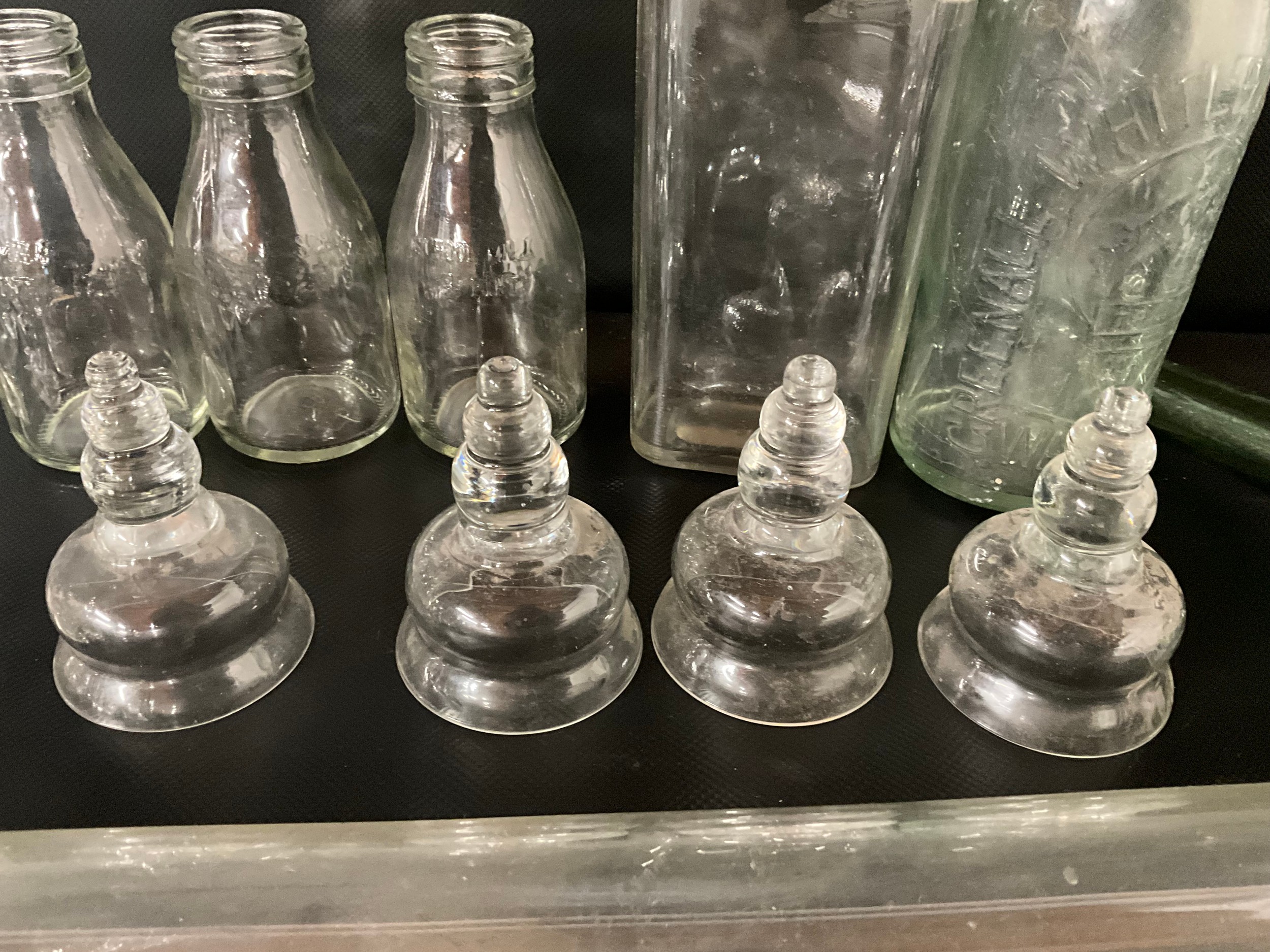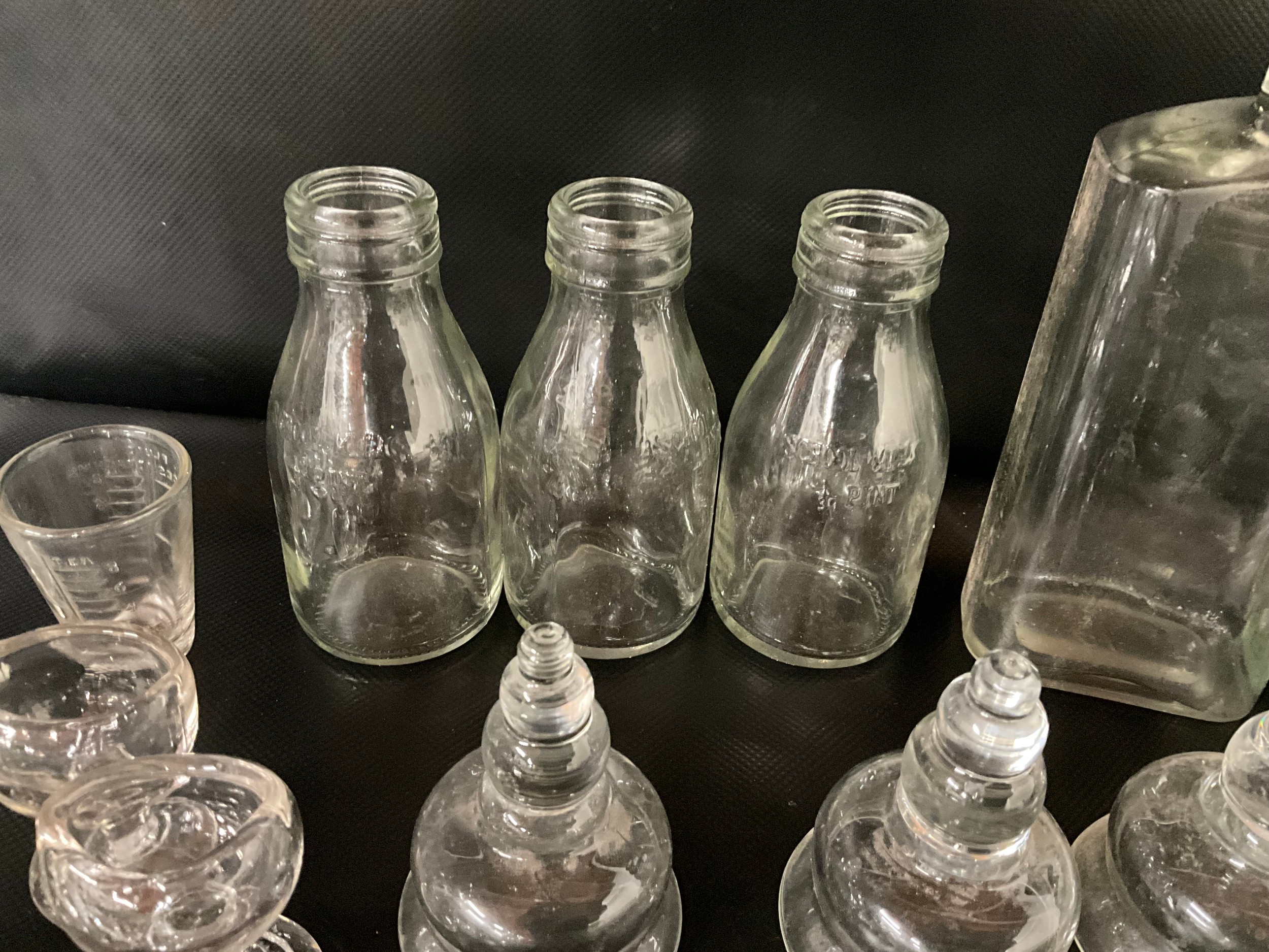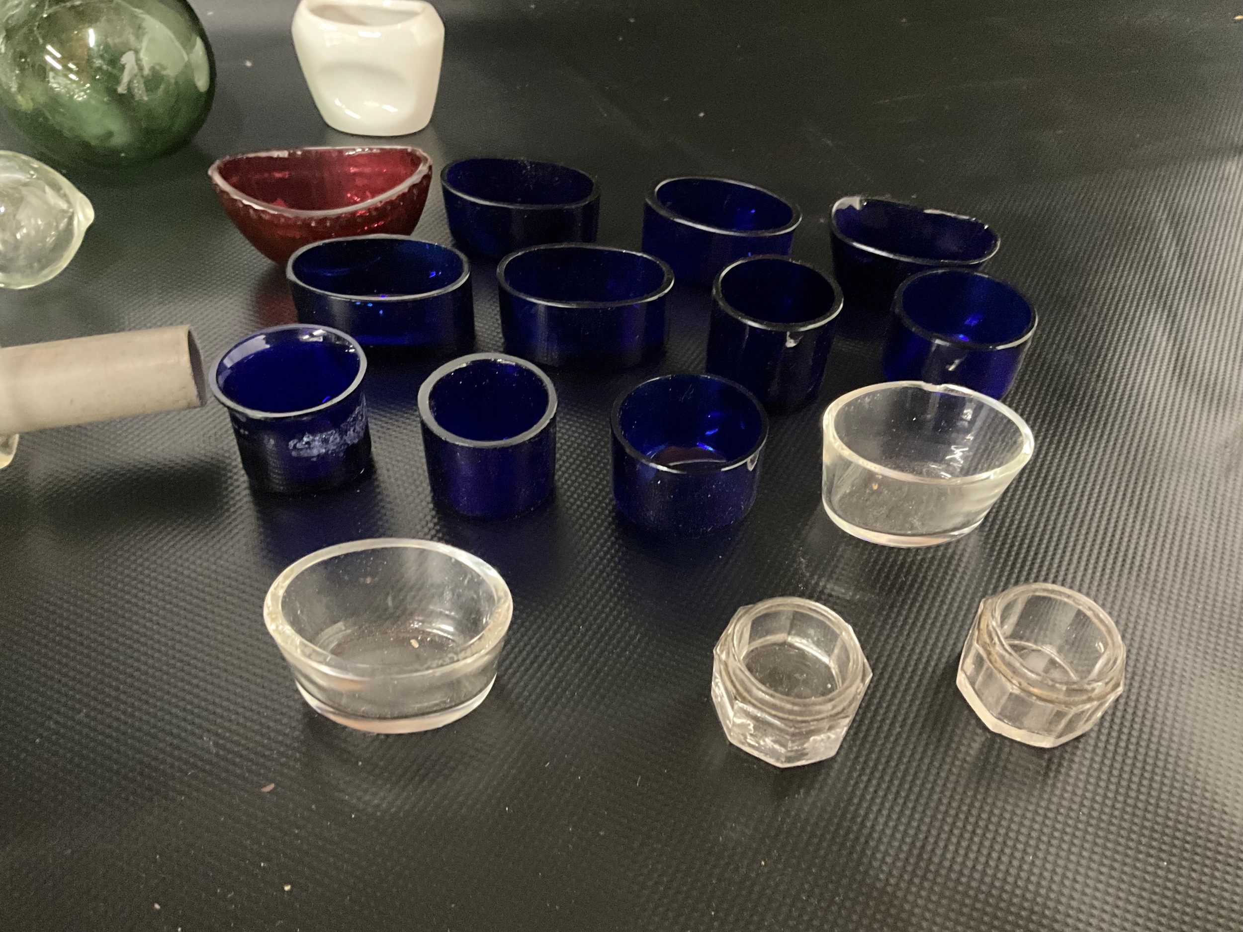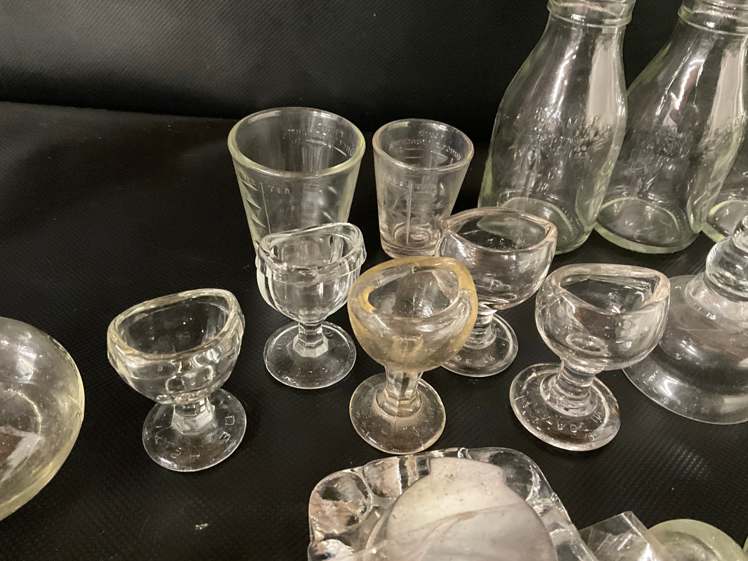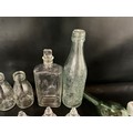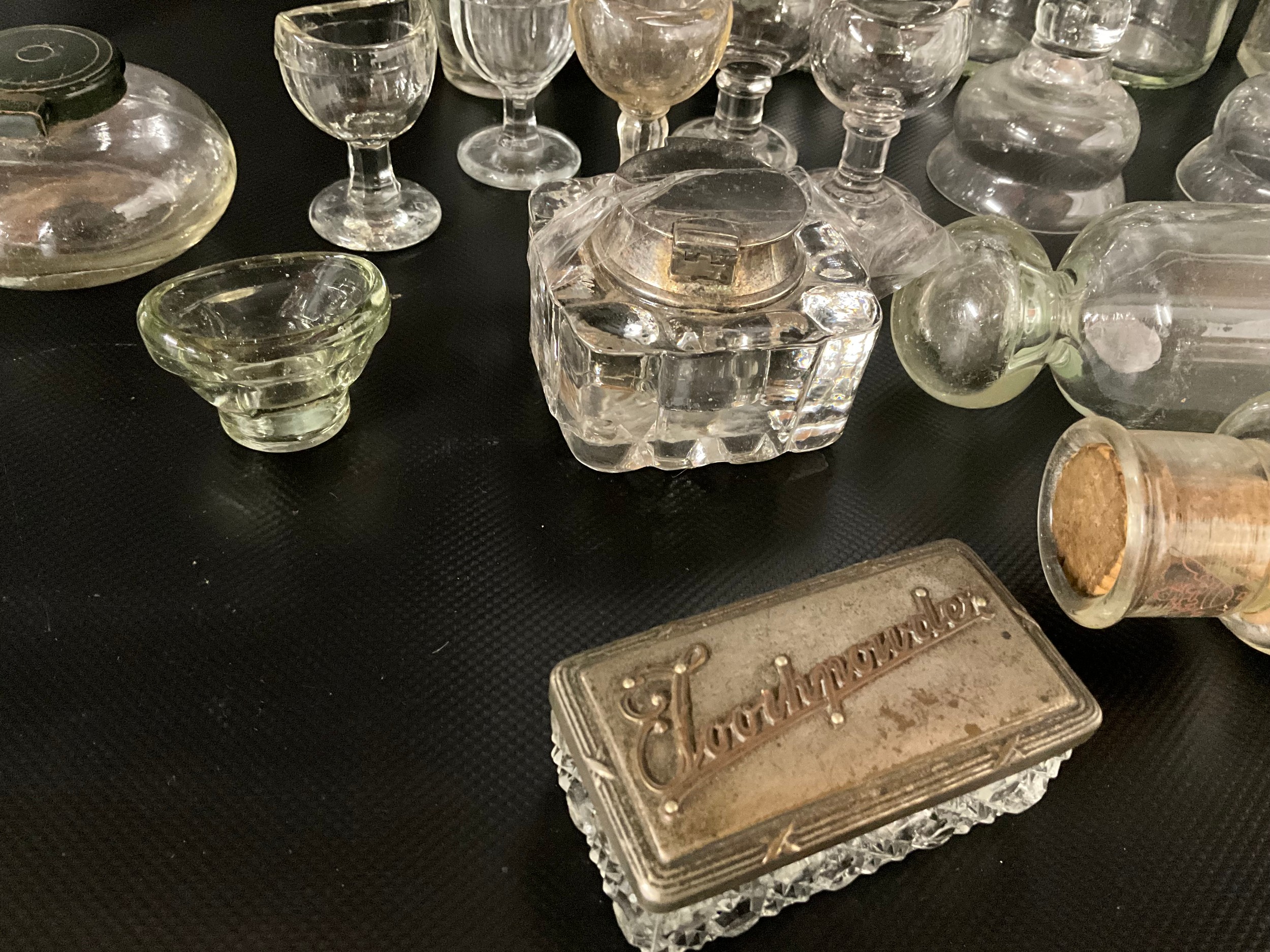 BOX OF VICTORIAN AND LATER GLASSWARE TO INCLUDE INKWELLS, EYE GLASSES, ROLLING PINS, COLOURED GLASS AND GREENALL & WHITLEY & CO WARRINGTON ADVERTISING BOTTLE