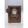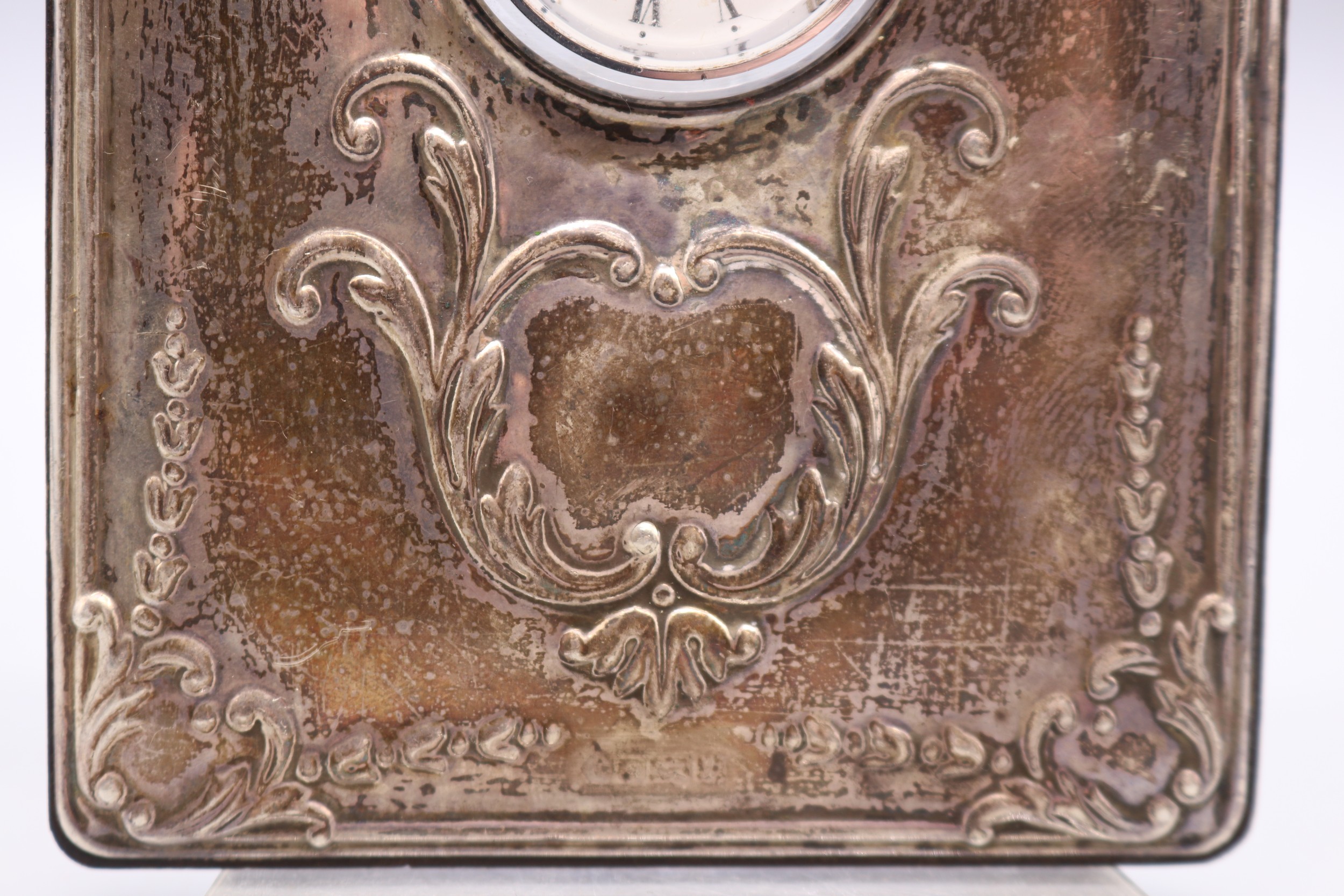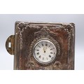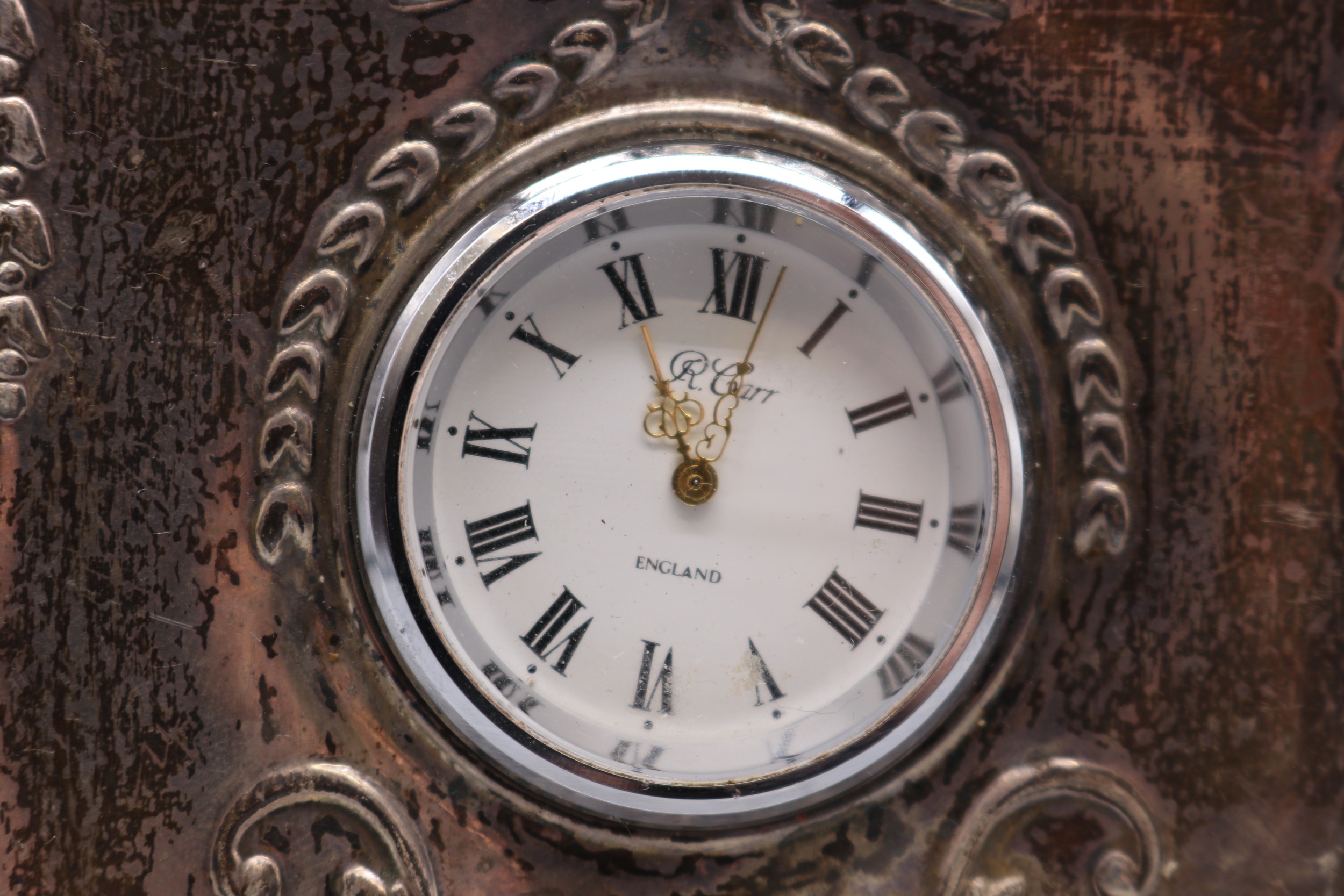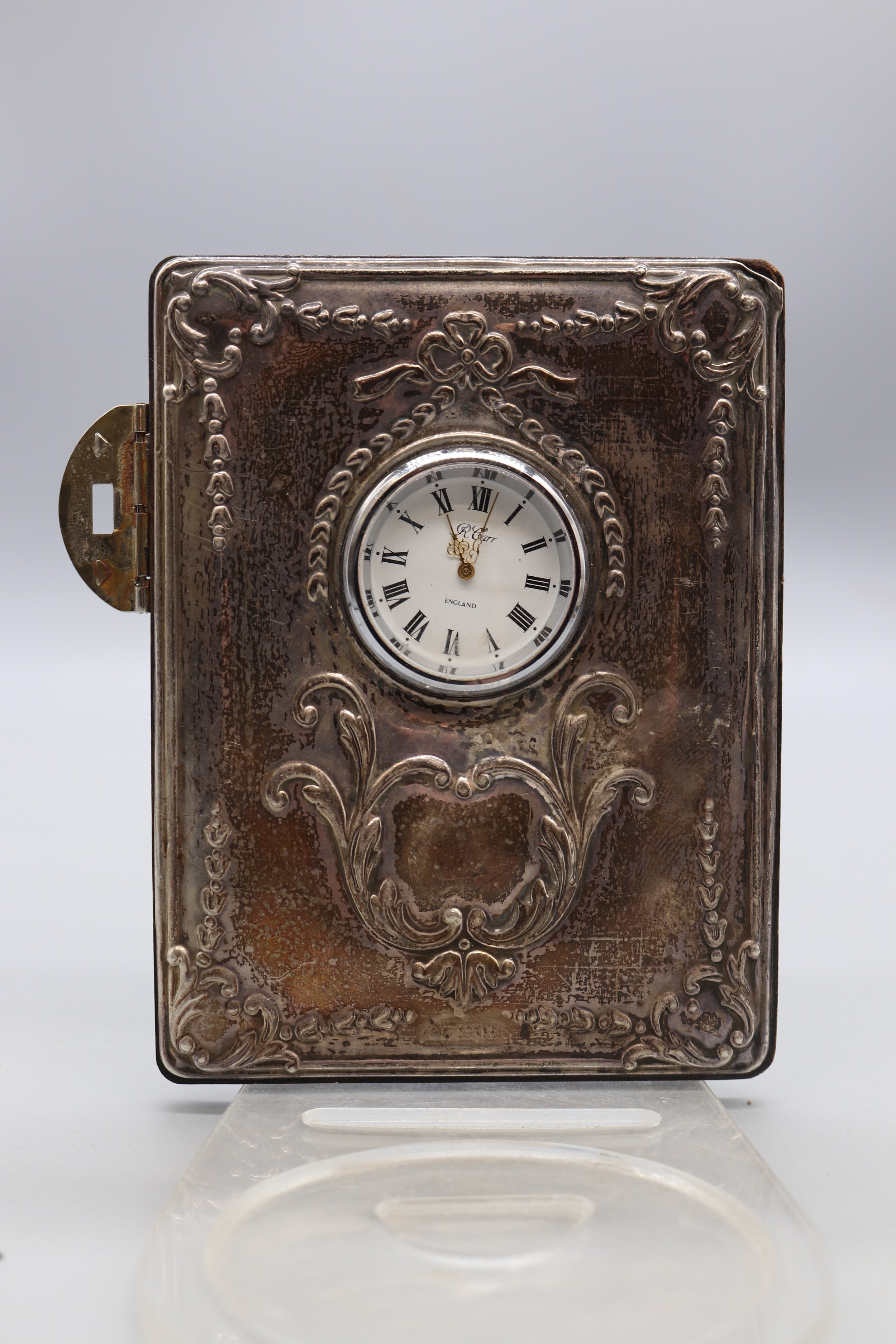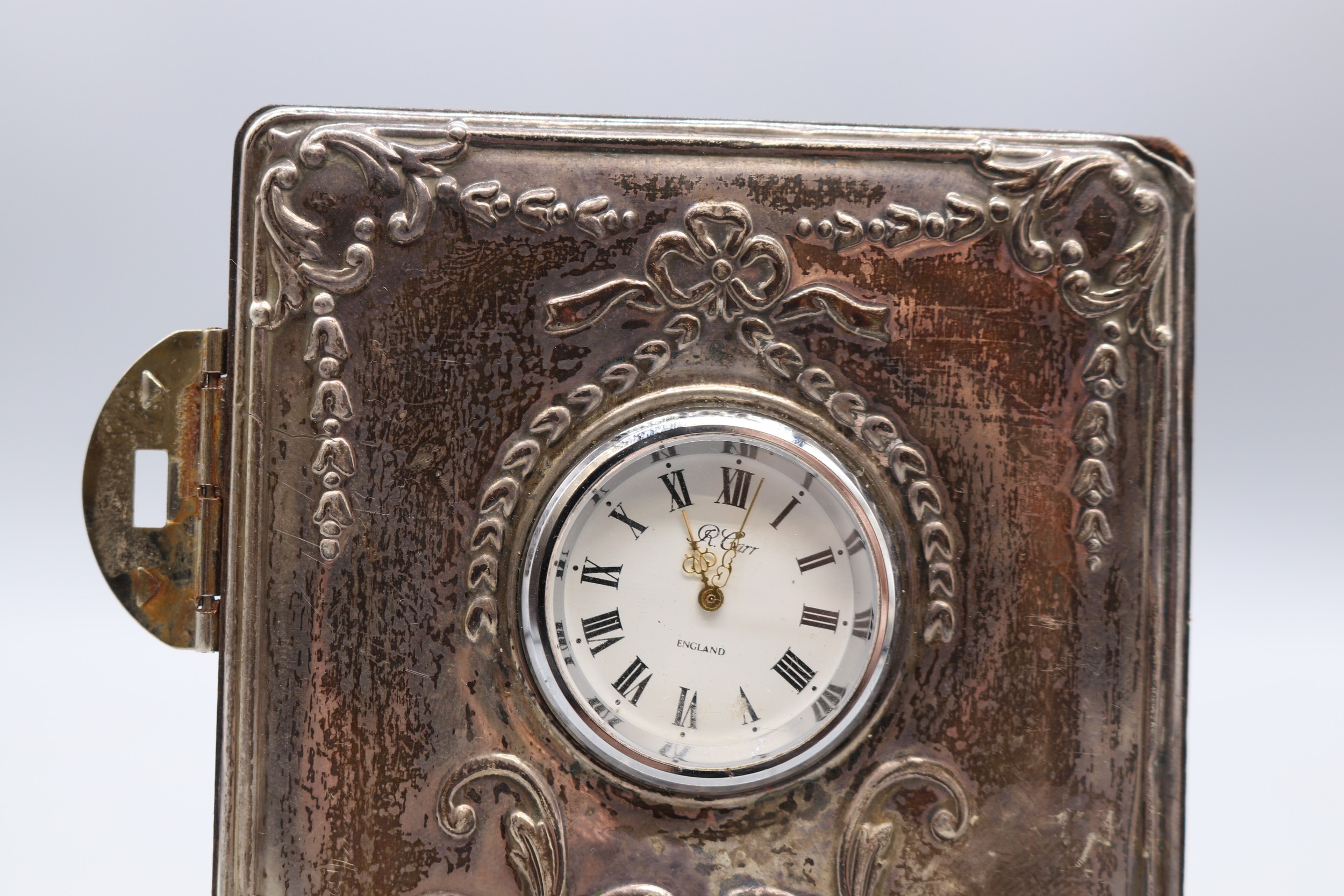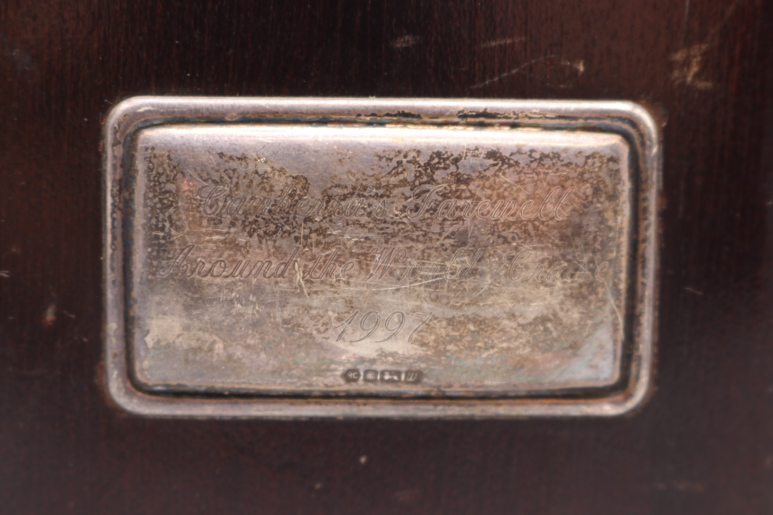 Silver hallmarked front R.Carr of England clock (hallmarks rubbed) with silver hallmarked presentation plaque to back 'Canberra's Farewell Around the World Cruise 1997' R.C. Sheffield