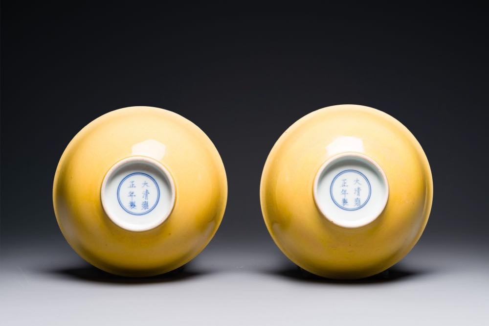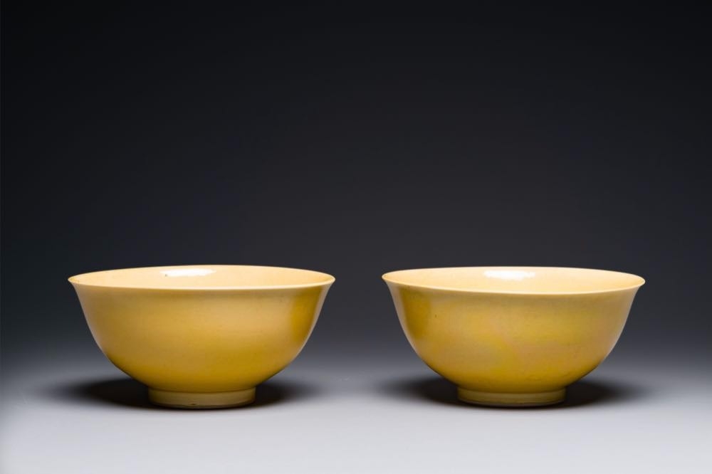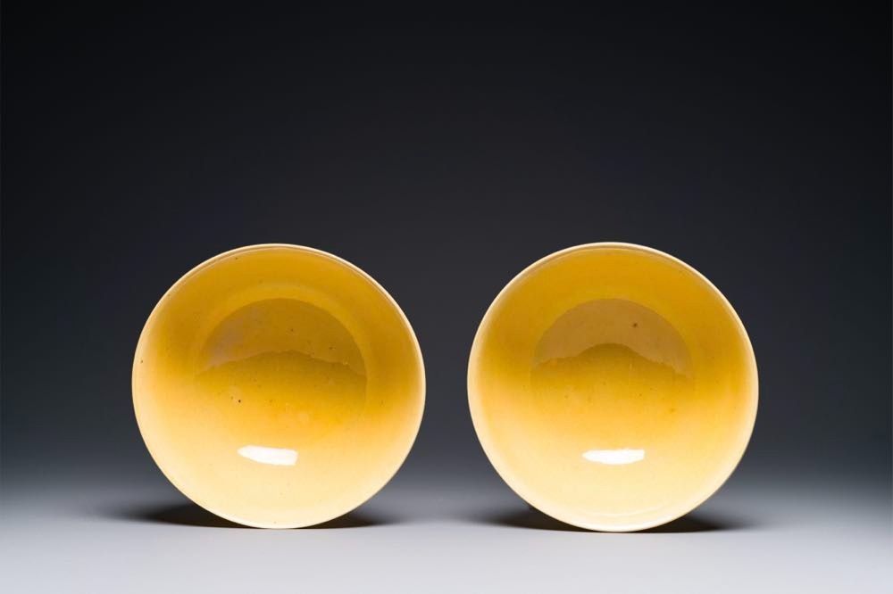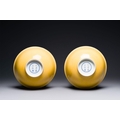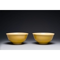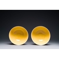 A pair of Chinese monochrome yellow-glazed bowls, Yongzheng mark, 19th C