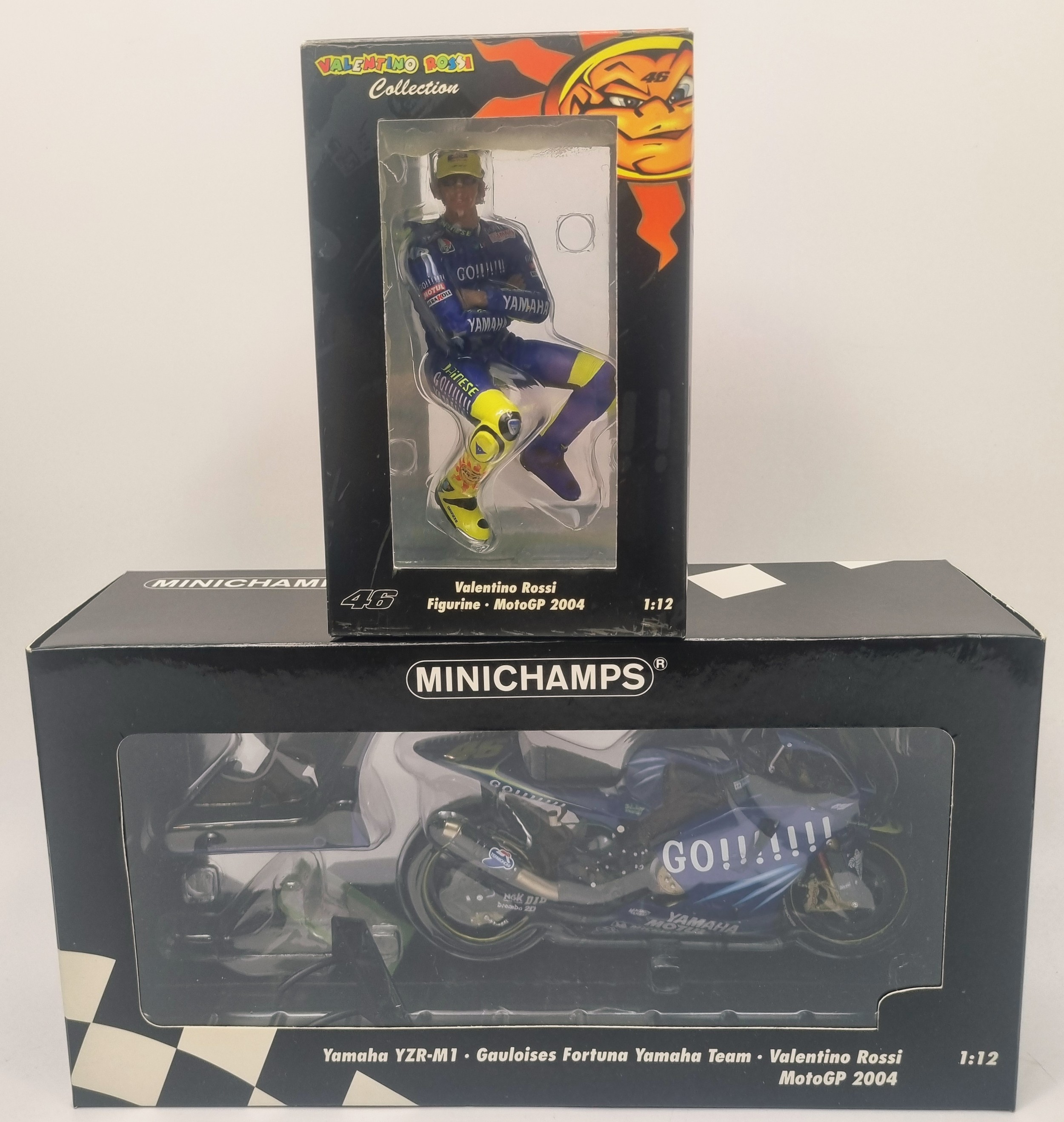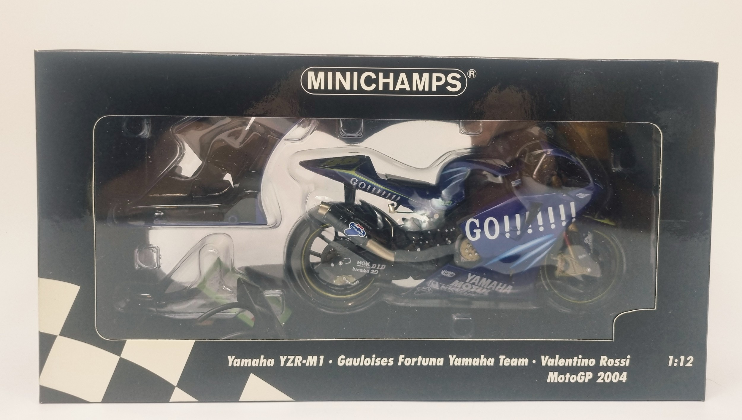 Minichamps Pauls Model 1:12 scale Valentino Rossi Yamaha YZR-M1 Gauloises Fortuna Yamaha Team 2004 bike & figure.