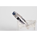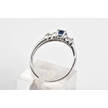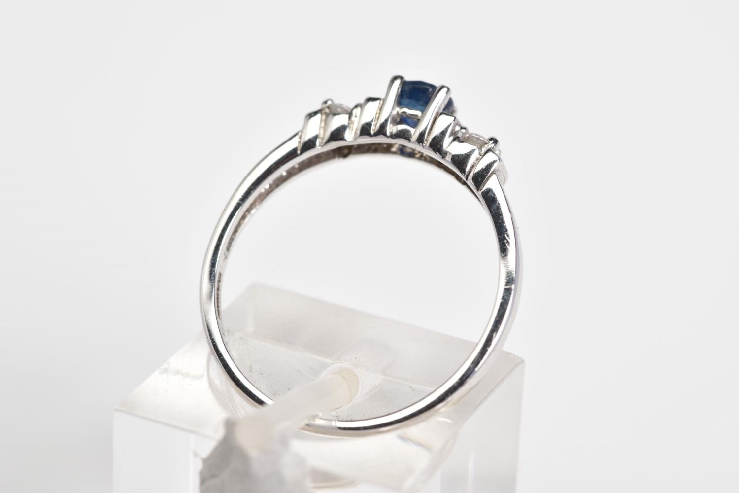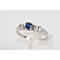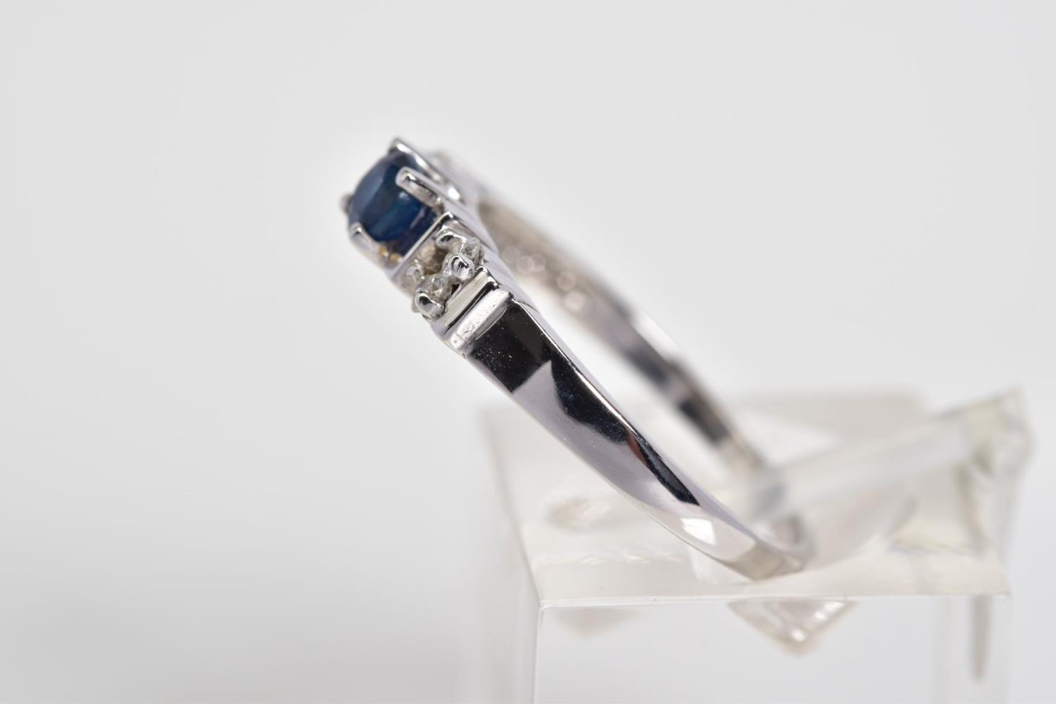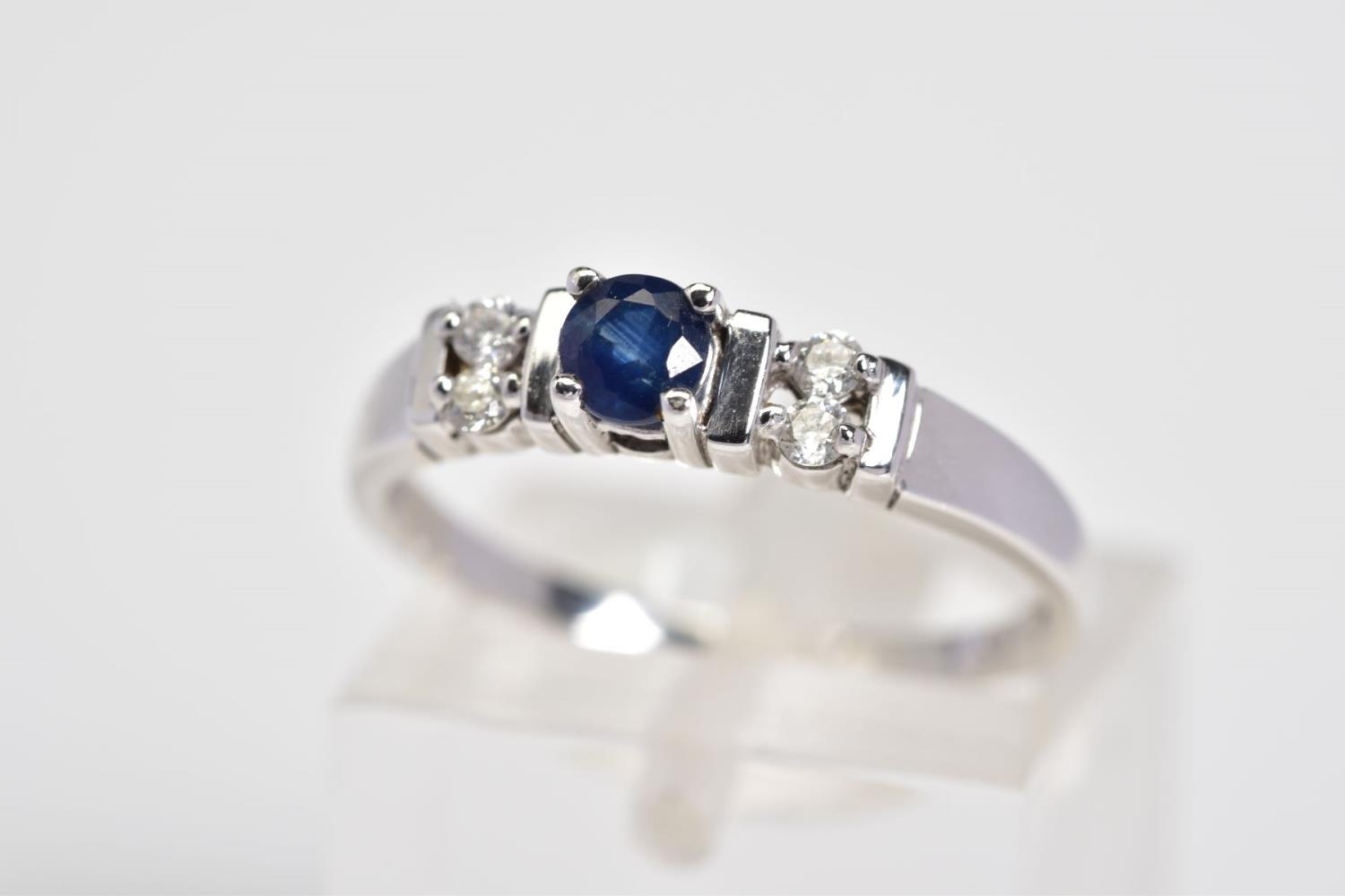 A 9CT WHITE GOLD SAPPHIRE AND DIAMOND RING, designed with a central claw set circular cut sapphire, flanked with round brilliant cut diamonds, with a 9ct hallmark for London, ring size M, approximate weight 2.0 grams