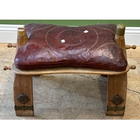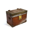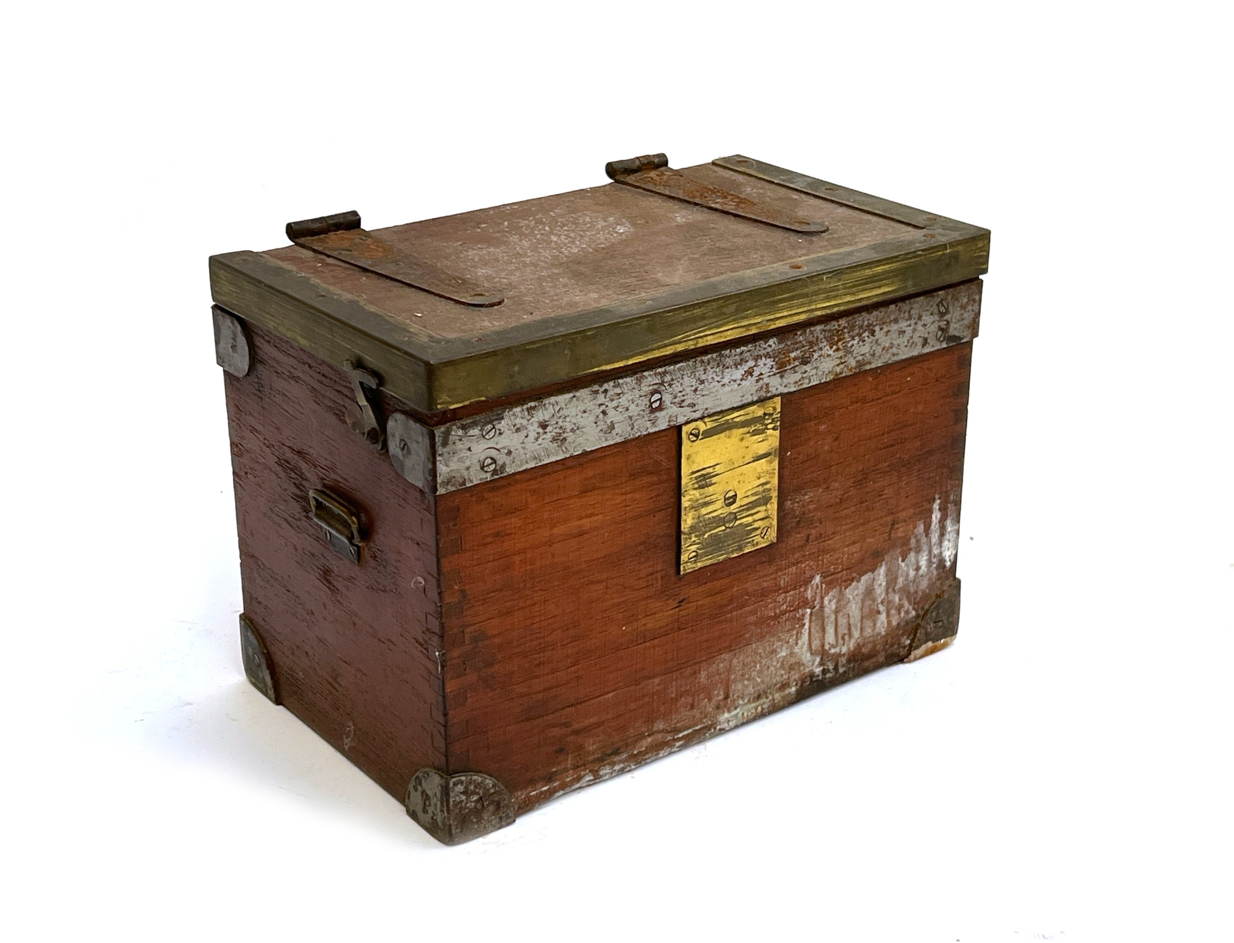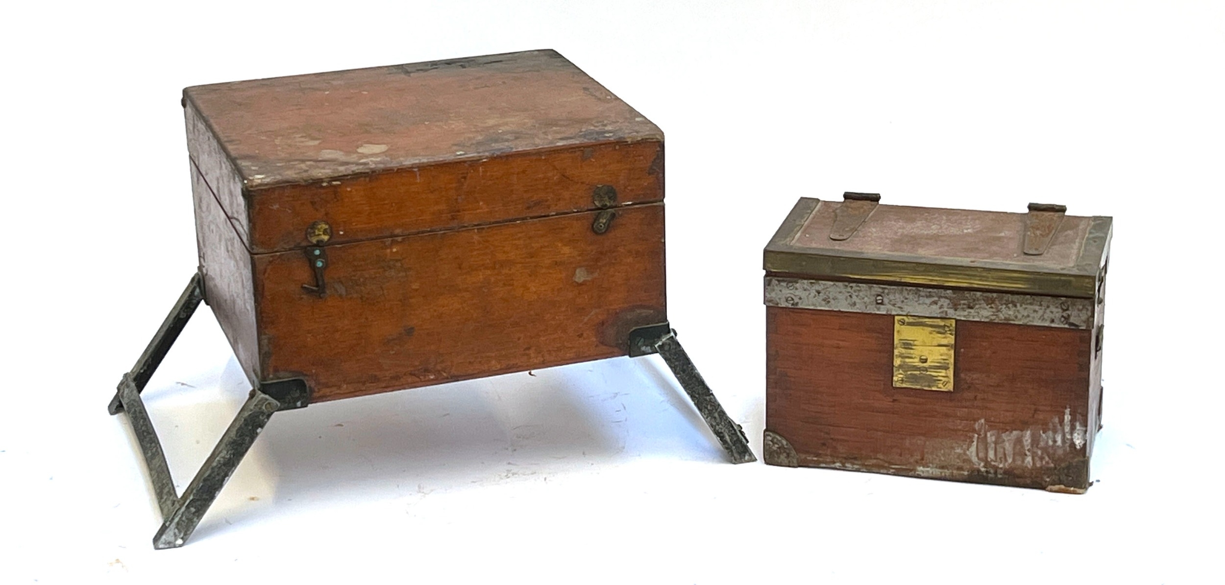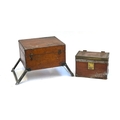 A teak, brass, and steel bound case/box, 28cm wide; together with a dovetailed teak box with foldout legs, 35cmW