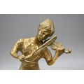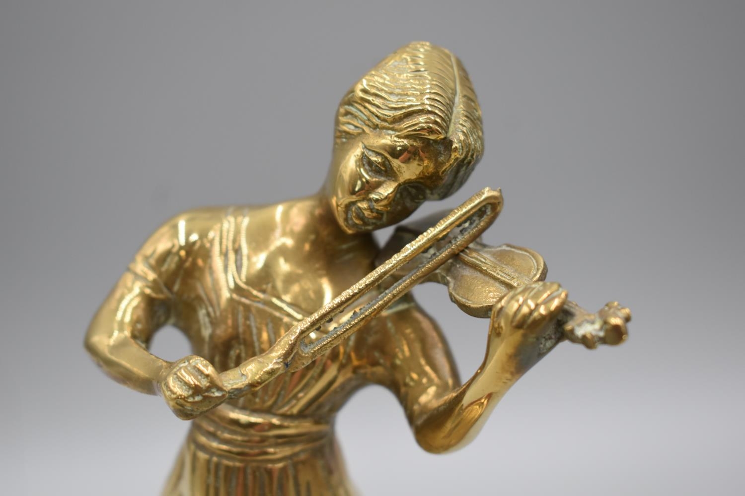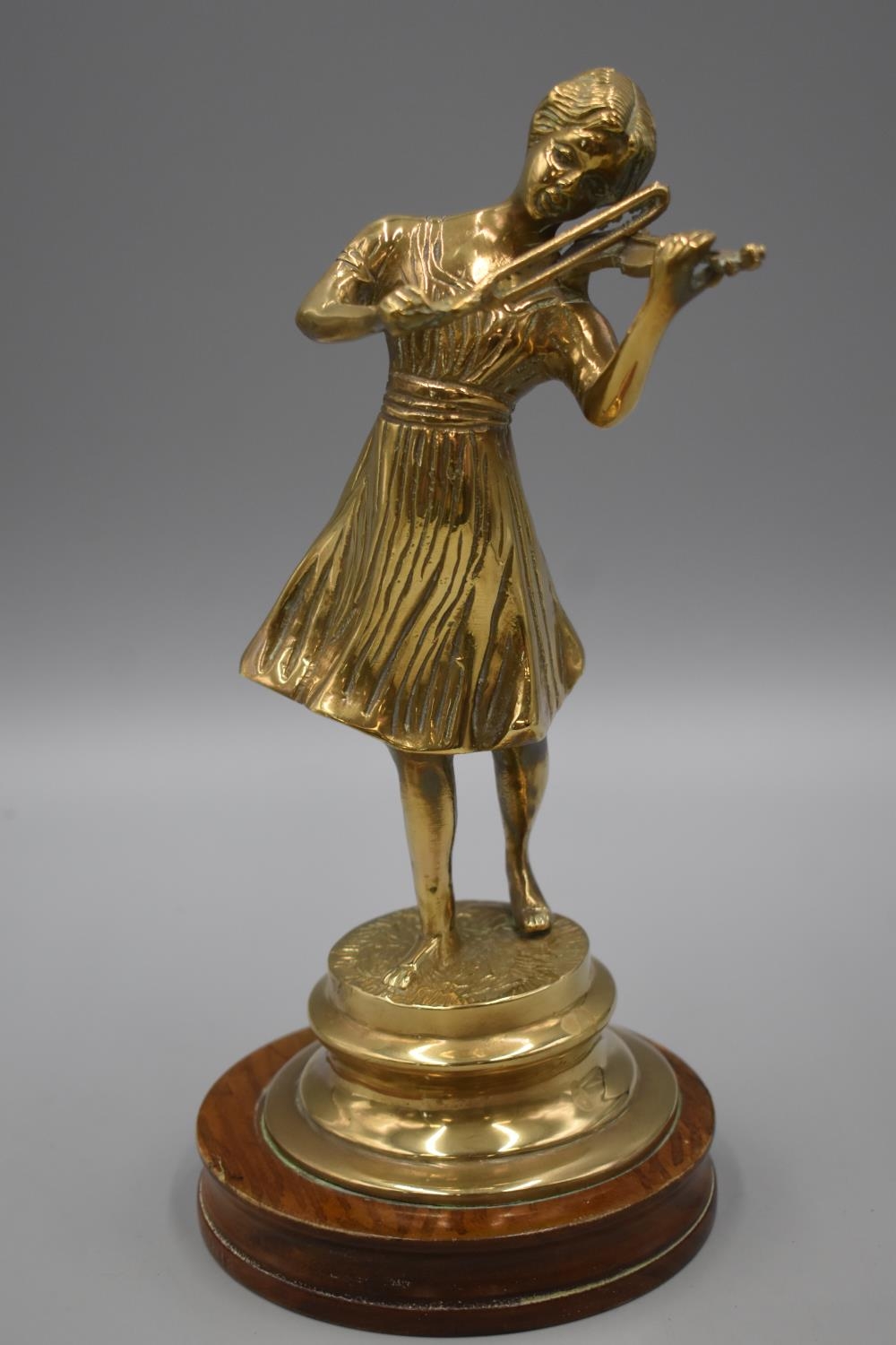 Brass Figure of Girl Playing Violin standing on Wooden Plinth (11")