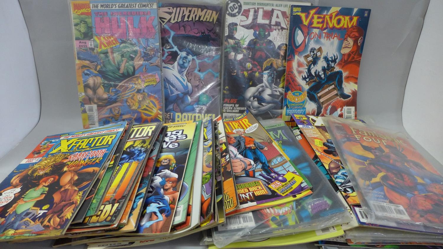 A collection of over 50 Marvel and DC comics including The Hulk, X-Men, etc.