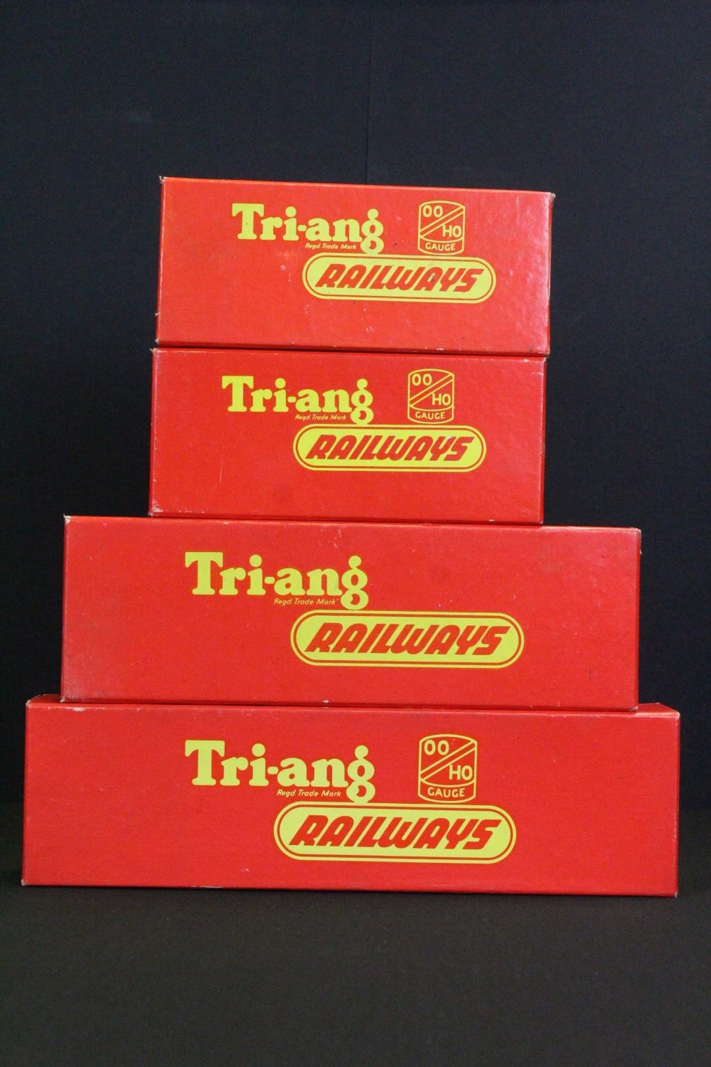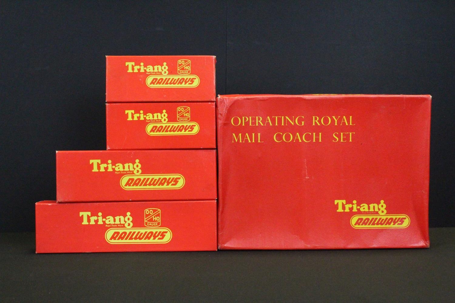 Four boxed Triang OO gauge locomotives to include R350 4-4-0 Class L1 Loco green livery, R157 Diesel Power Car, R251 0-6-0 Class 3F Tender Loco and R59 2-6-2 Tank Loco Black Livery plus a boxed Triang R23 Operating Royal Mail Coach Set (5)