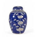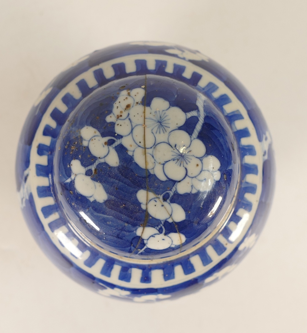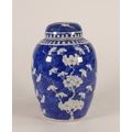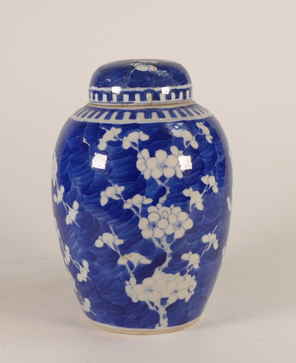 18th Century Chinese porcelain ginger jar decorated with prunus, probably Kangxi period 1662-1722, h.22cm, cover a/f.