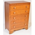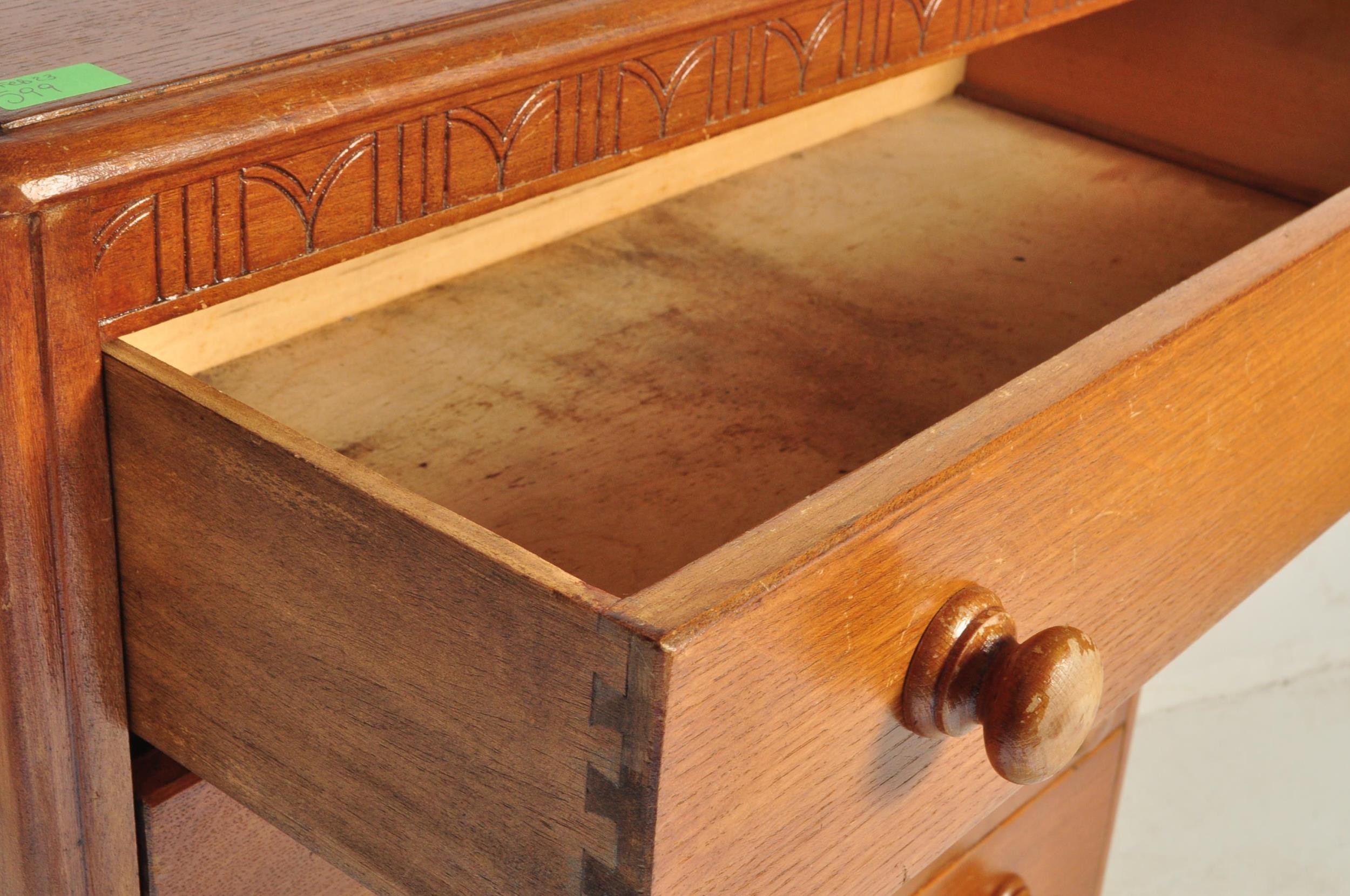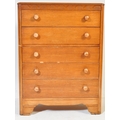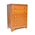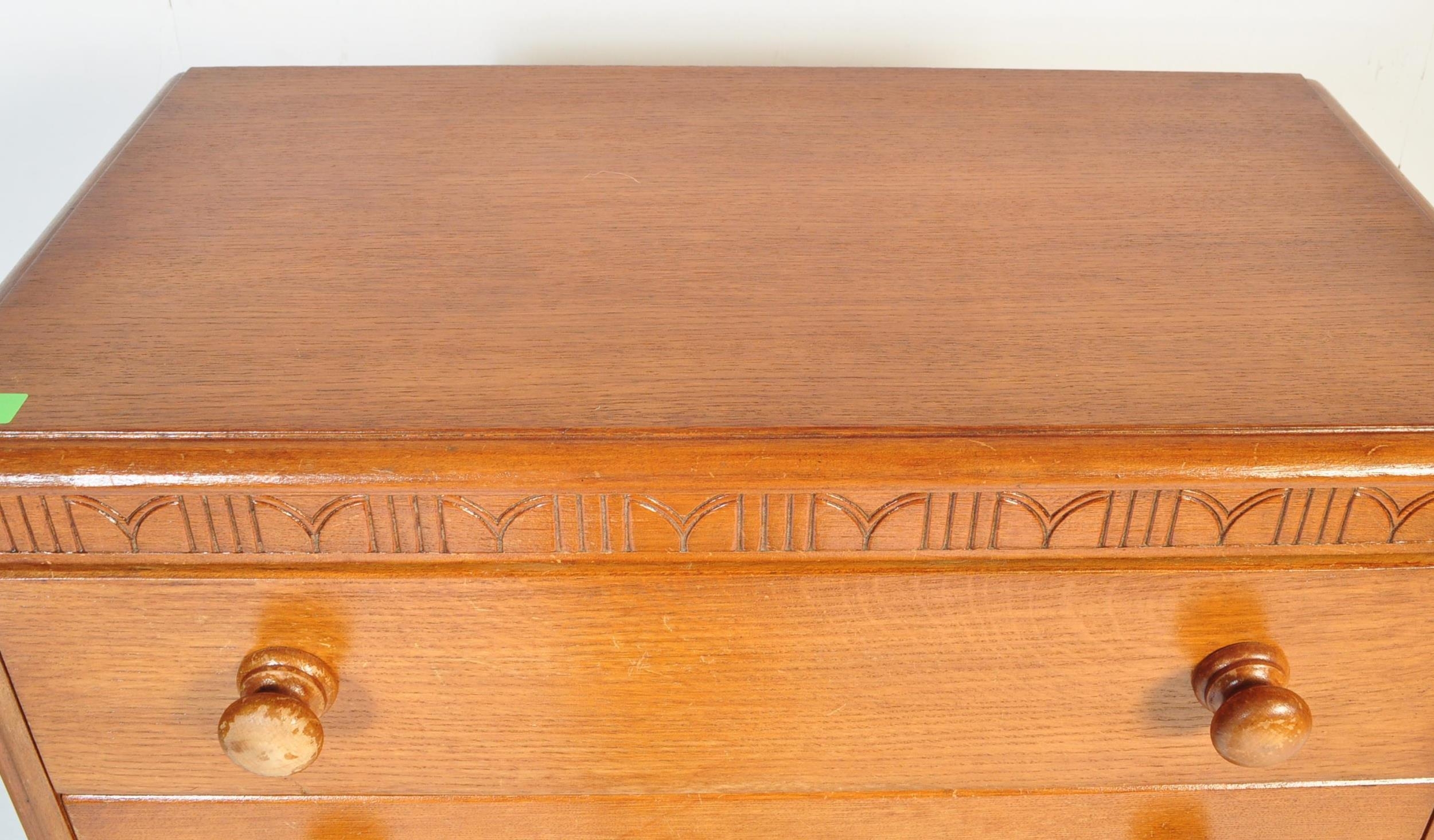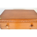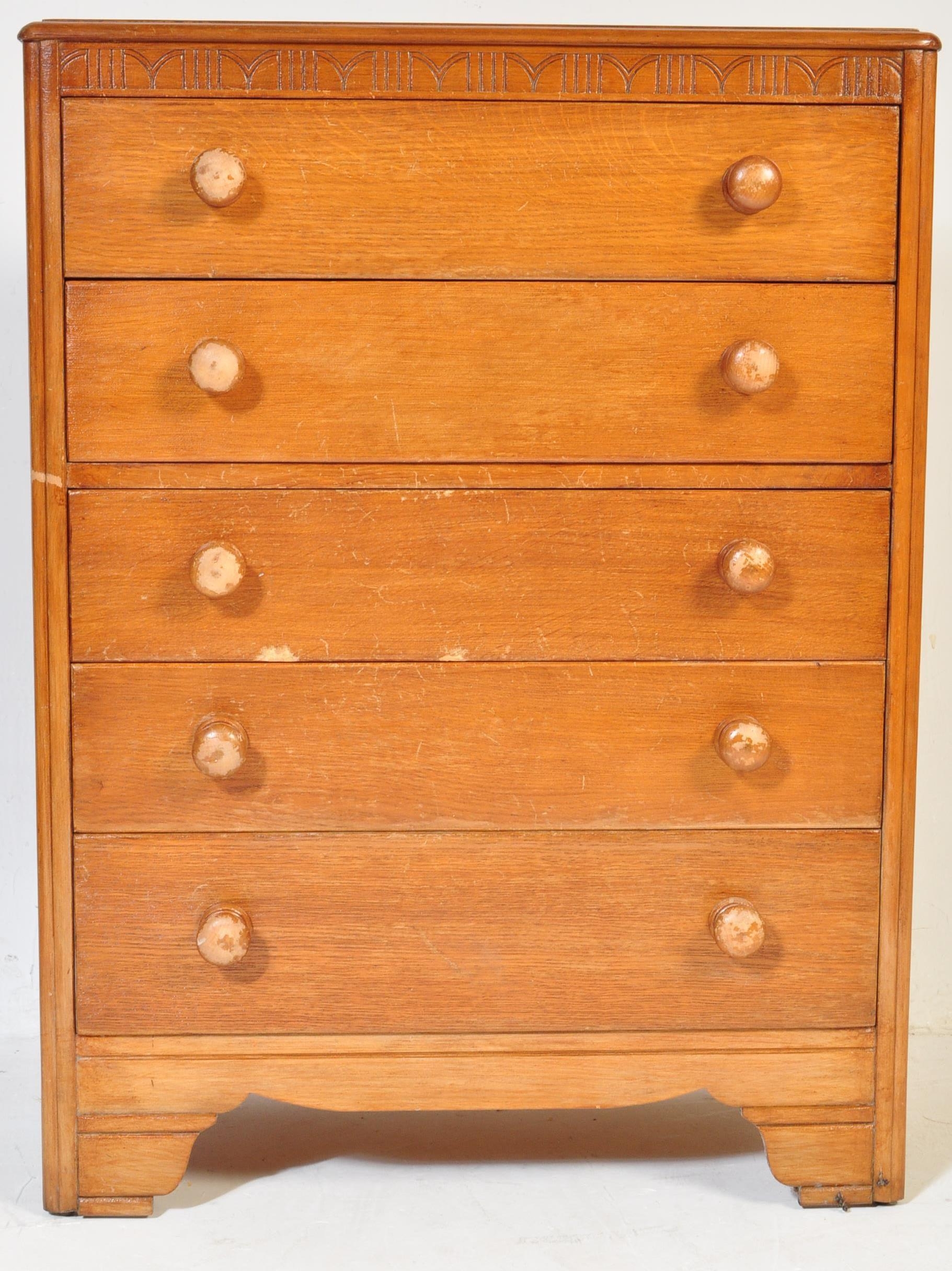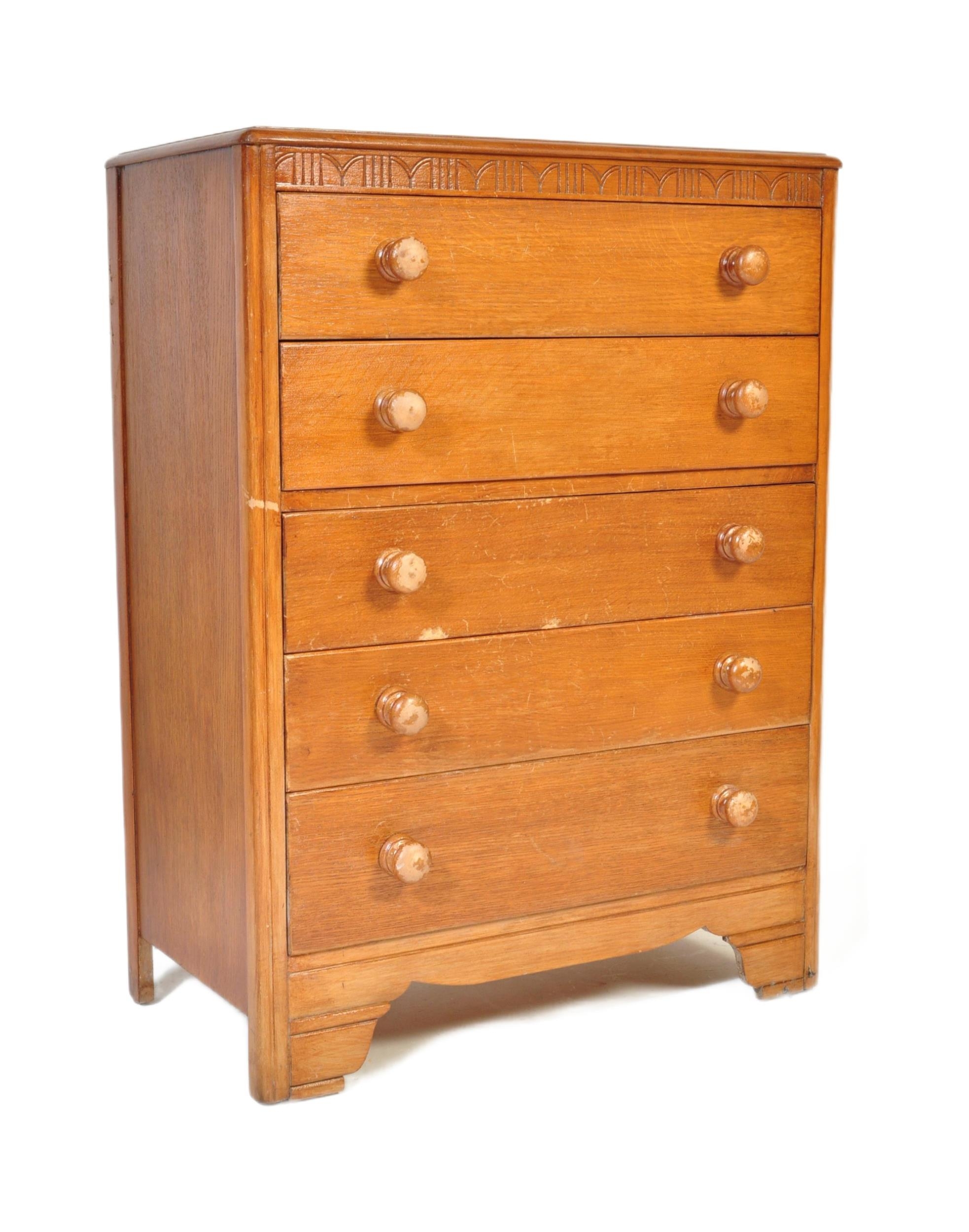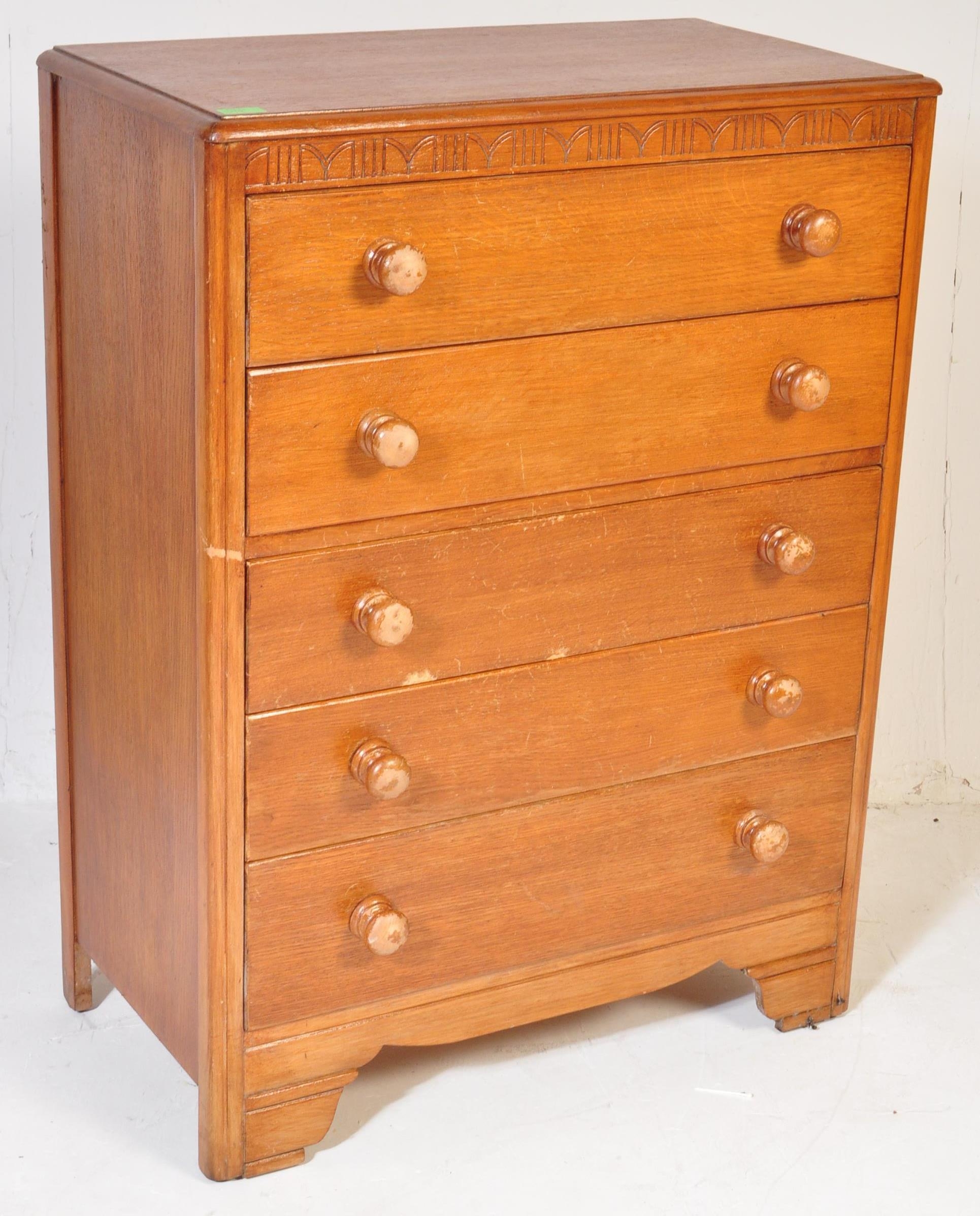 A vintage 20th century circa 1940s light oak chest of drawers having a carved floral frieze over a bank of five drawers with twin pull handles. Raised on bracket feet.
