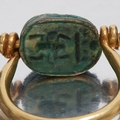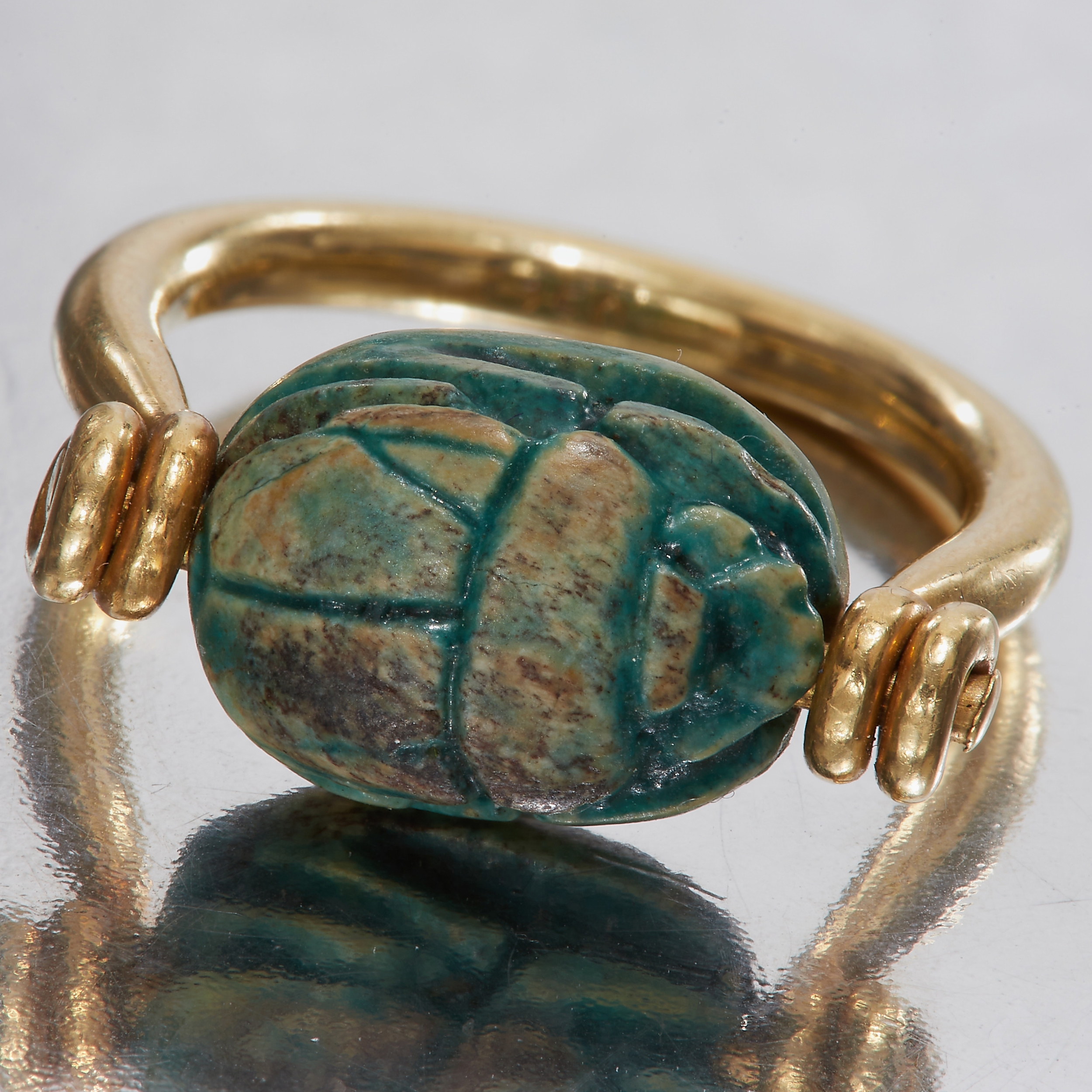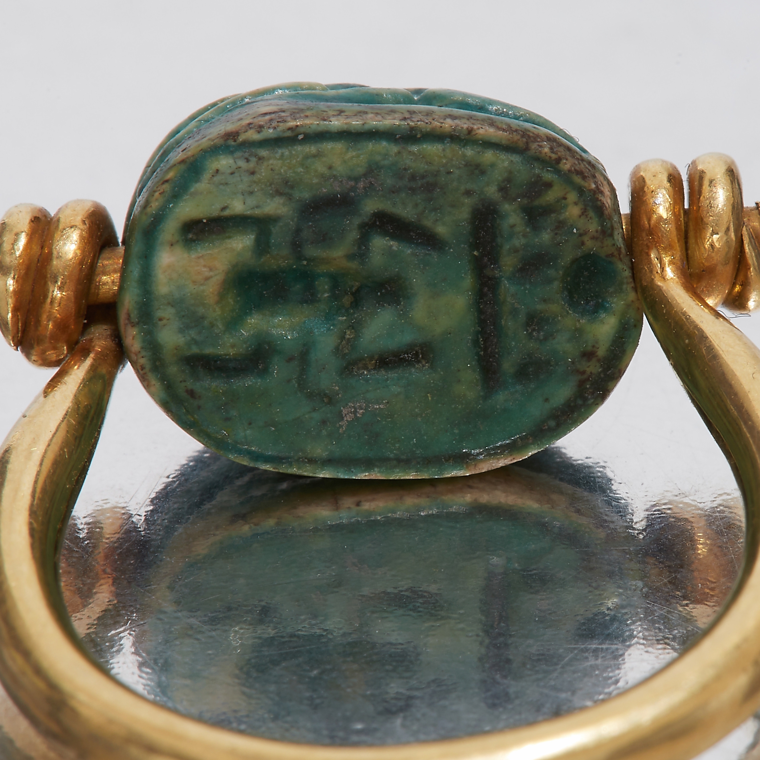 FAIENCE SCARAB SWIVEL RING, in 18 ct. gold. The scarab as a swivel, with carved bottom. Size F. 3.3 grams.