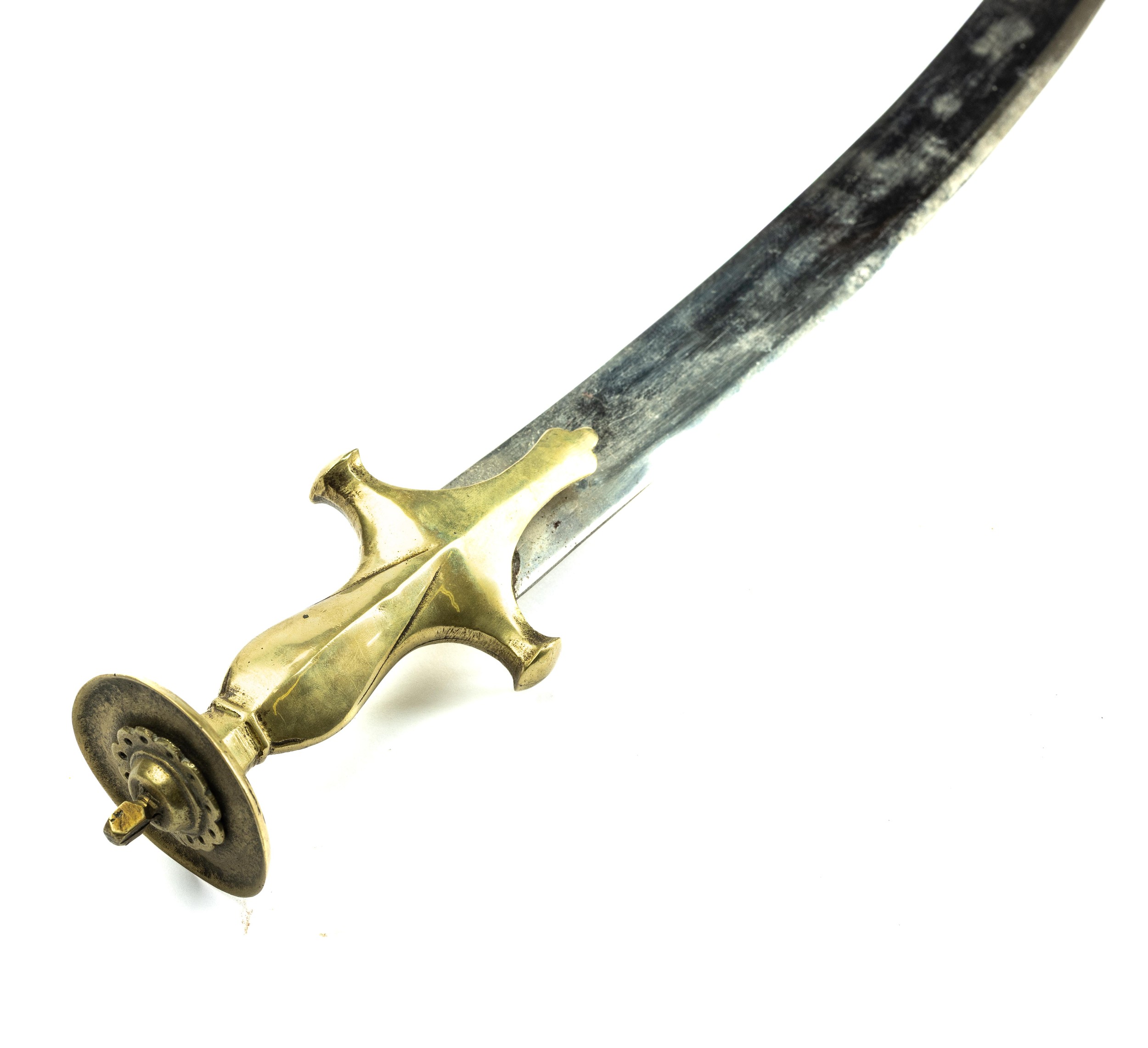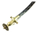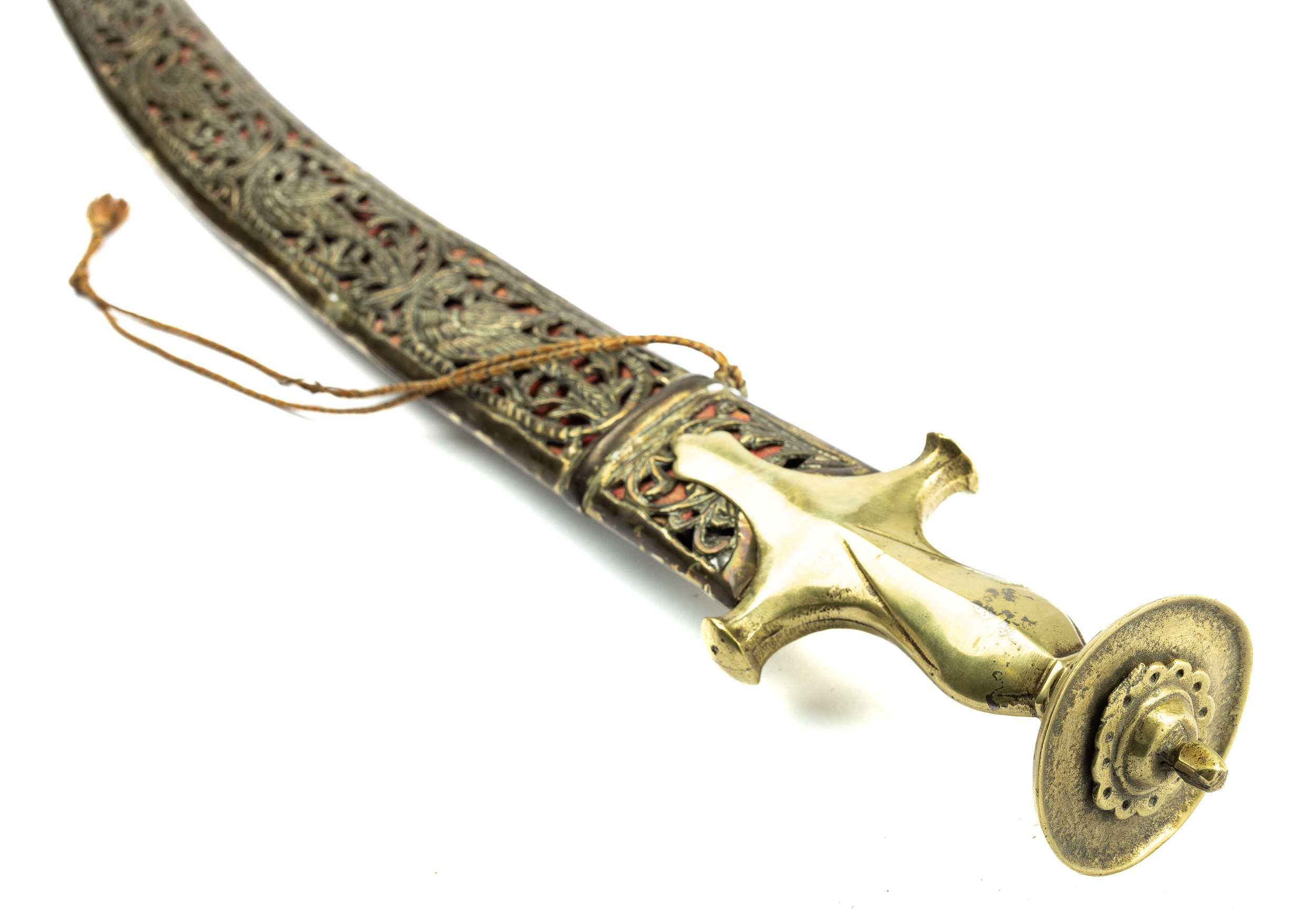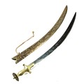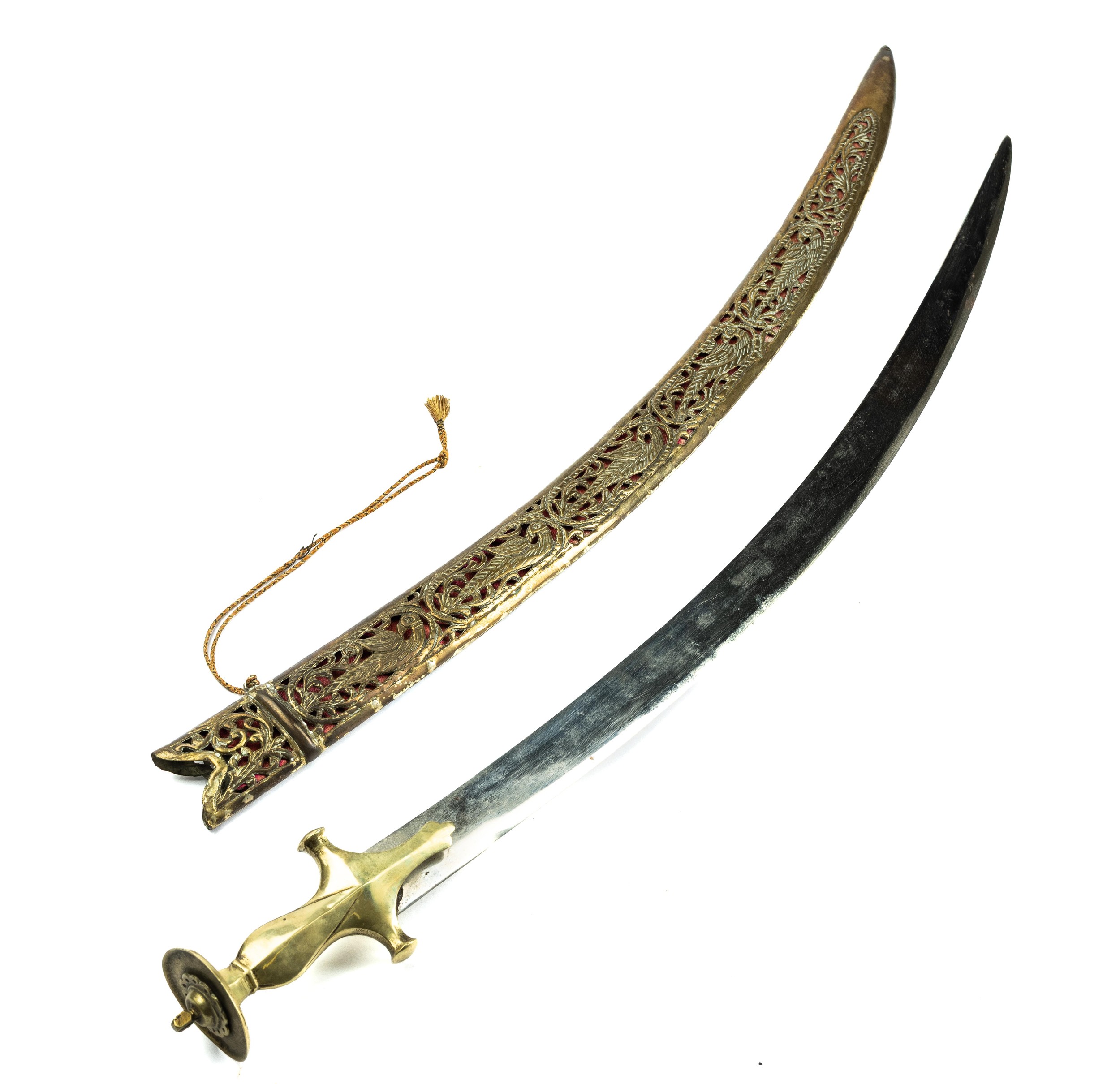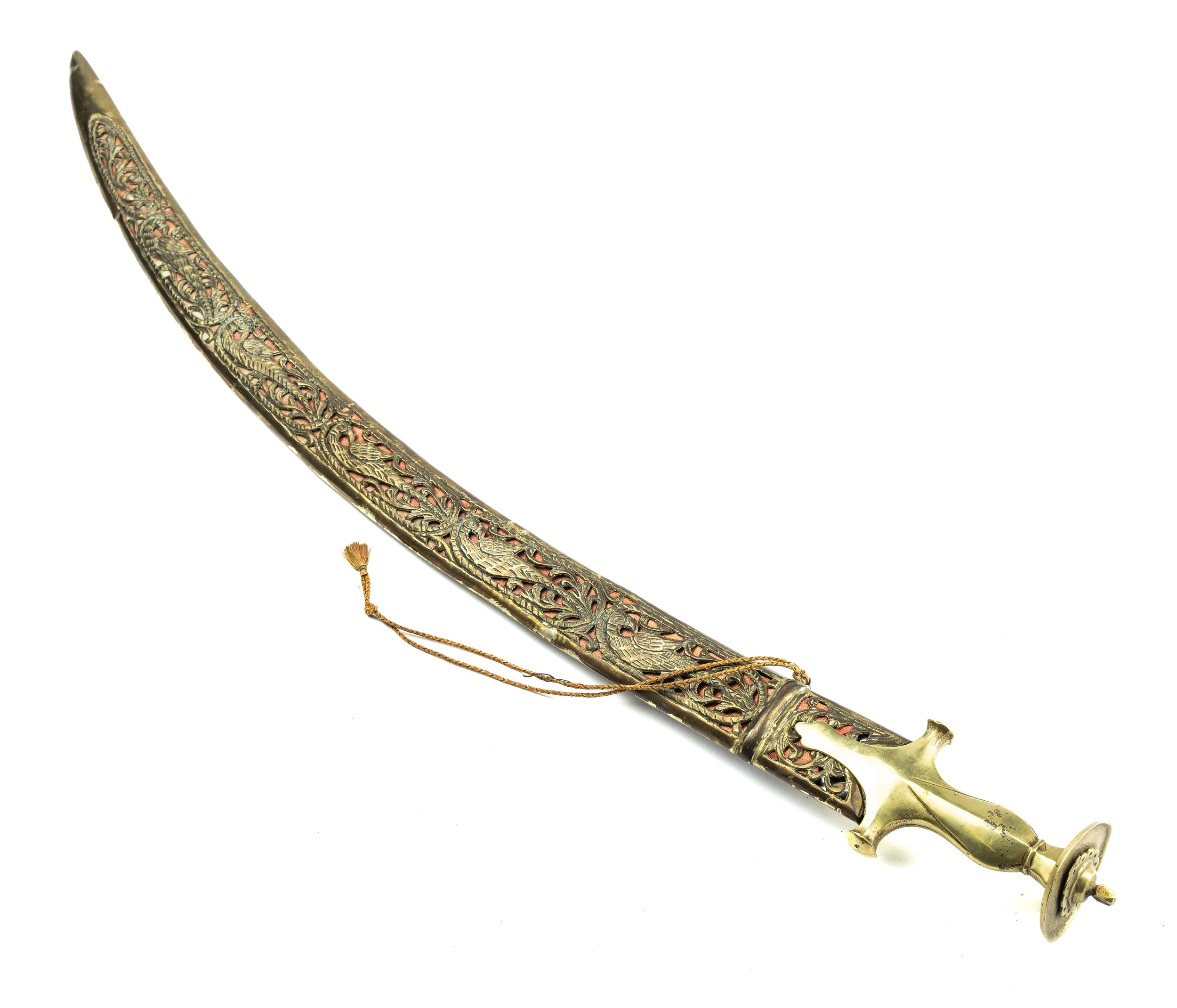Indian ceremonial sword with curved blade, scabbard having bird and foliate detail. Blade length 63cm, overall 78cm.