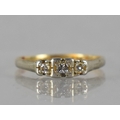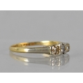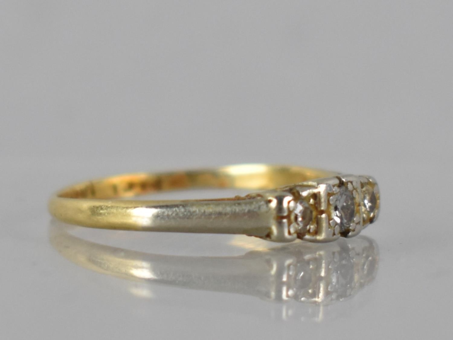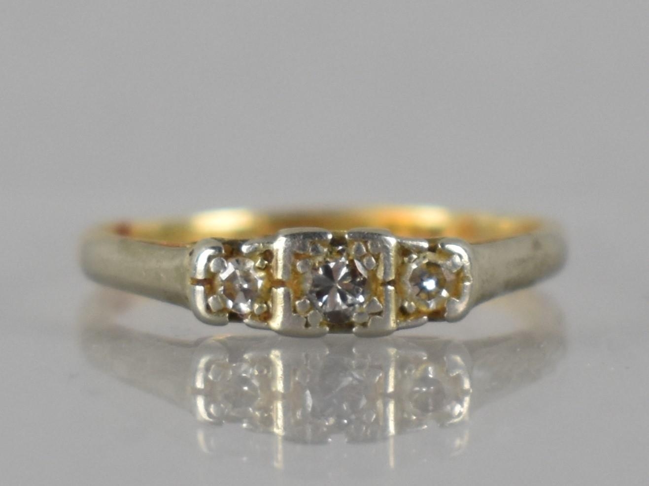An Early 20th Century 18ct Gold, Platinum and Diamond Trilogy Ring, Centre Old Round Cut Diamond 2.5mm Diameter, Grain Set in a Square illusion Mount and Flanked by Two Smaller Diamonds, Similarly Mounted in White Metal and Raised on White Metal Shoulders to a Polished D Shaped Band, Stamped internally PLAT and 18CT, 2gms