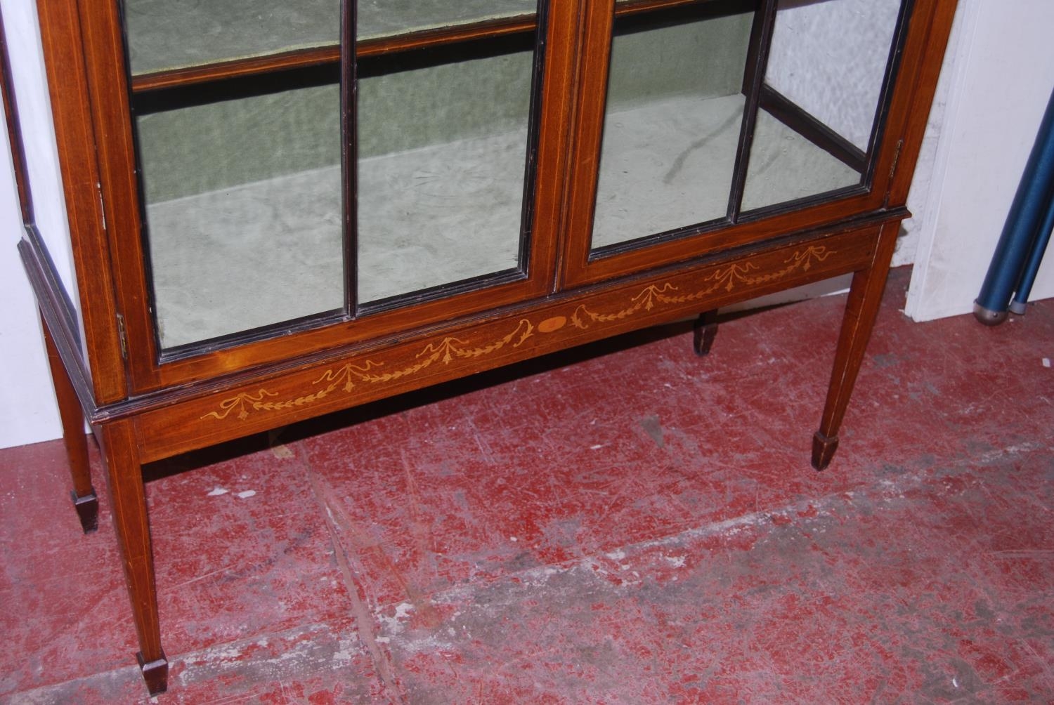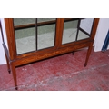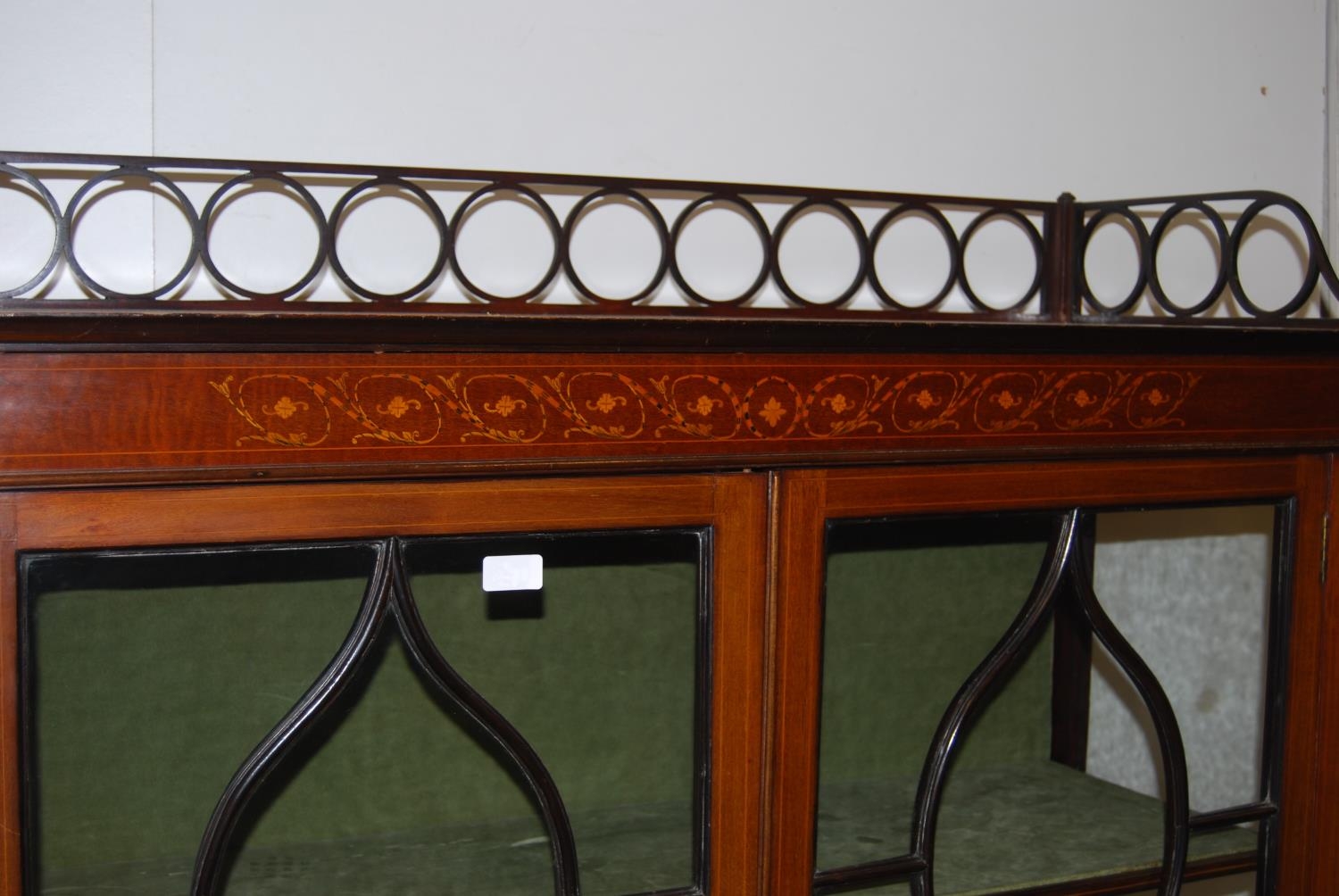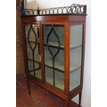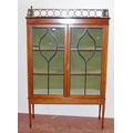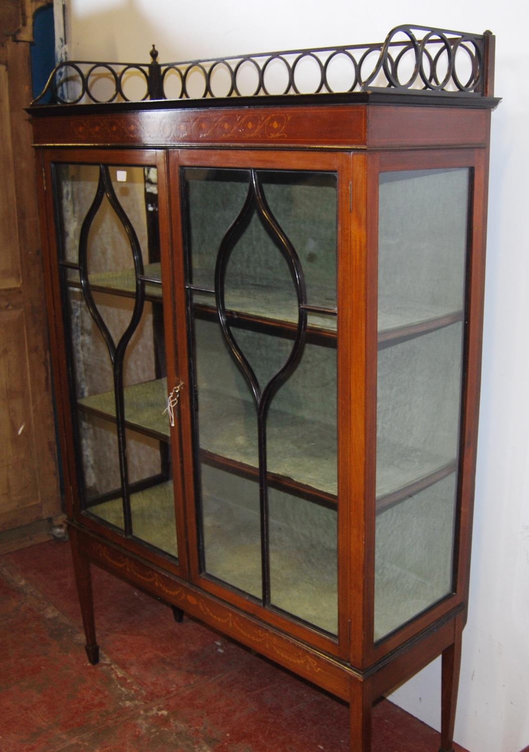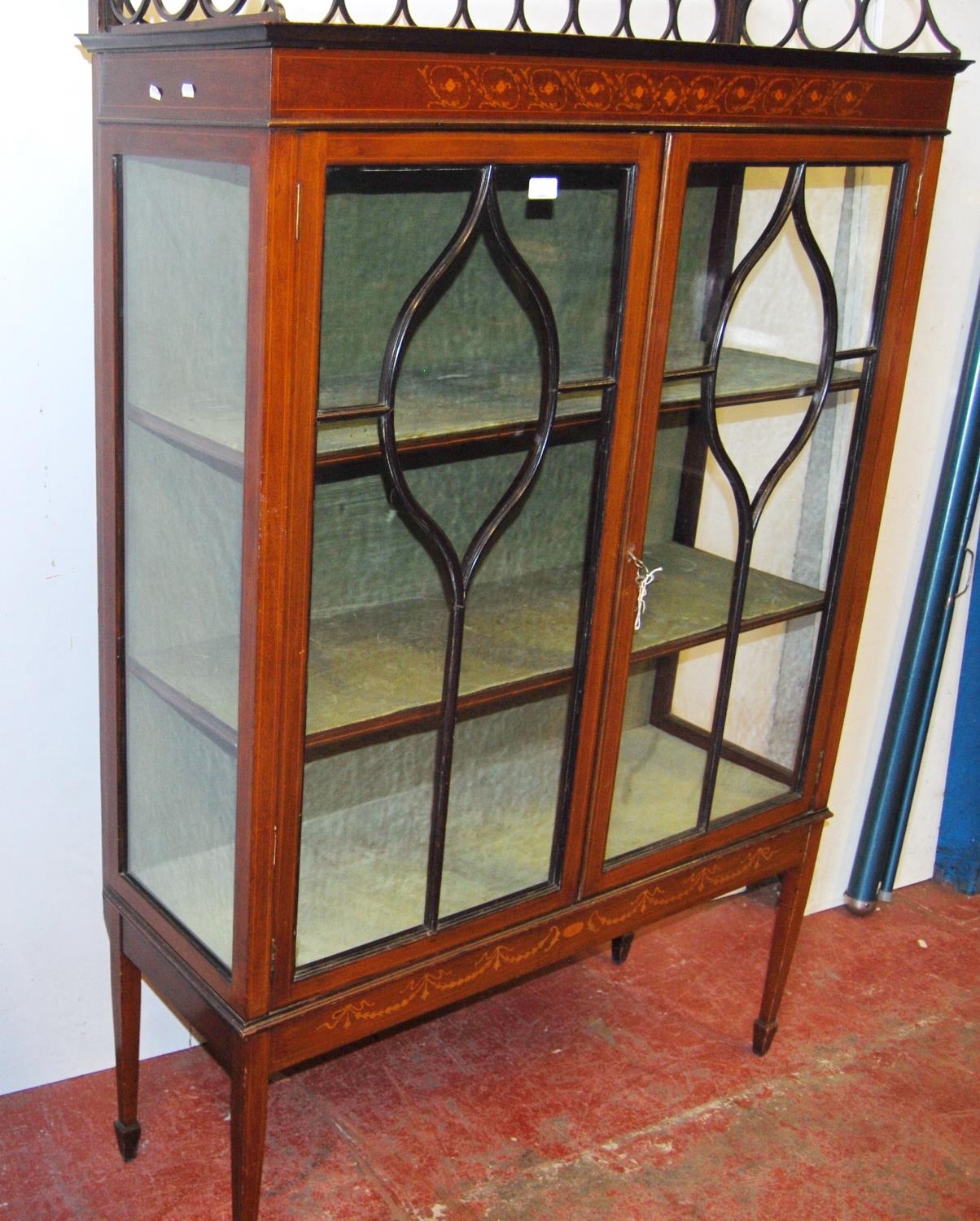 Edwardian inlaid mahogany display cabinet, with a concentric pierced pediment top above an inlaid frieze and two astragal glazed doors enclosing a shelved interior, on tapered supports with spade feet, 173cm high, 111cm wide and 40cm deep.