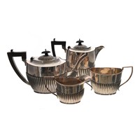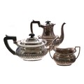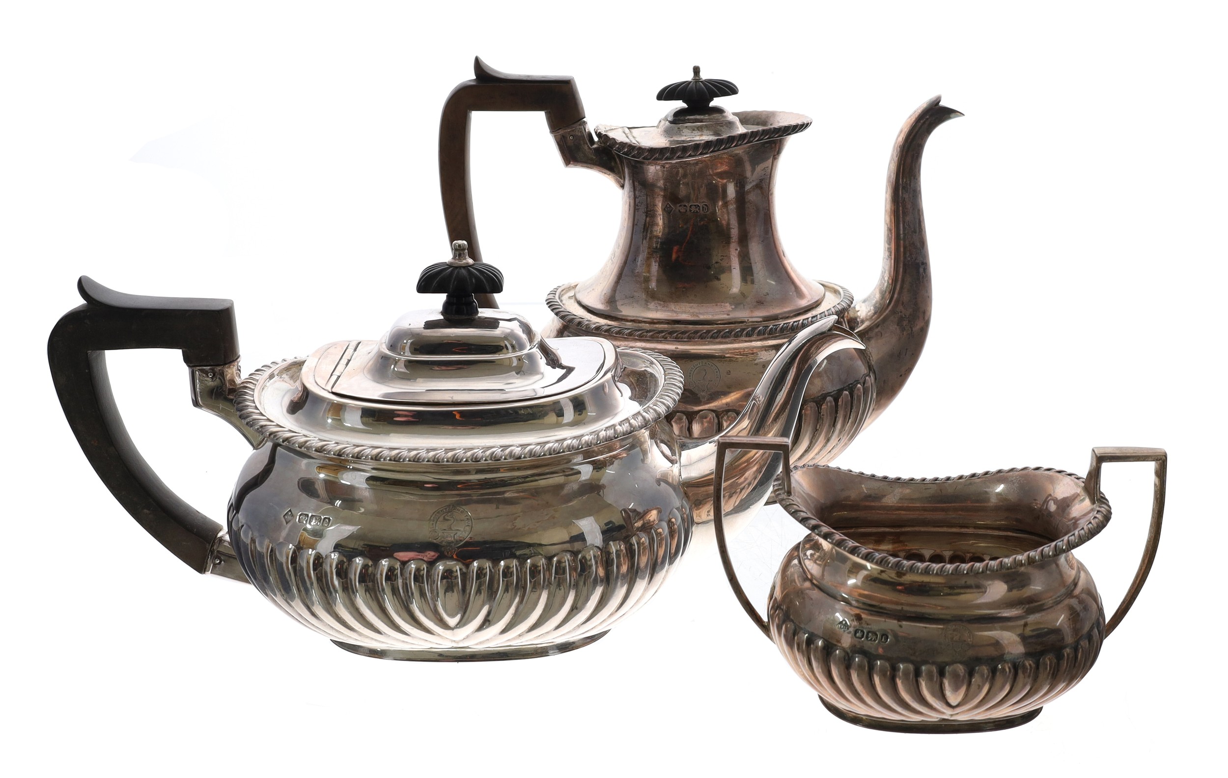 Late Victorian three piece silver tea and coffee service, with half fluted decoration, crest engraved, the pots with ebonised handles, maker Mappin Brothers, Sheffield 1896 and 1897, length of teapot 11", total weight approximately 1550gm (3)