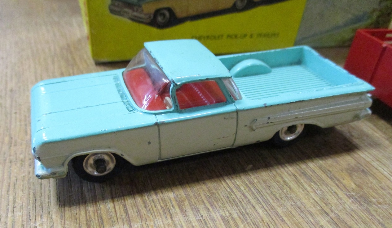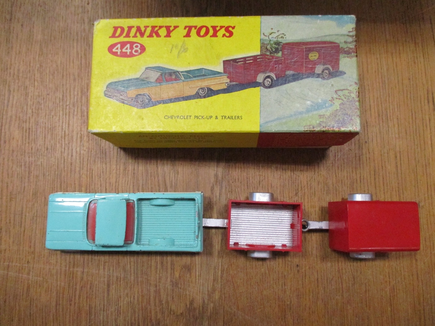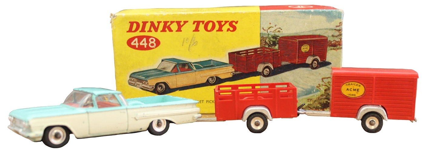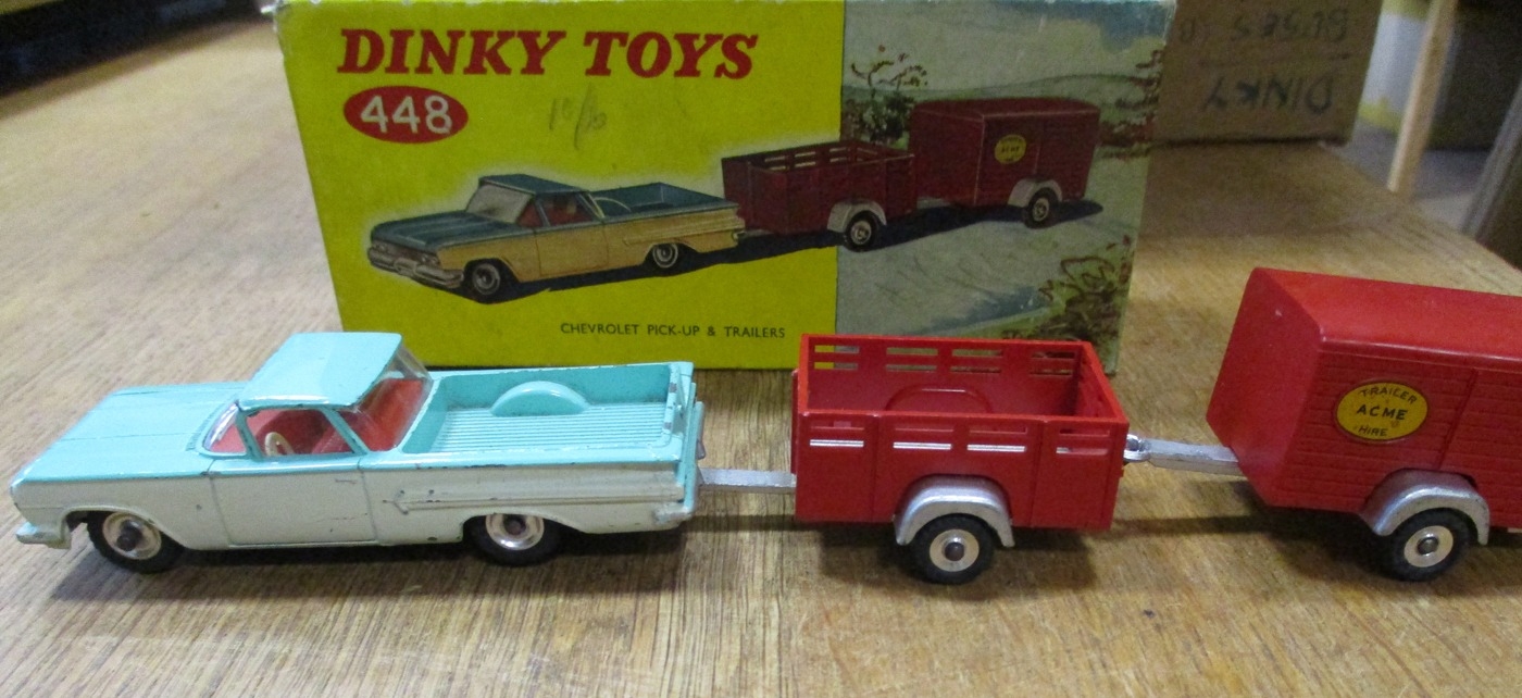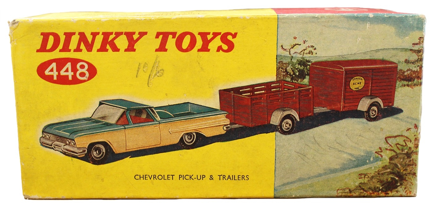 Dinky. Chevrolet Pickup & Trailers, off-white and turquoise body, red interior, No. 448, somewhat play-worn, otherwise good in good box. (T)